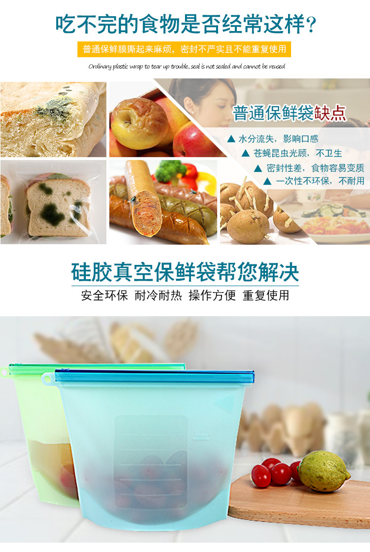 【产品名称】:食品硅胶保鲜袋 硅胶食品自封袋 分类食品收纳袋 冰箱密封袋,硅胶真空密封袋 食品袋 食品冷冻收纳袋 冰箱食物水果硅胶保袋 (2个尺寸)