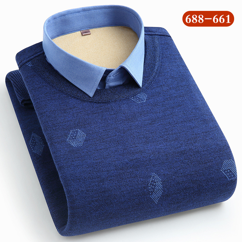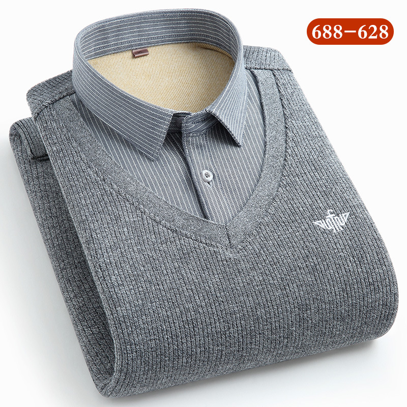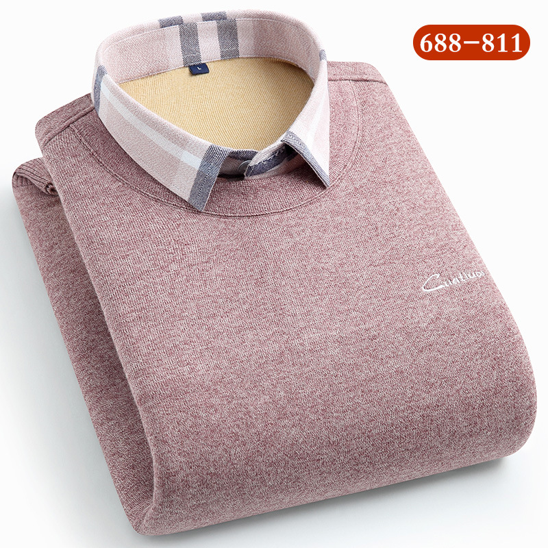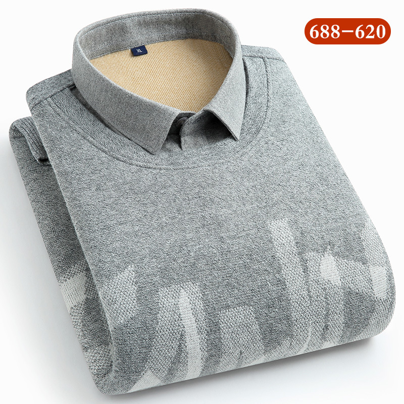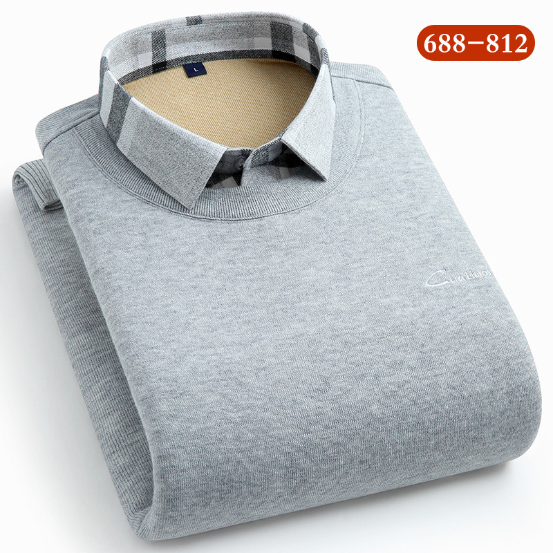 高品质冬季新款男士长袖衬衫加绒加厚保暖衬衣打底衫假两件针织衫