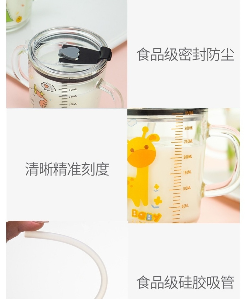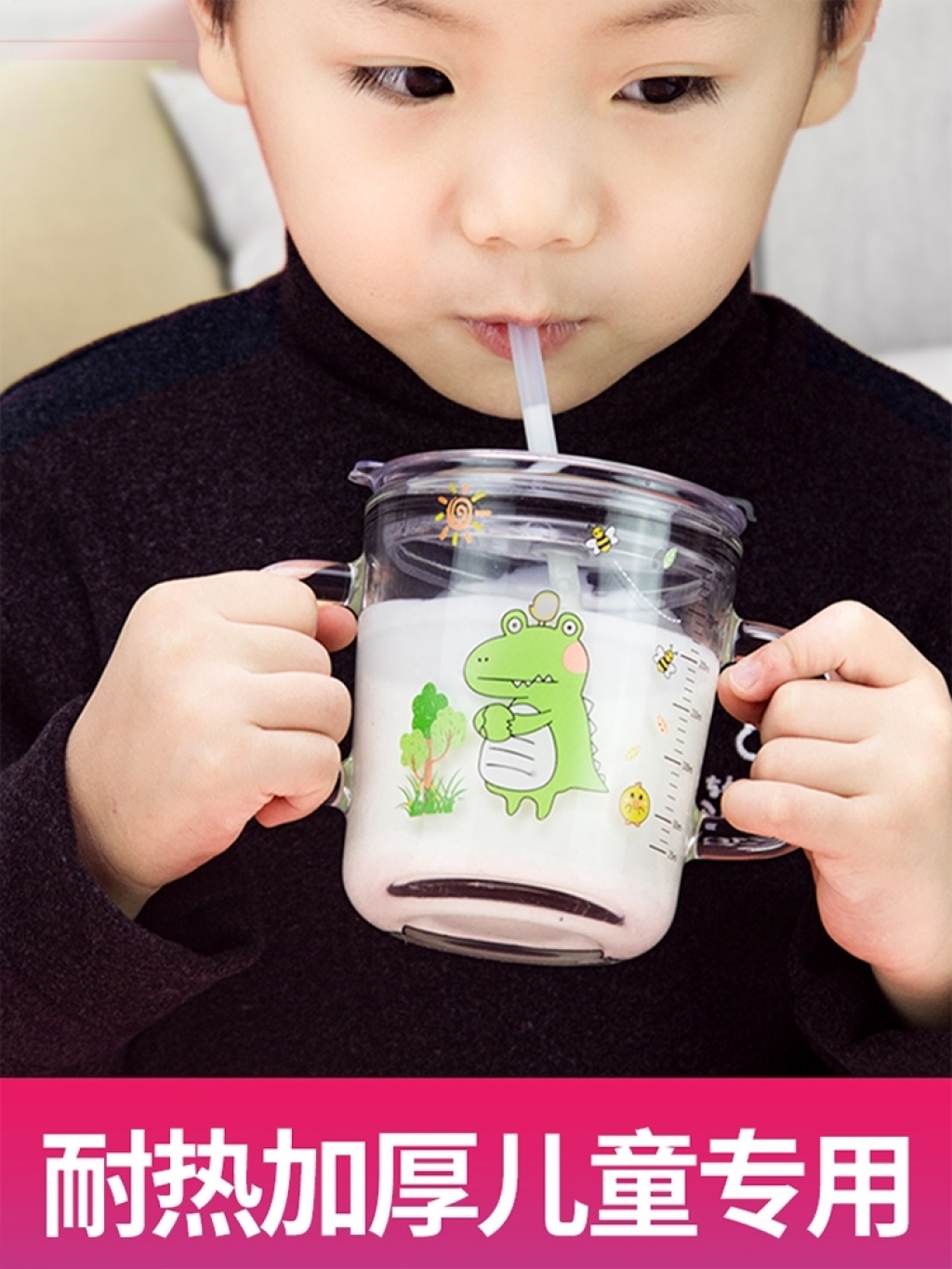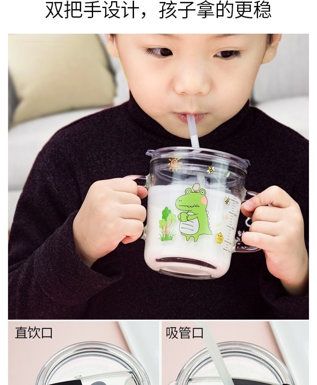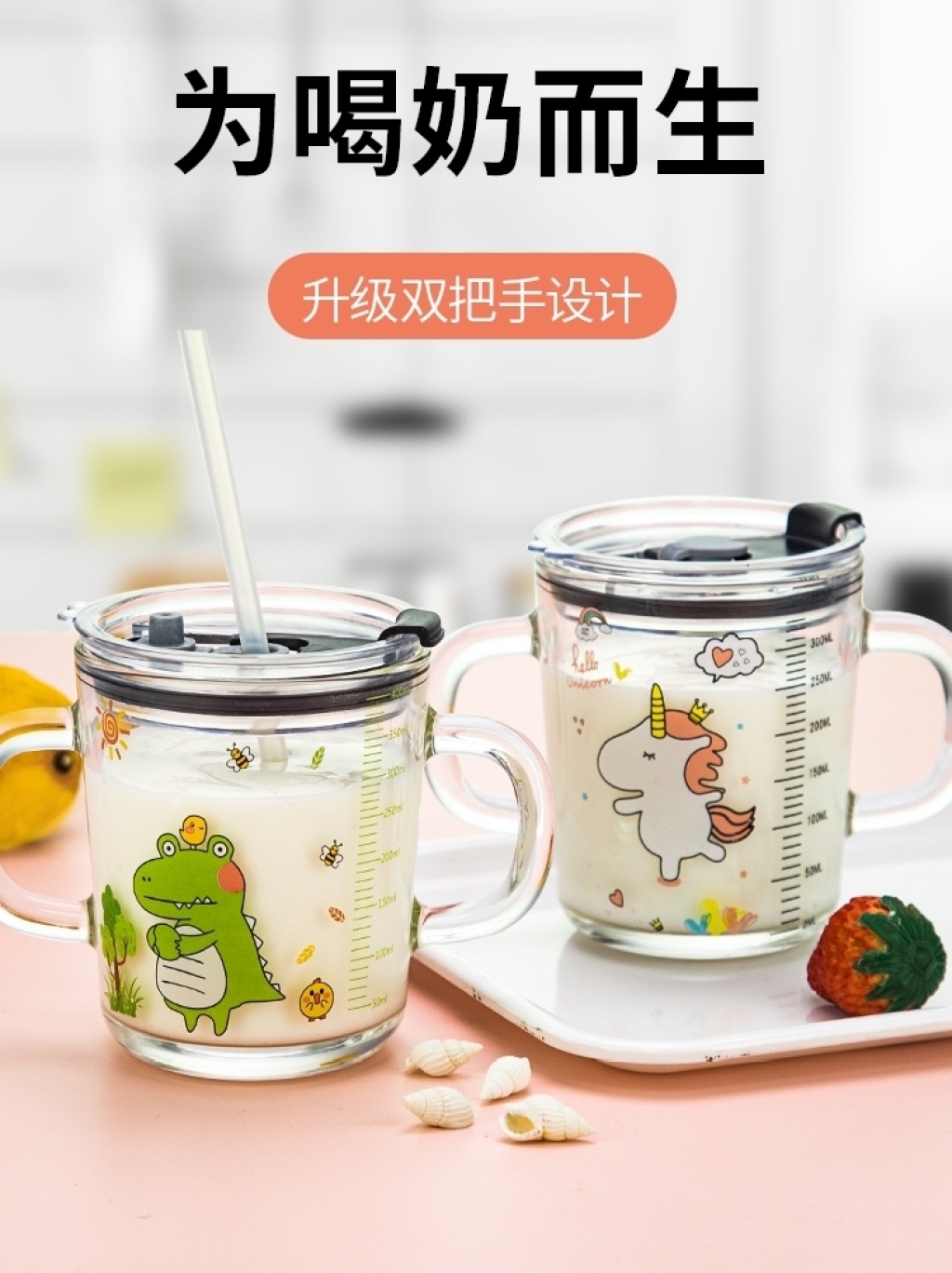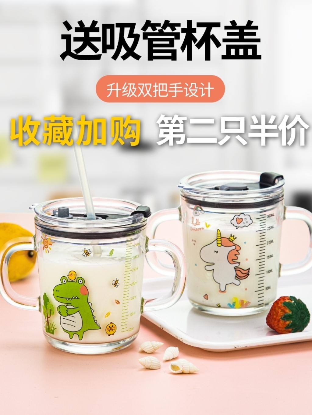 儿童水杯家用简约清新森系可爱少女泡茶杯玻璃杯子带盖吸管刻度杯