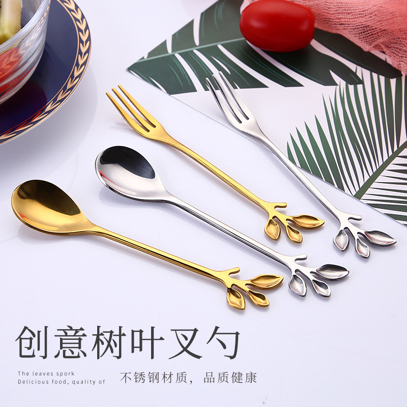 不锈钢咖啡勺搅拌勺创意树枝树叶勺子不锈钢叉子甜品叉甜品勺