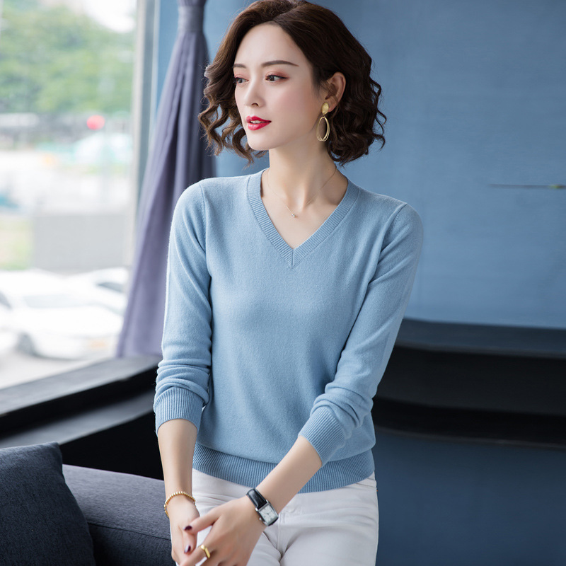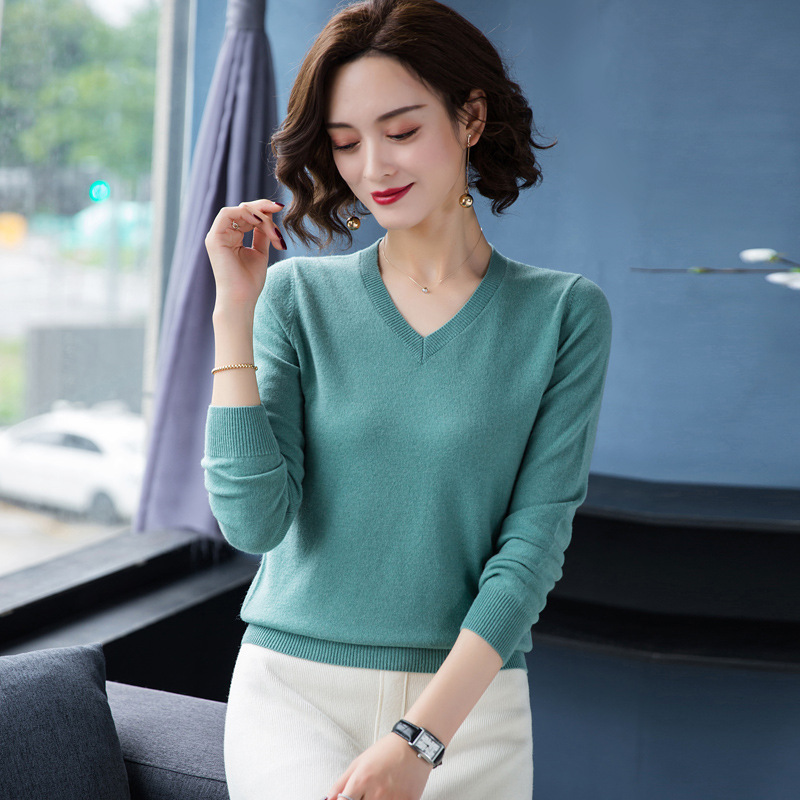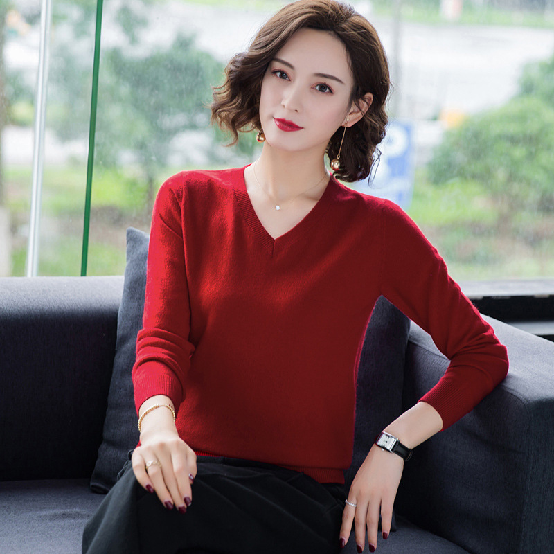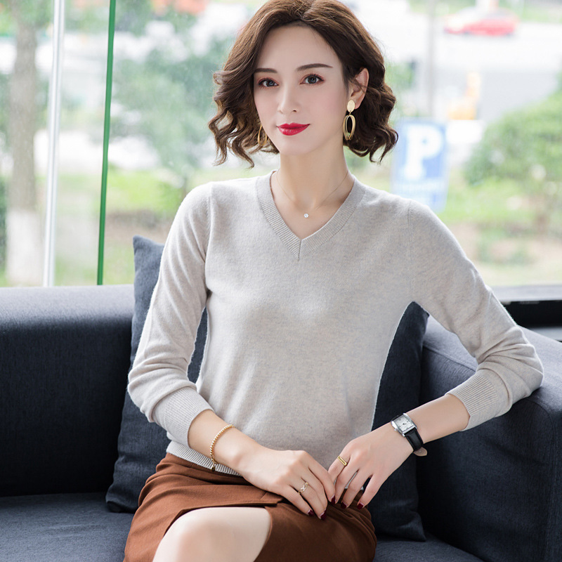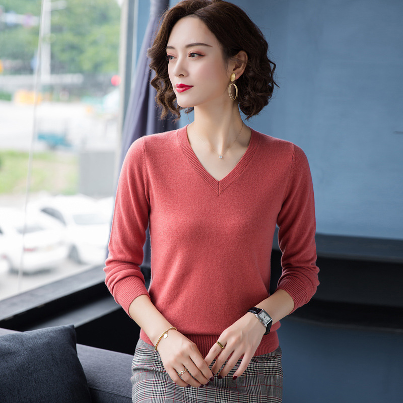 2020秋季新款宽松V领全羊毛衫女士套头百搭针织打底衫休闲毛衣