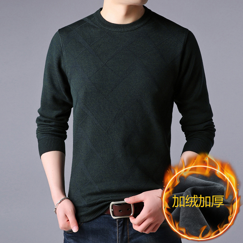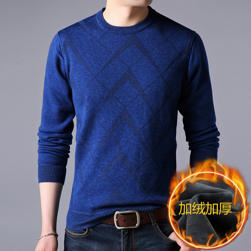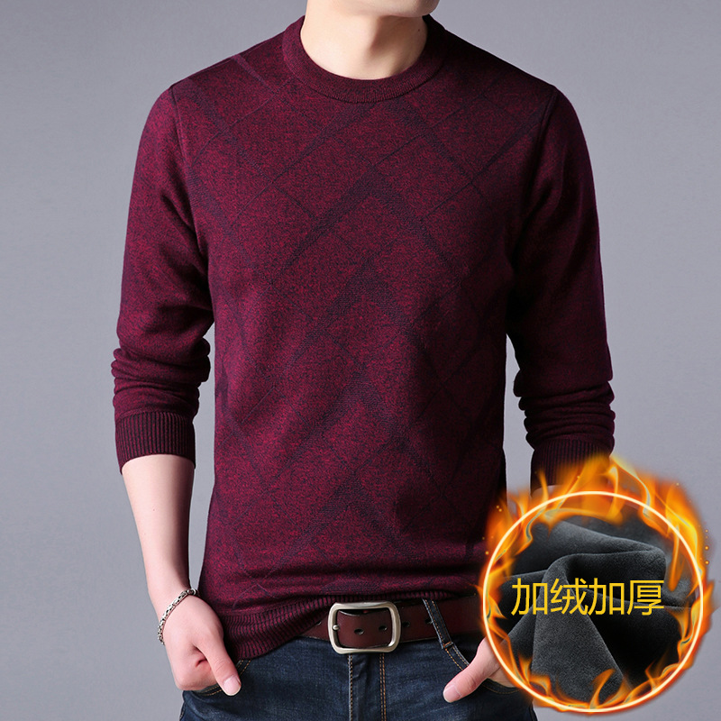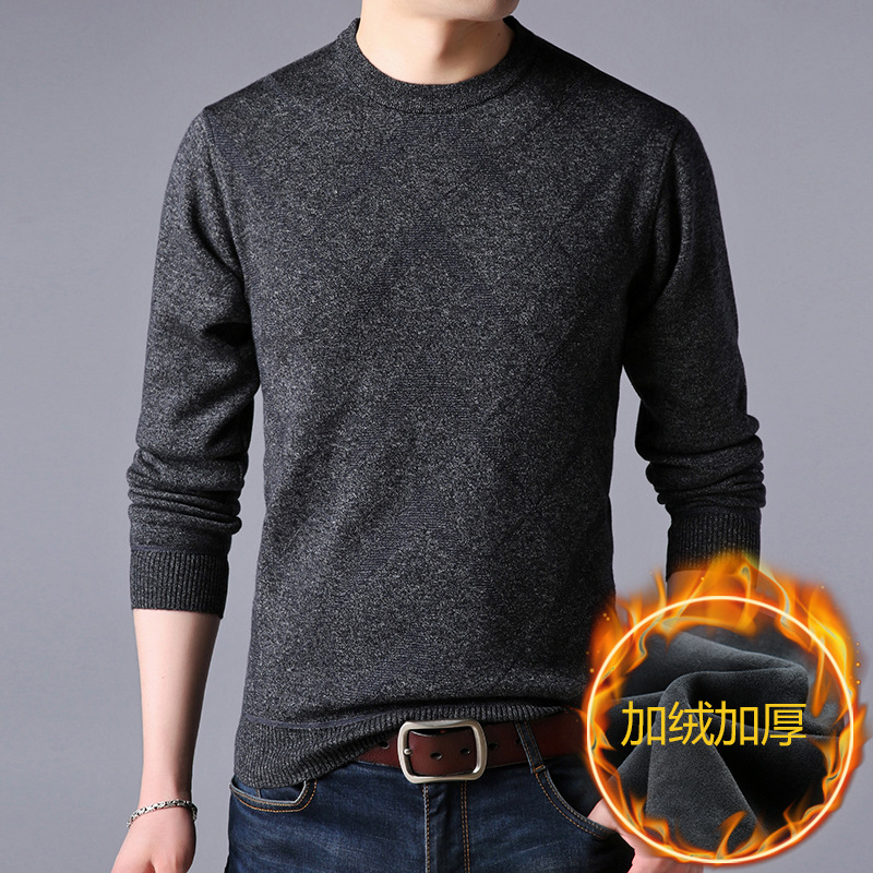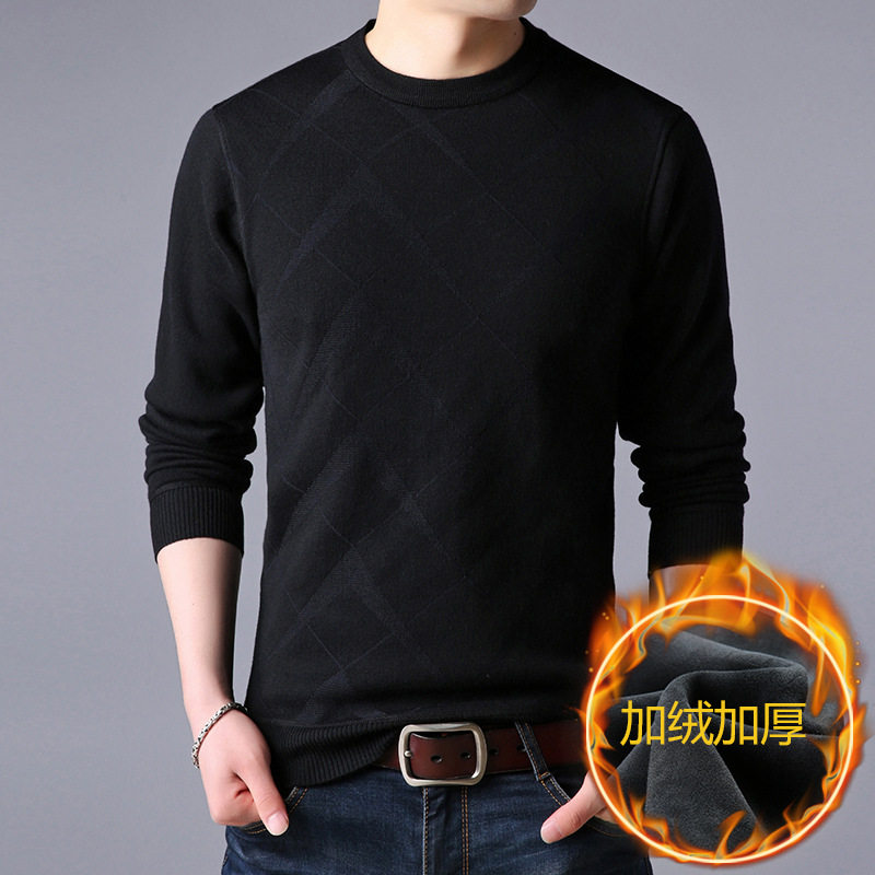 2020冬季男士套头加绒保暖条纹针织衫 男式圆领加厚毛衣T恤男装