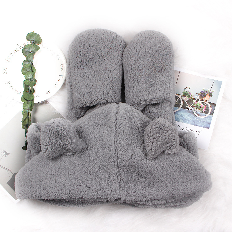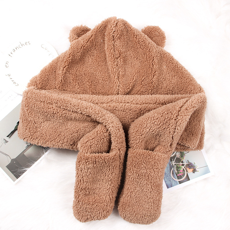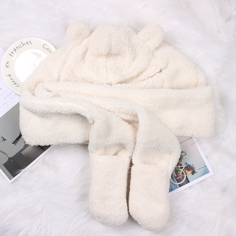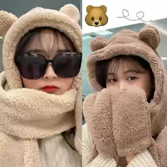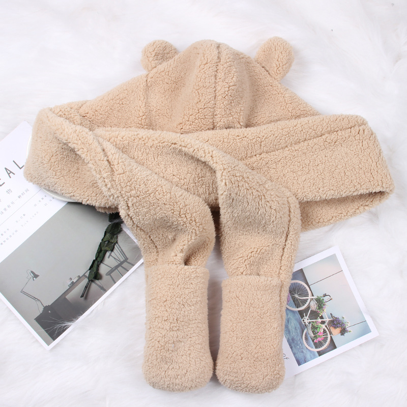 冬季小熊帽子三件套女士可爱百搭羊羔绒加厚保暖帽子围巾手套一体