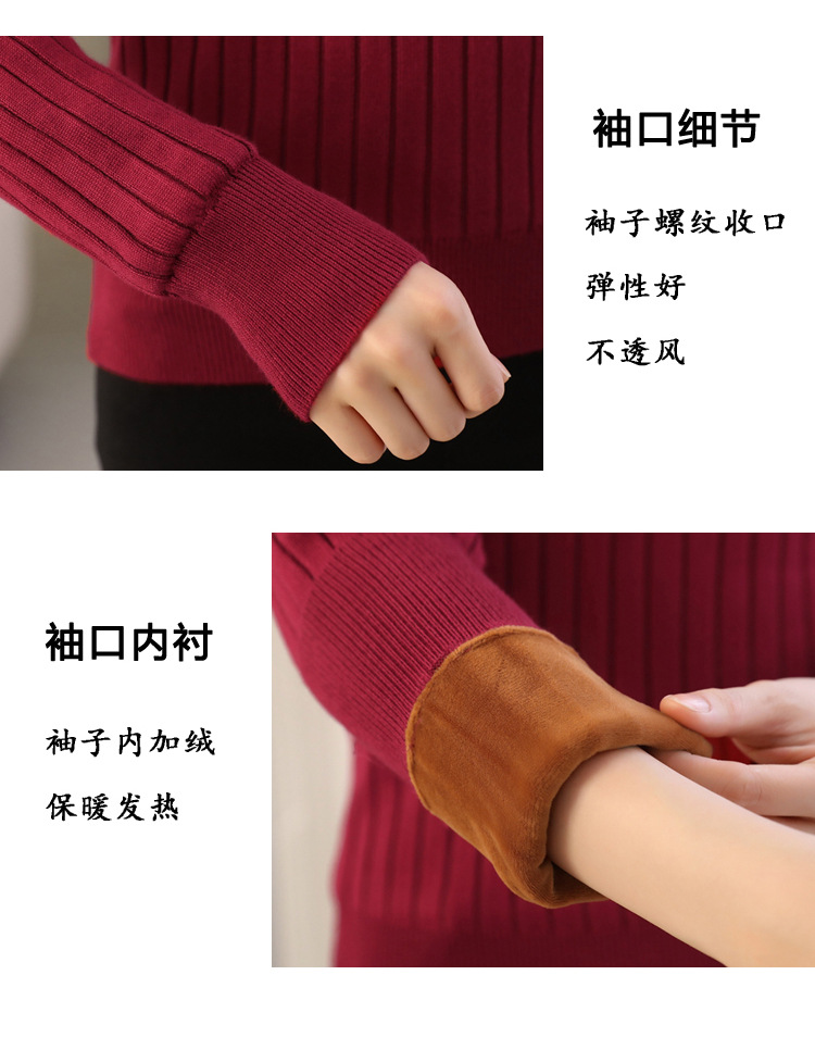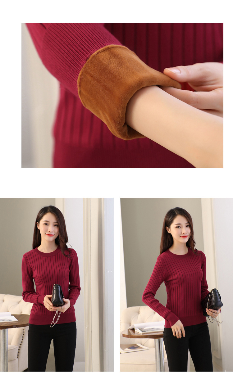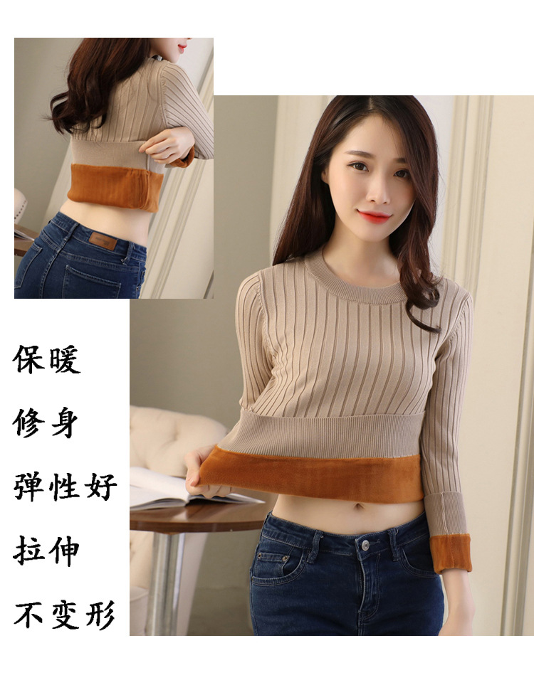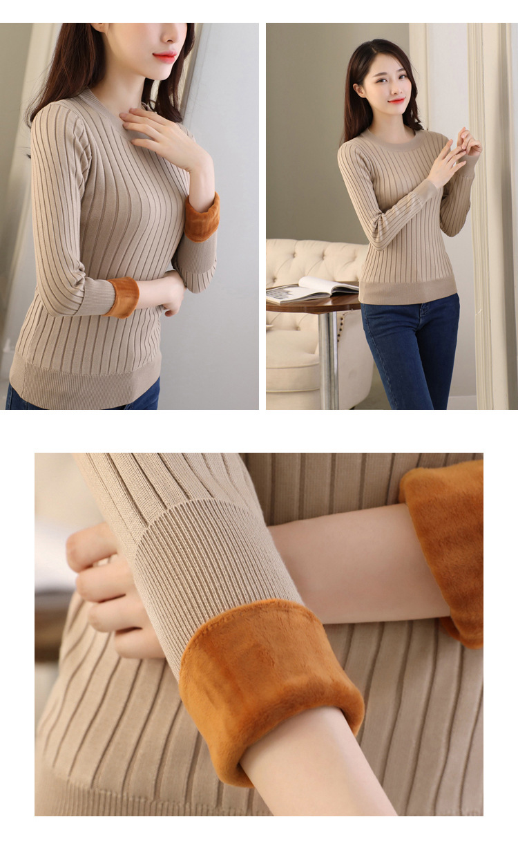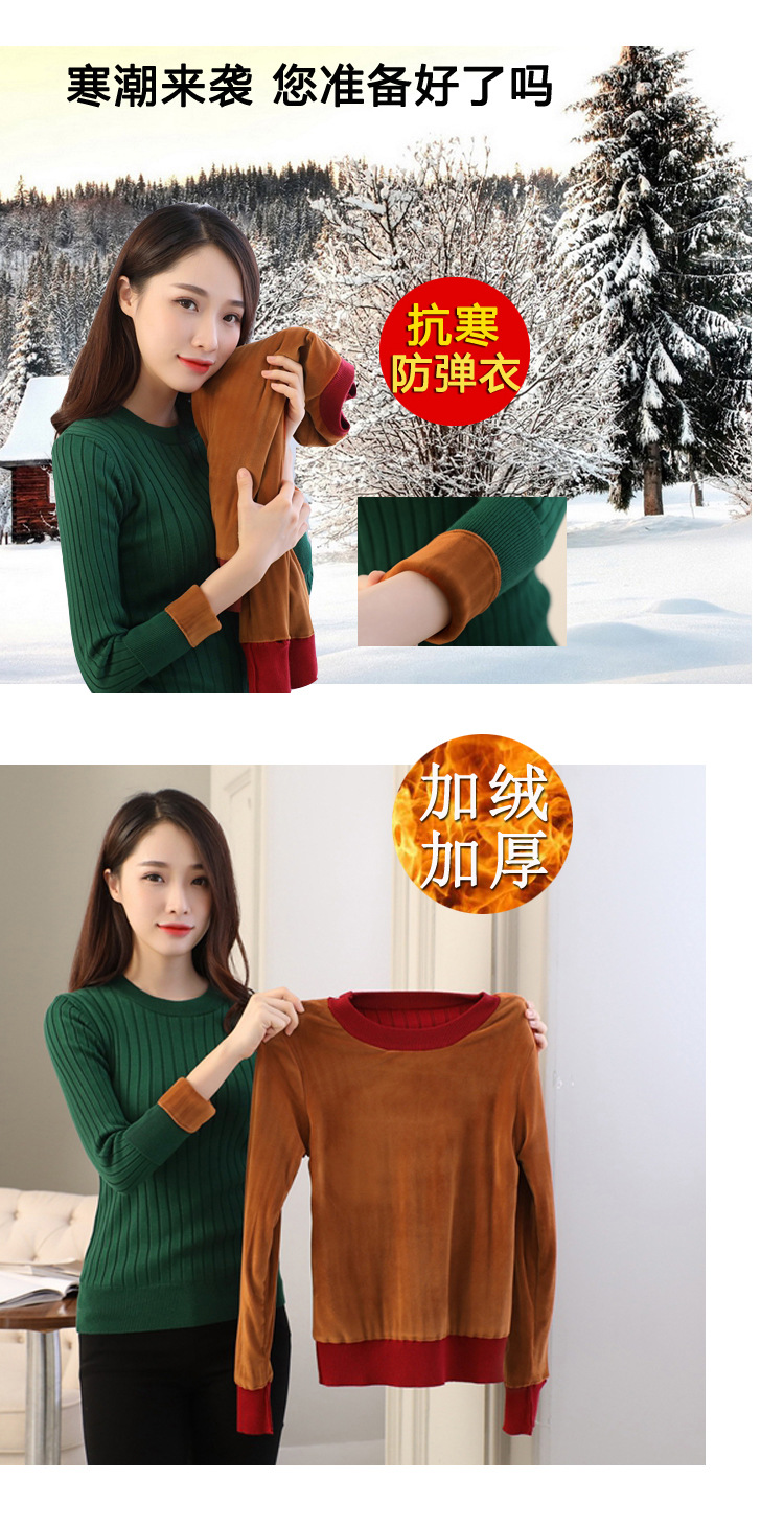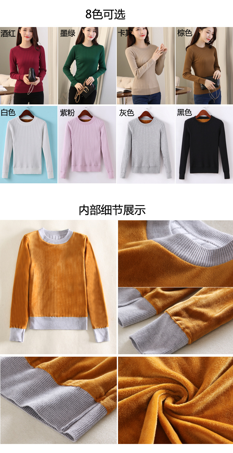 加绒长袖毛衣女秋冬加厚百搭圆领打底衫保暖衣服套头修身针织衫