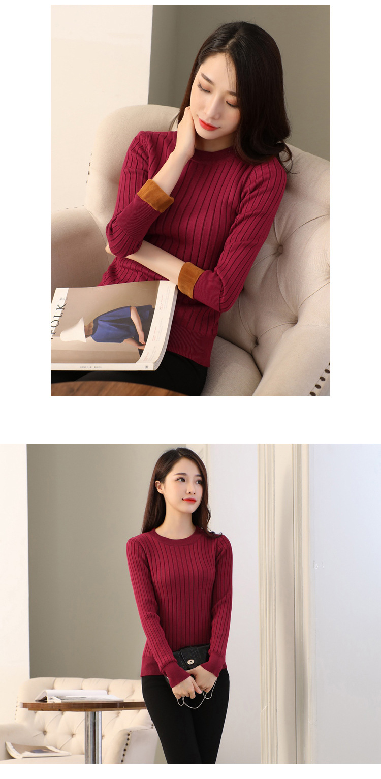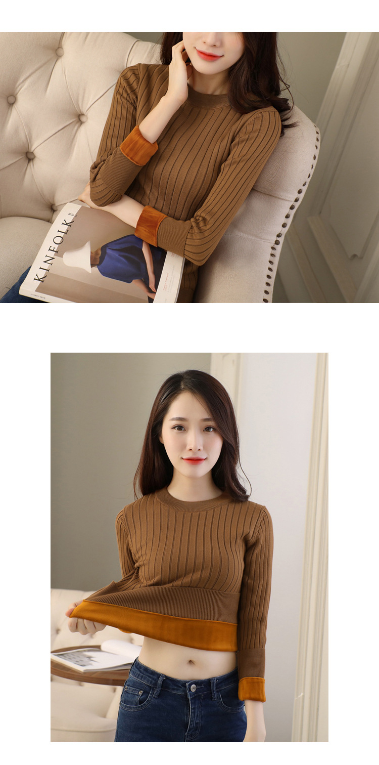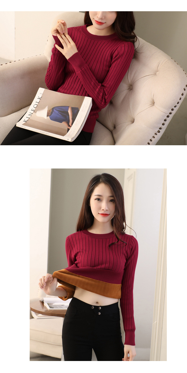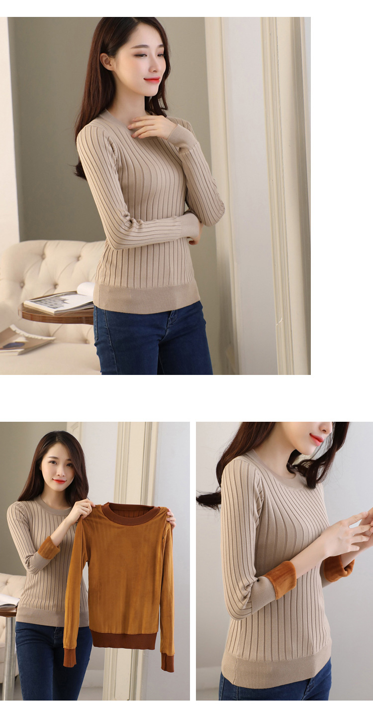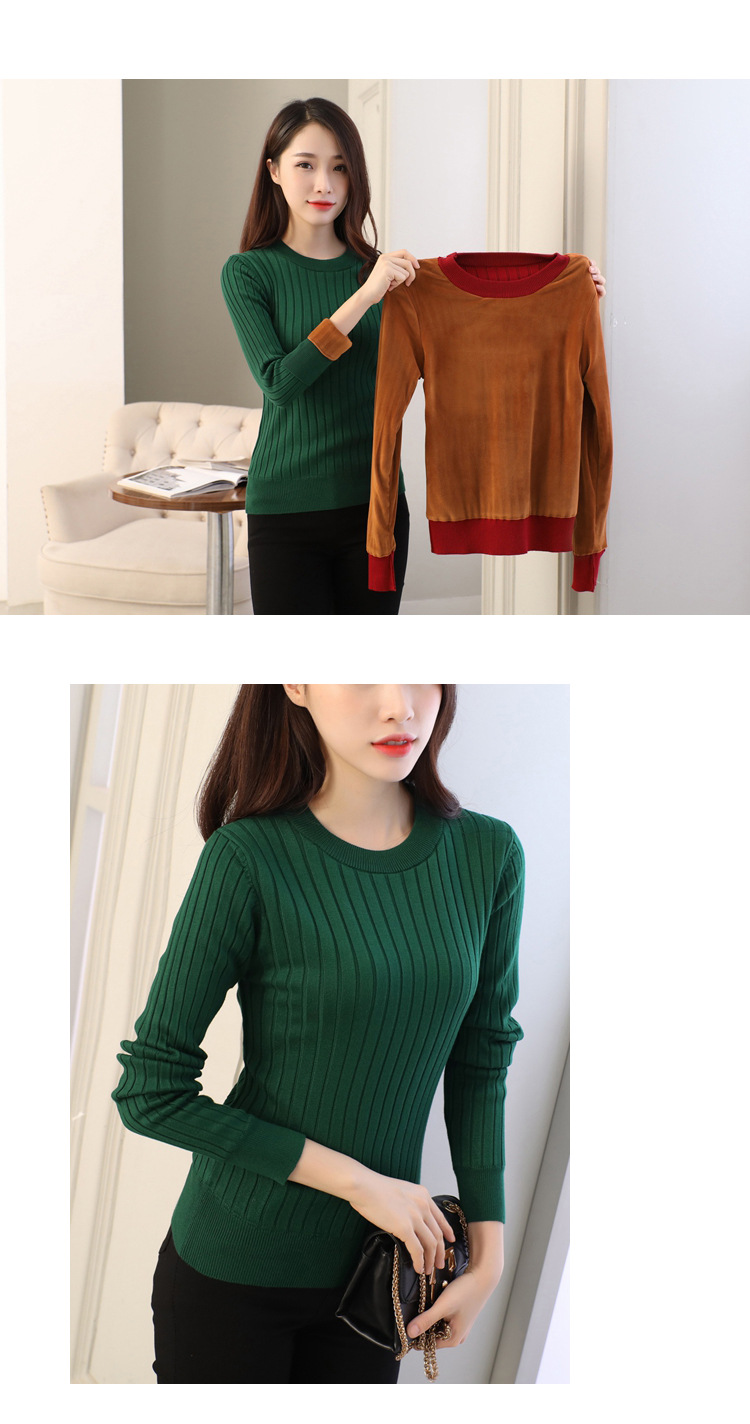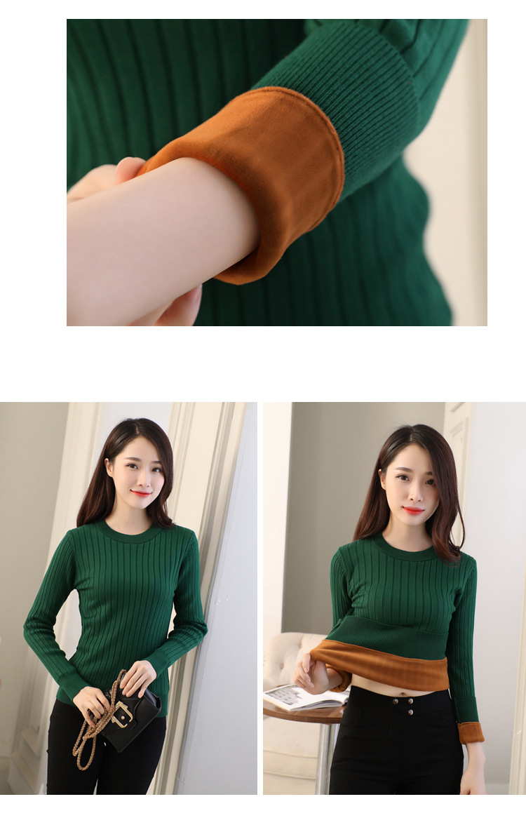 加绒长袖毛衣女秋冬加厚百搭圆领打底衫保暖衣服套头修身针织衫