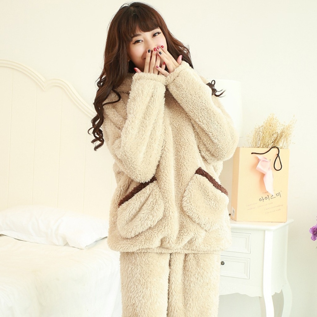 秋冬卡通长毛绒连帽狗熊保暖睡衣珊瑚绒女加厚加绒家居服外单批发