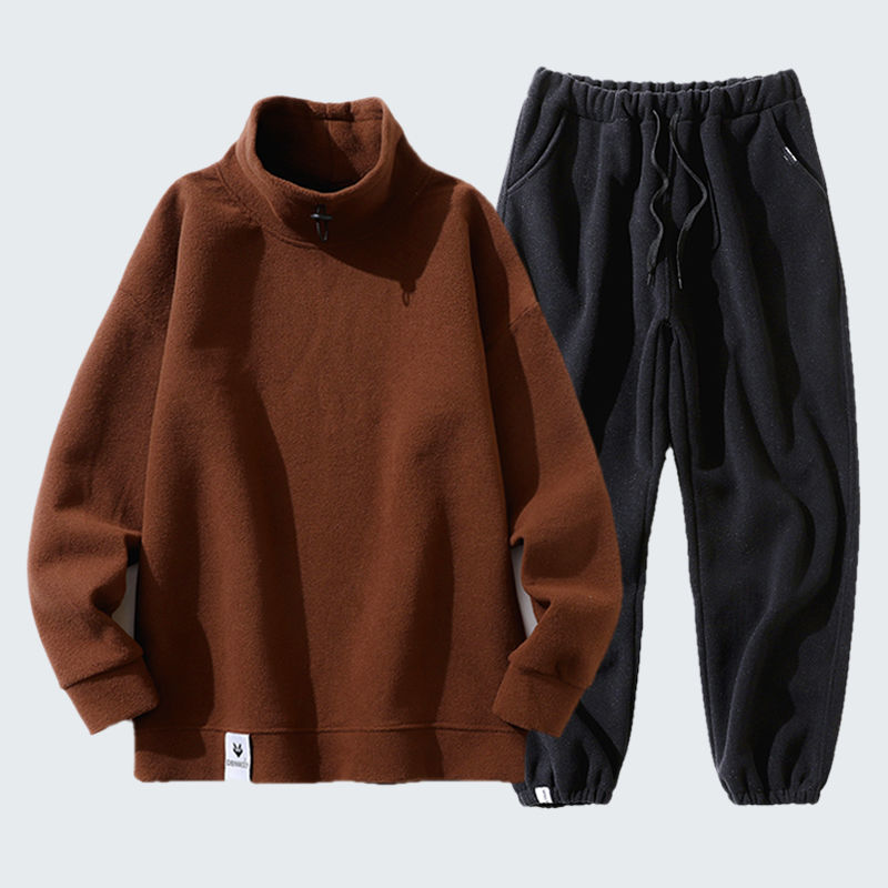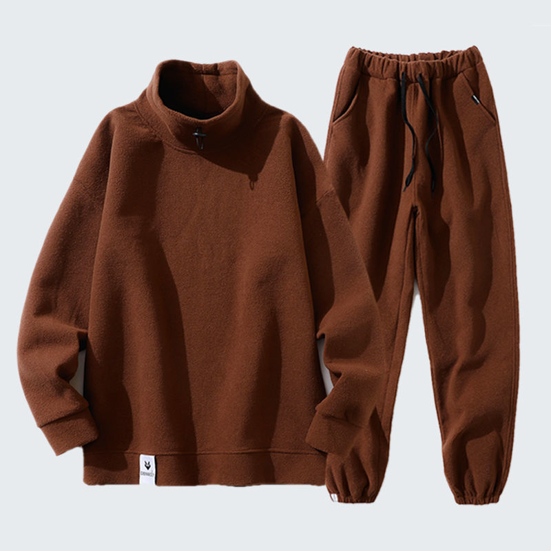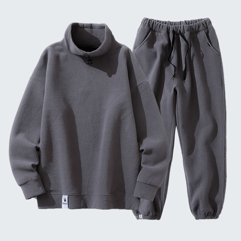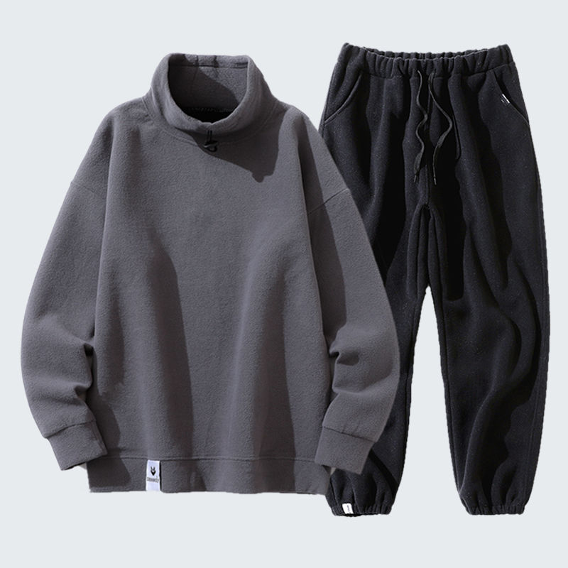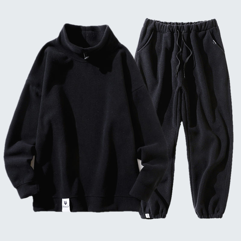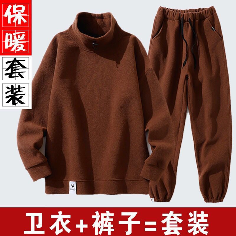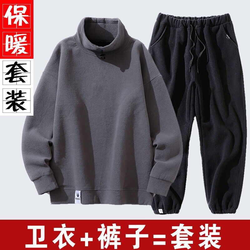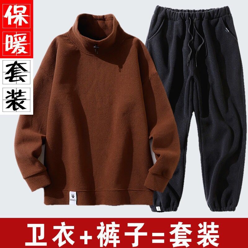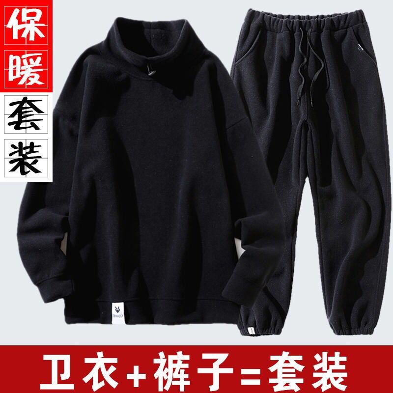 秋冬套装男韩版潮流加绒半高领卫衣摇粒绒休闲套装男装冬装长裤男
