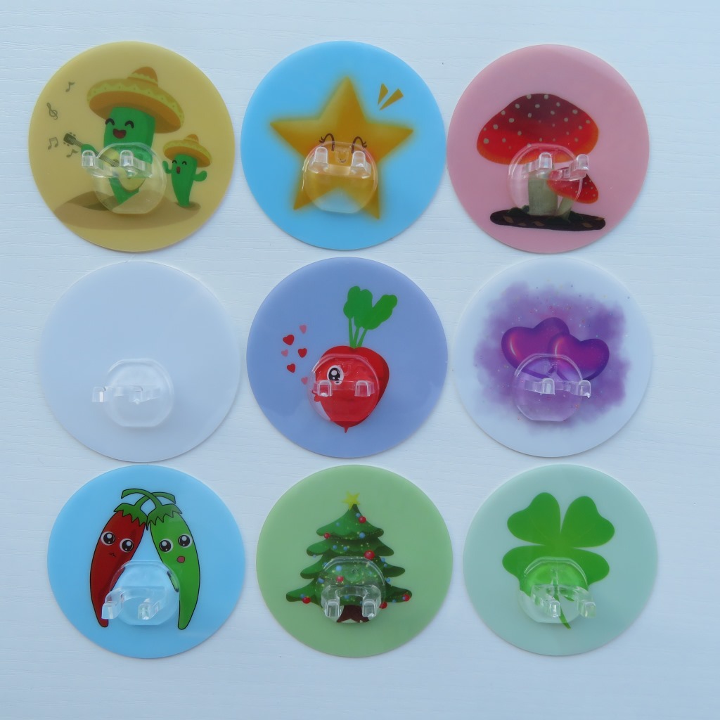 品名:6.5厘米圆可移胶图案插头挂钩 款式:圆形,创意图案 颜色:混色 重量:约3.7克 装箱数:2000个一箱 尺寸:6,5厘米 承重:约15斤左右 |