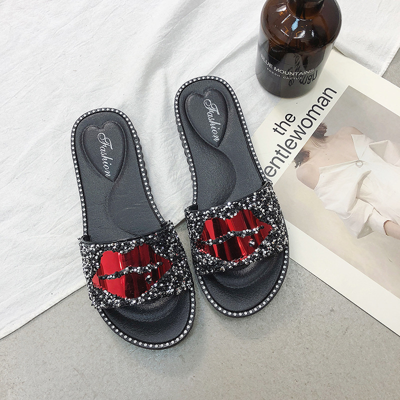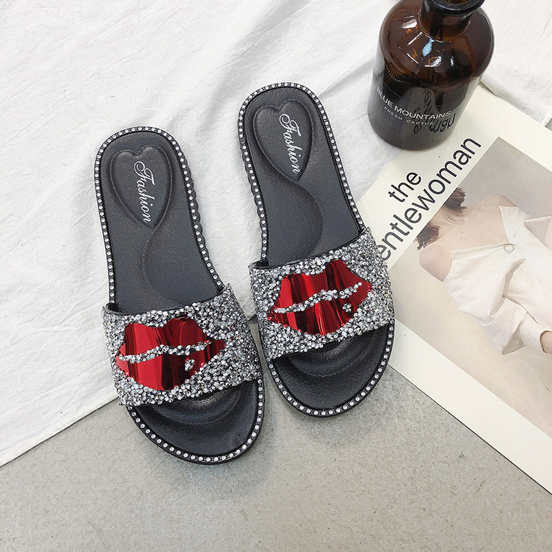 网店代理韩版平跟一字型PVC唇印拖鞋女lazada跨境代发