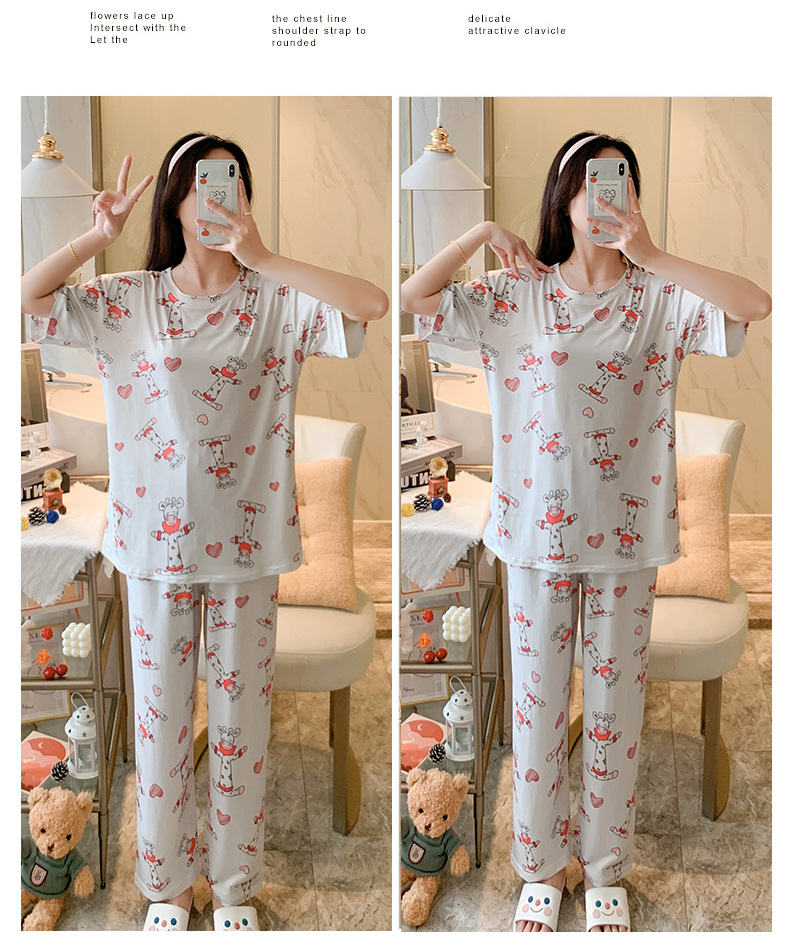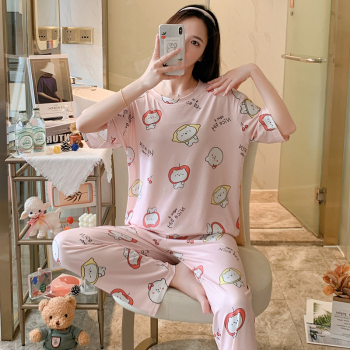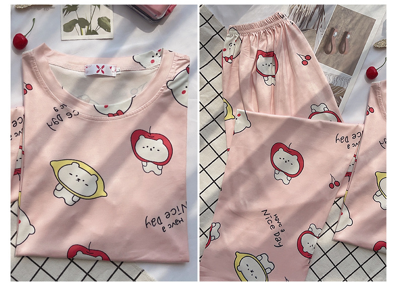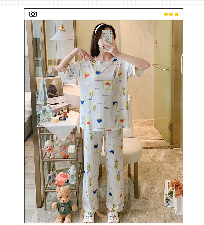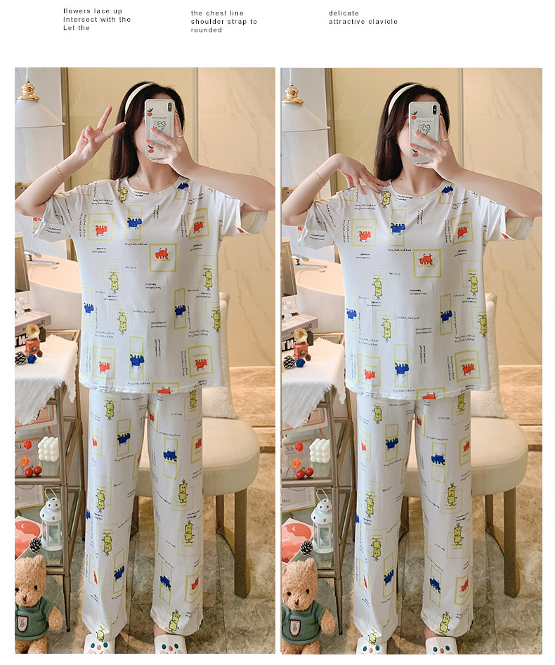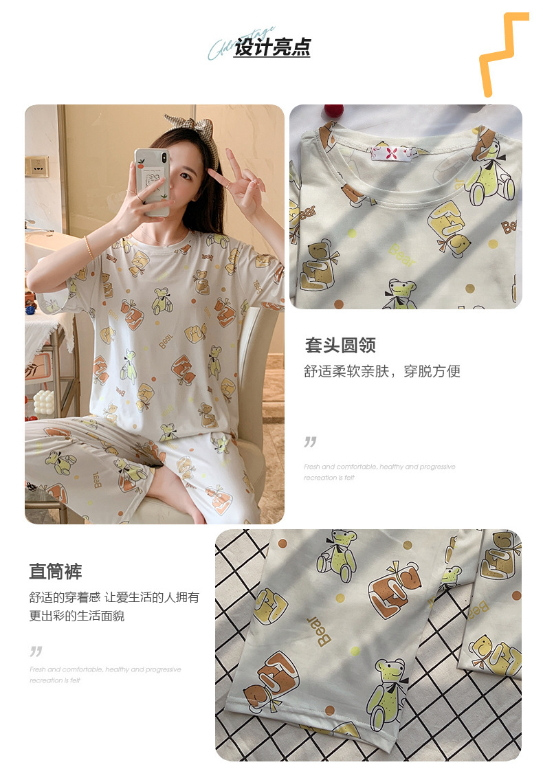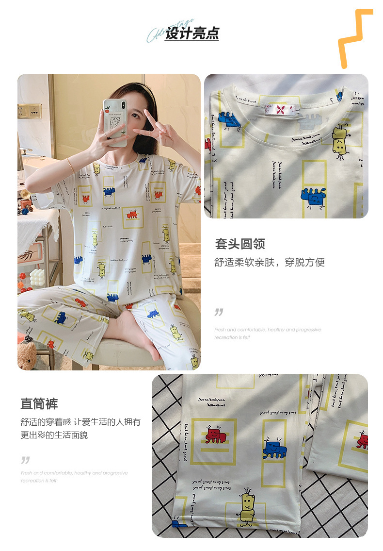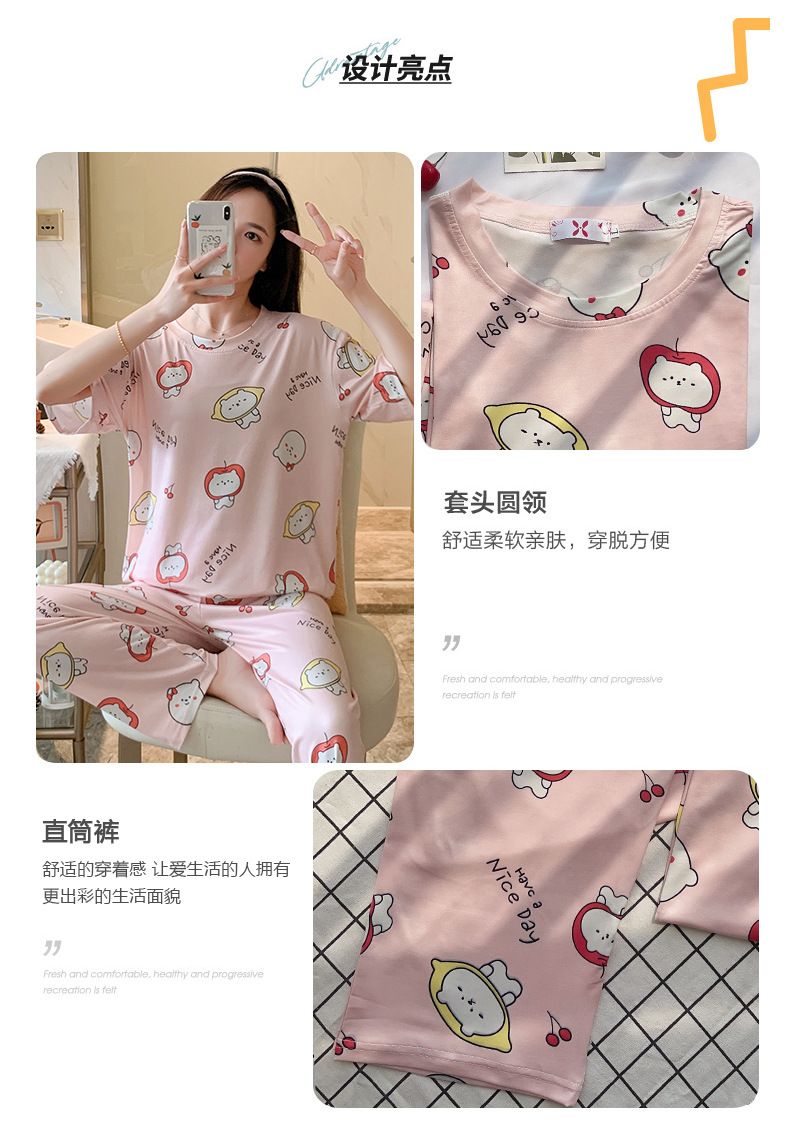 夏季短袖长裤睡衣女士圆领卡通甜美学生家居服套装外贸批发