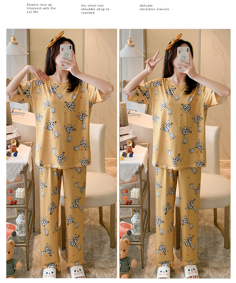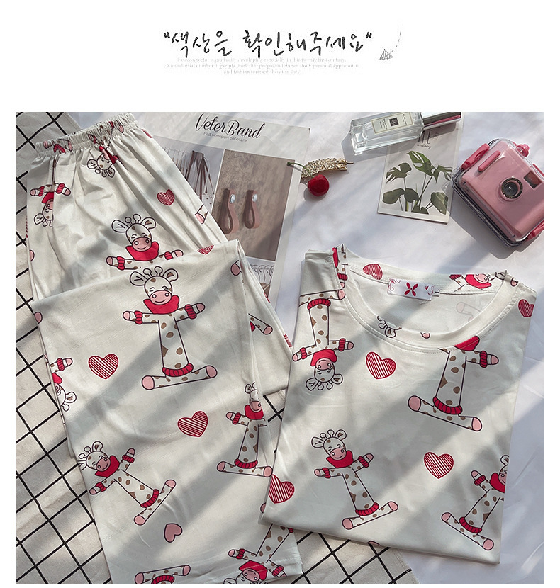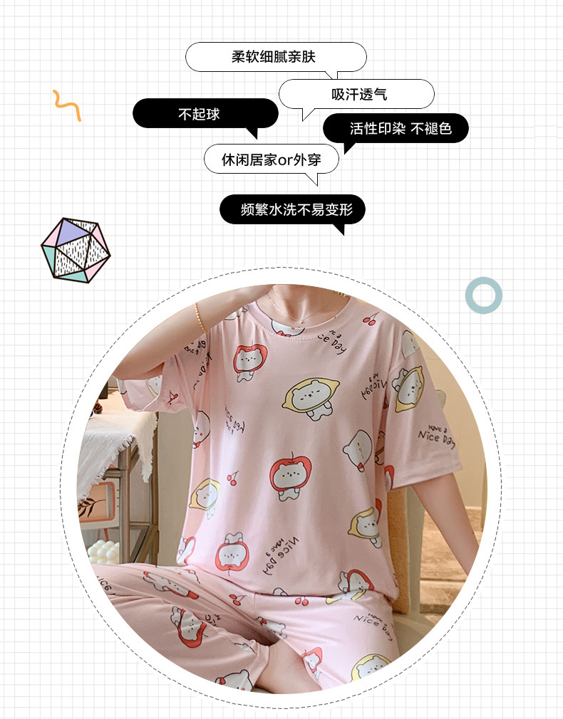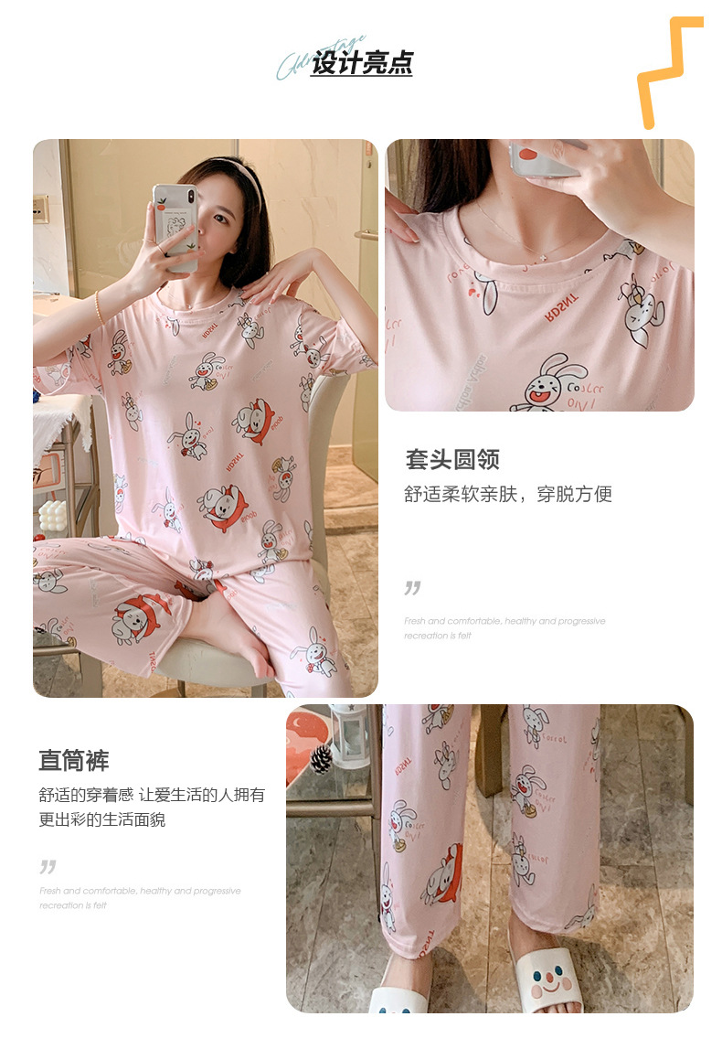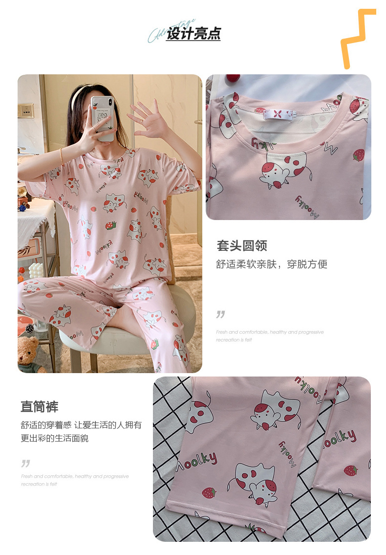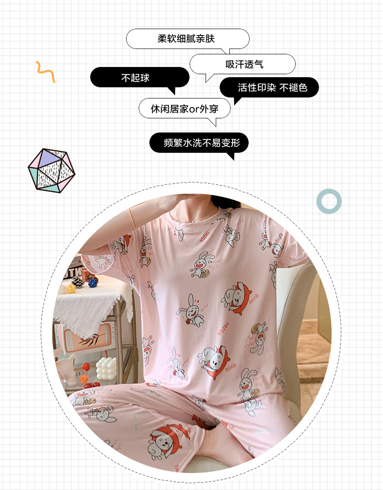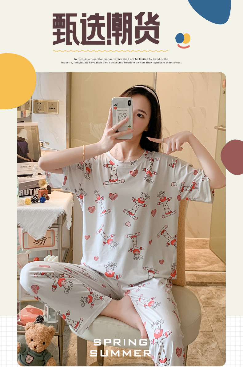 夏季短袖长裤睡衣女士圆领卡通甜美学生家居服套装外贸批发