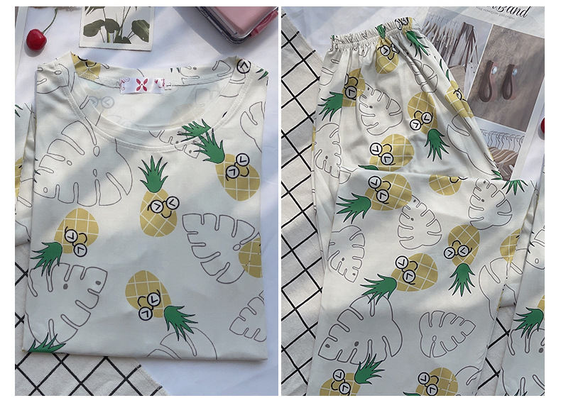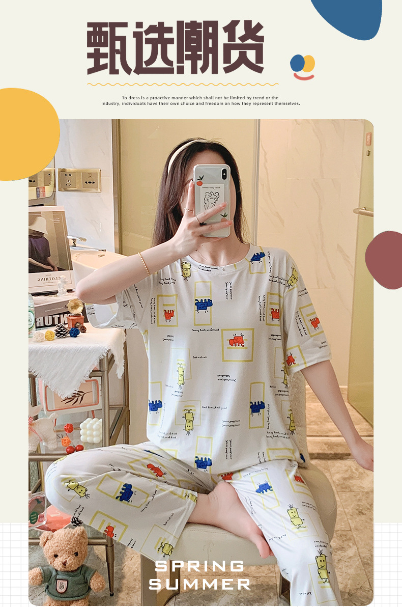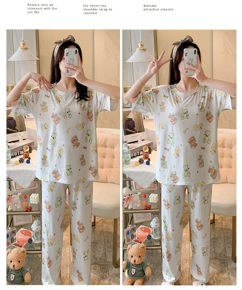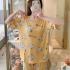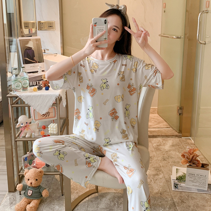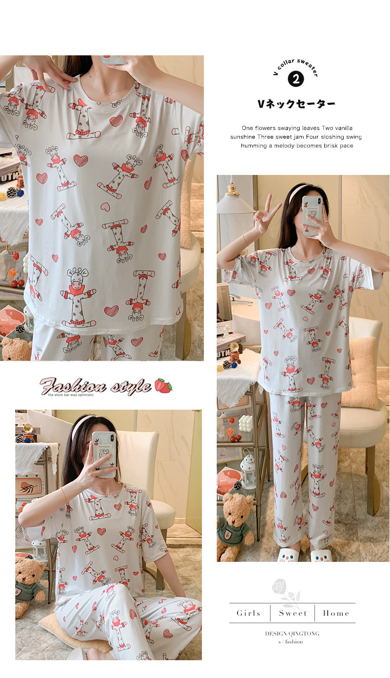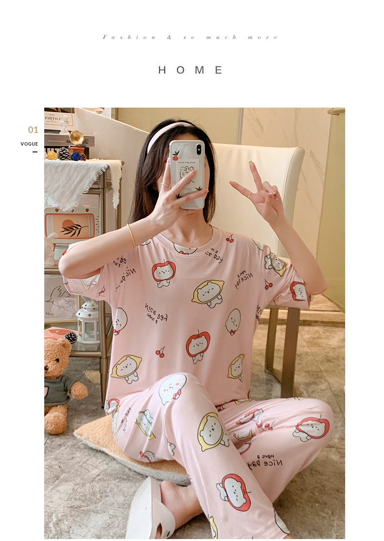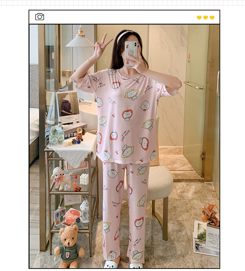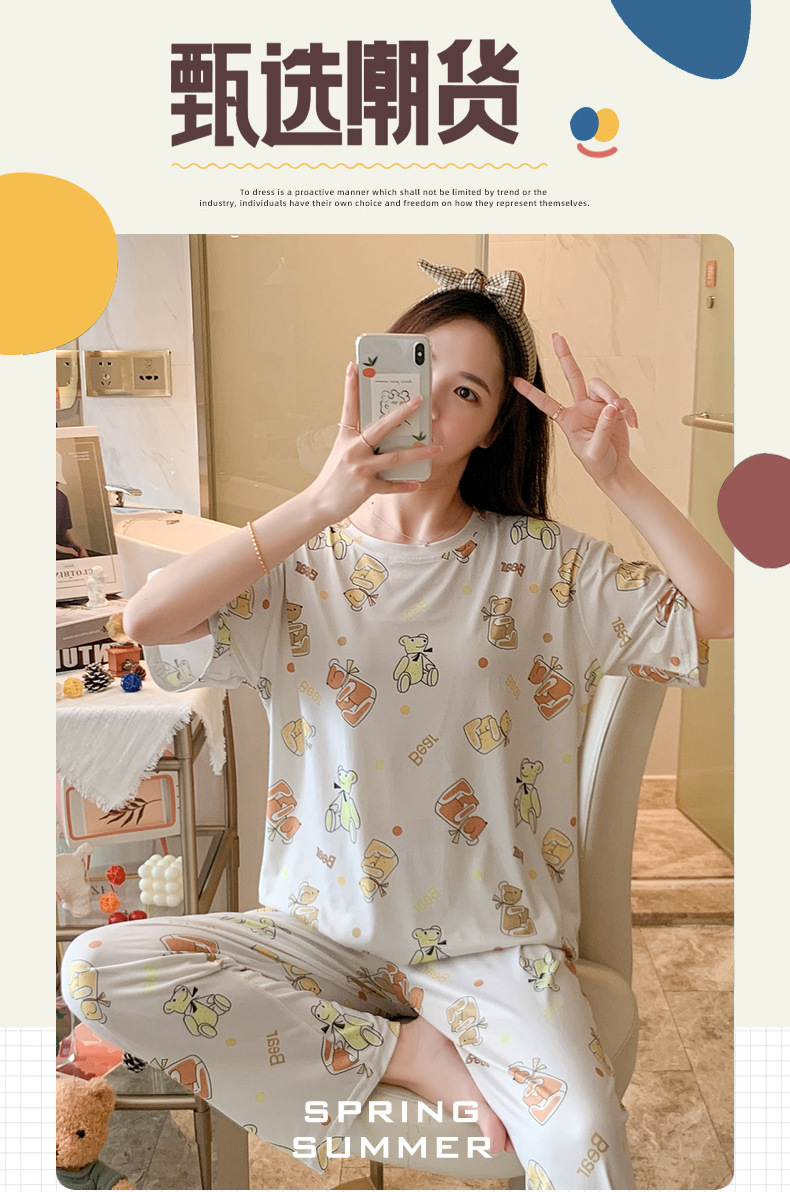 夏季短袖长裤睡衣女士圆领卡通甜美学生家居服套装外贸批发