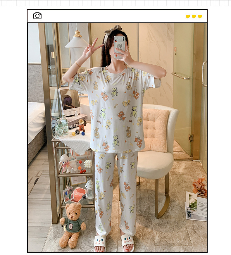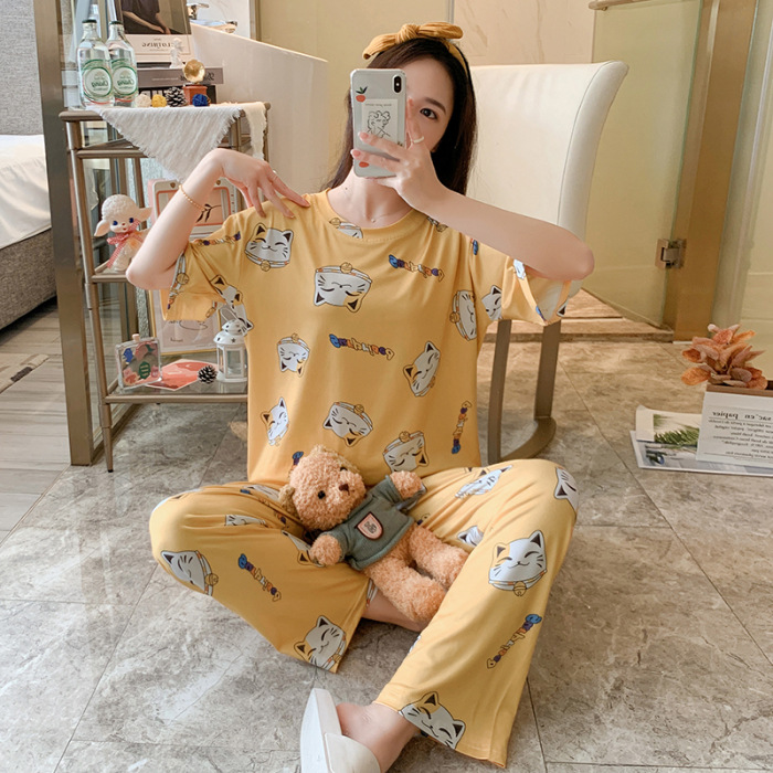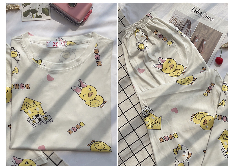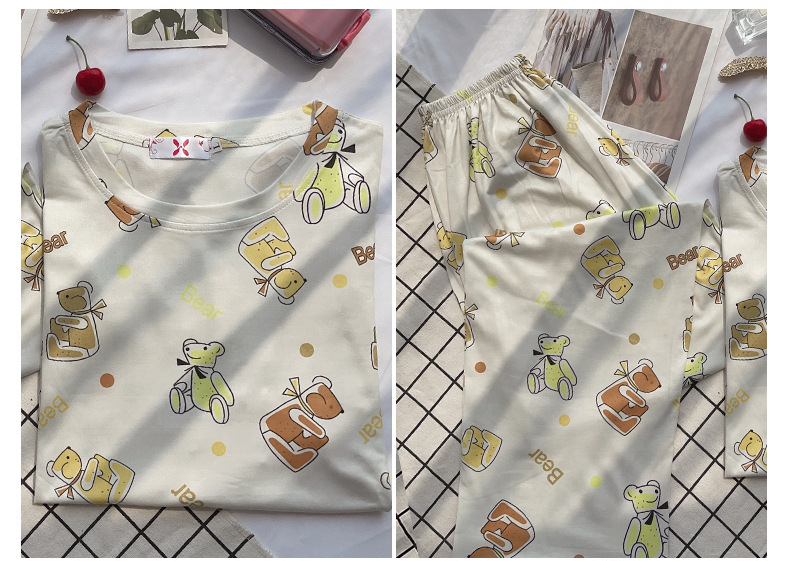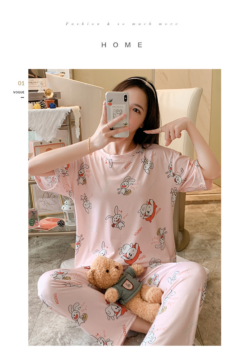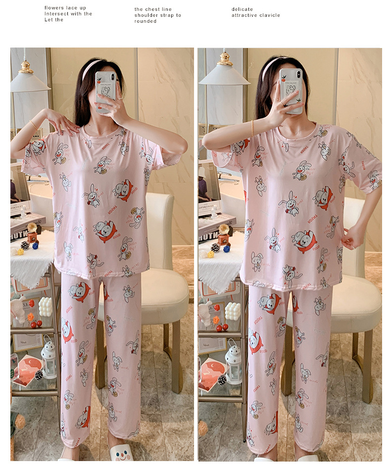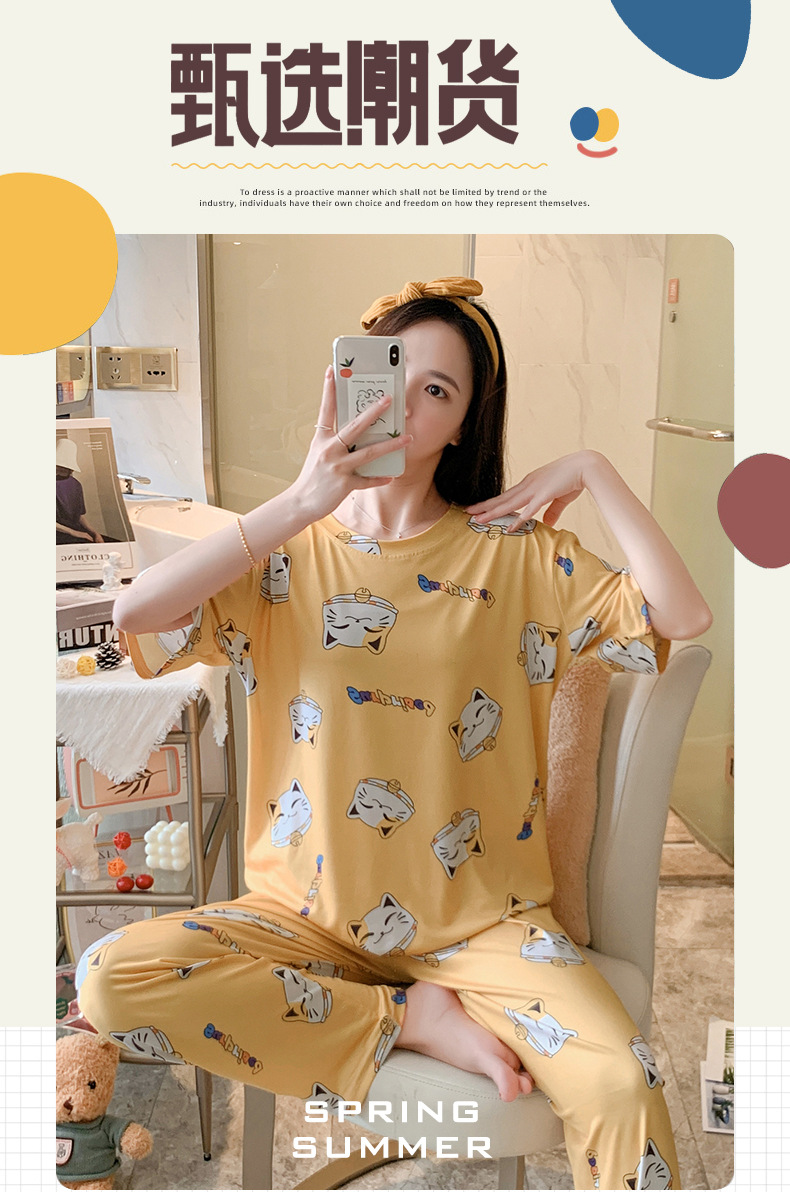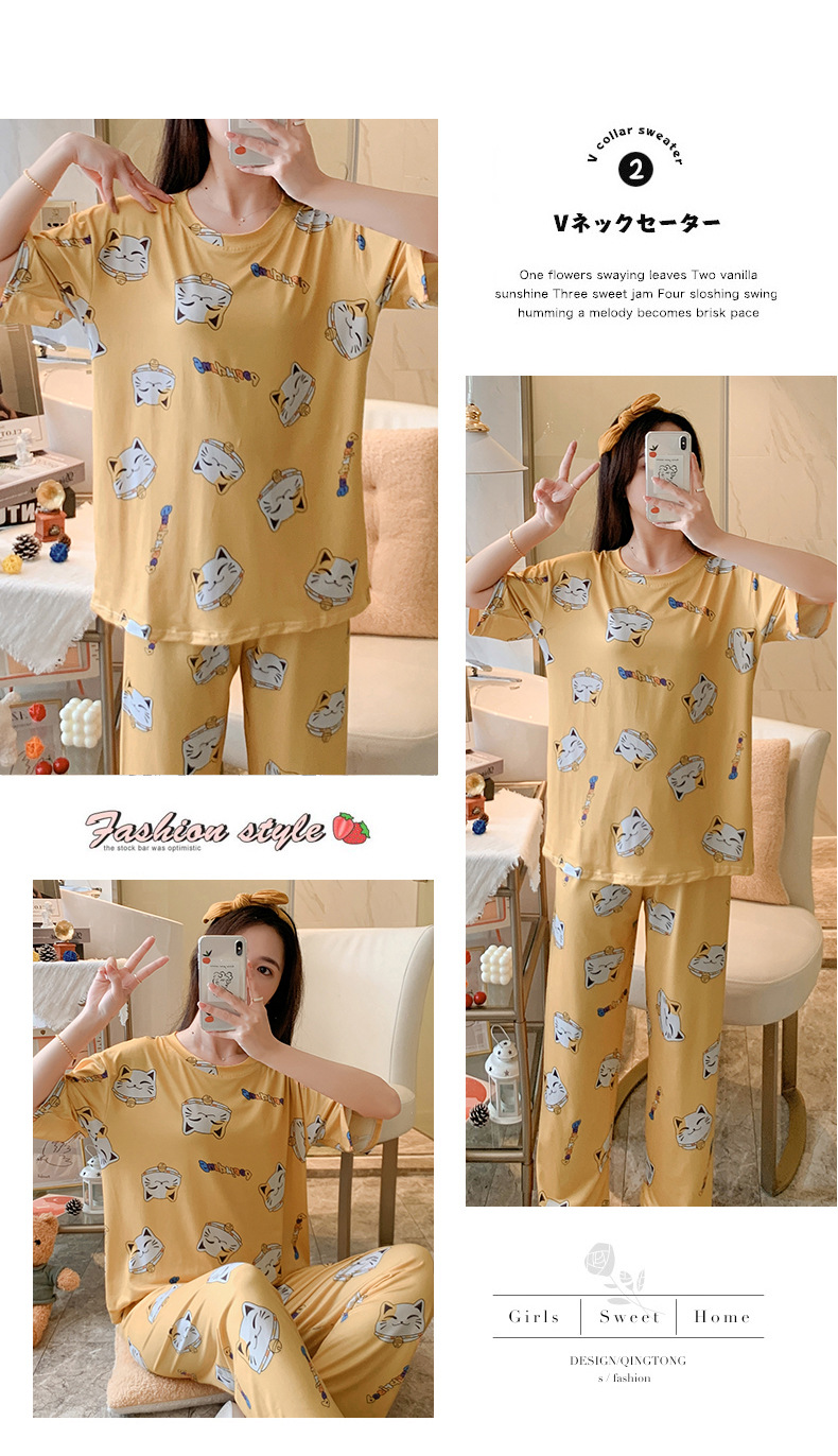 夏季短袖长裤睡衣女士圆领卡通甜美学生家居服套装外贸批发