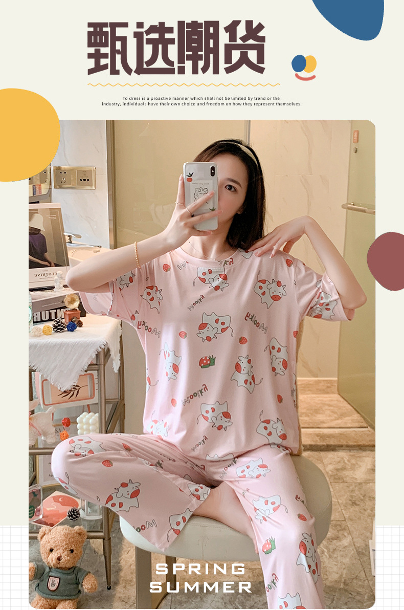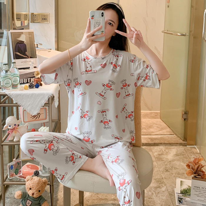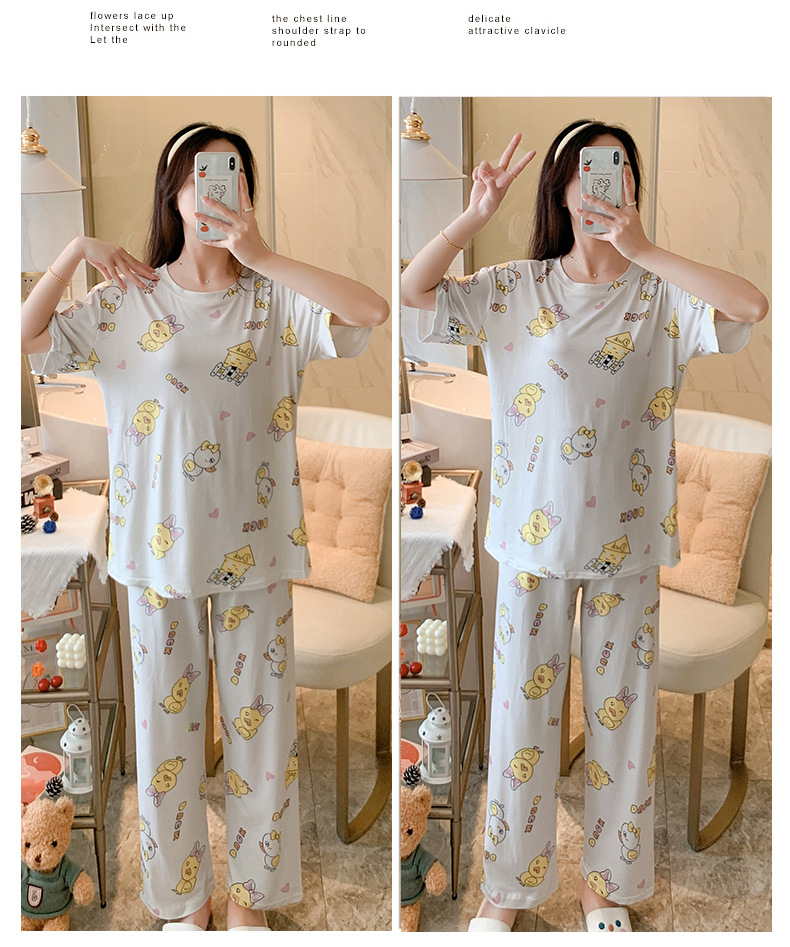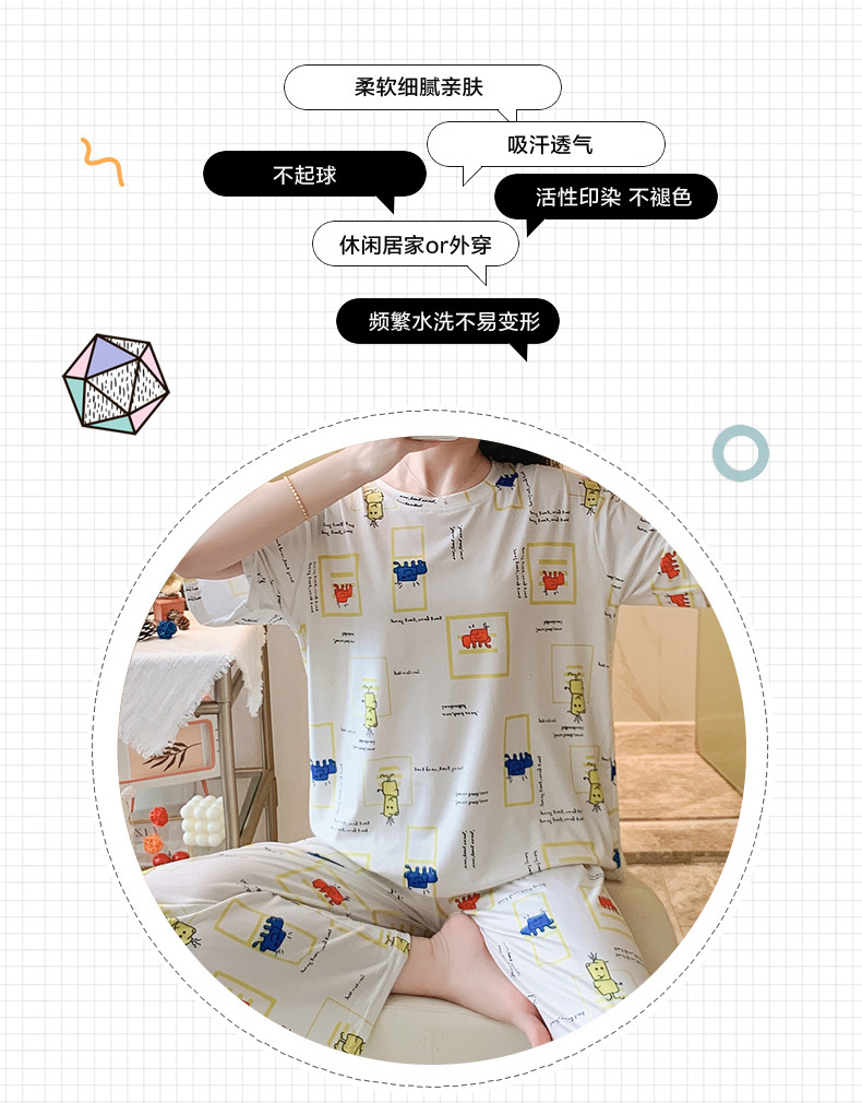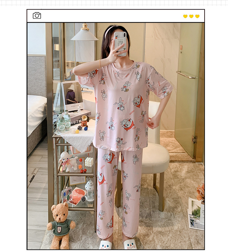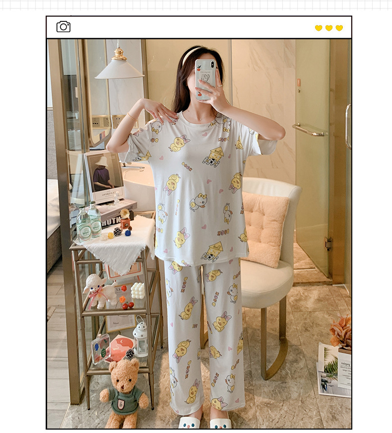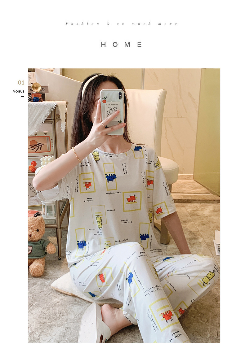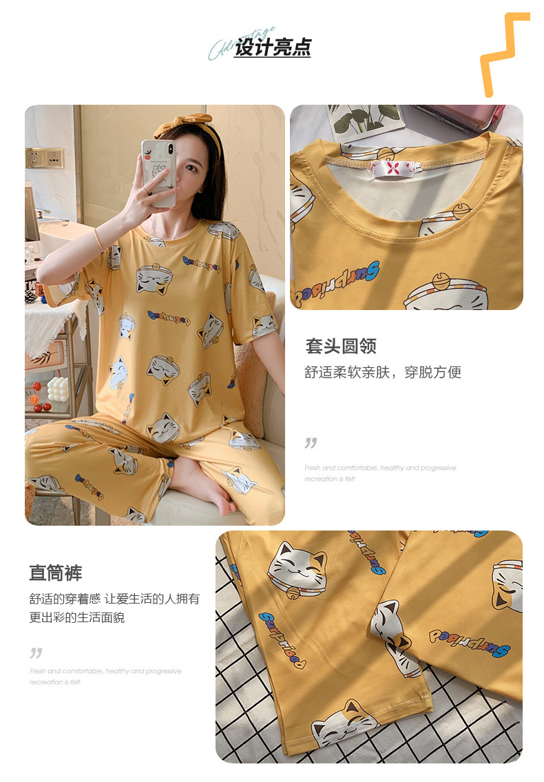 夏季短袖长裤睡衣女士圆领卡通甜美学生家居服套装外贸批发