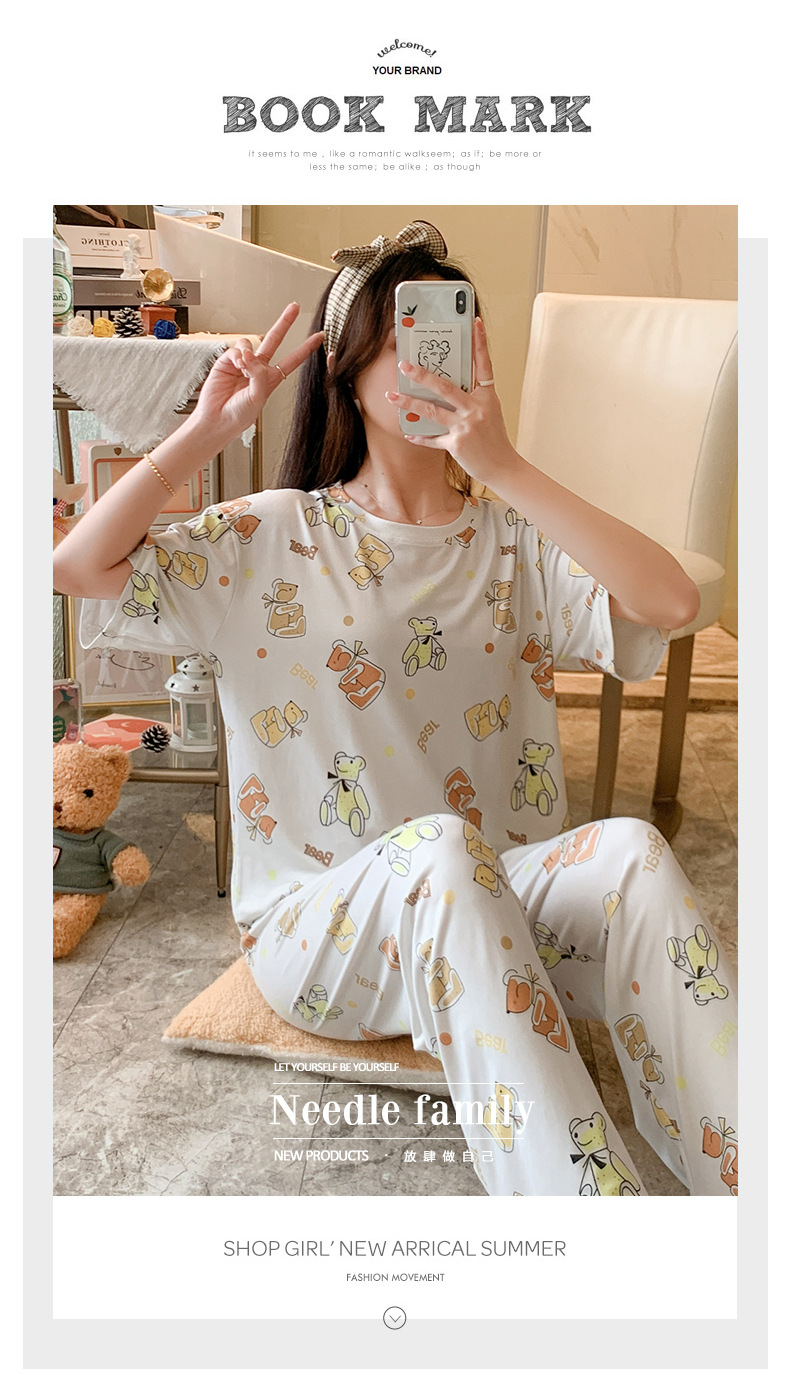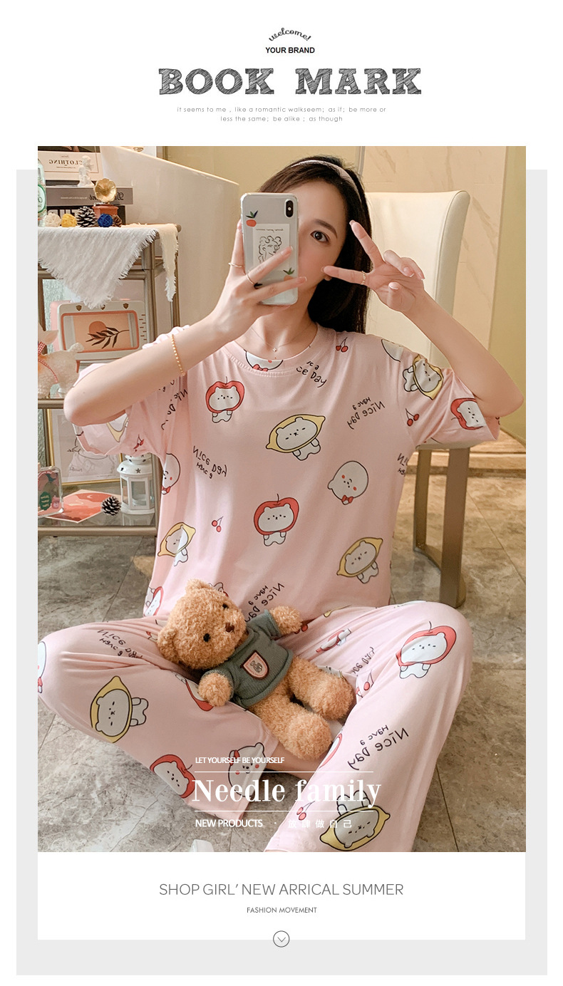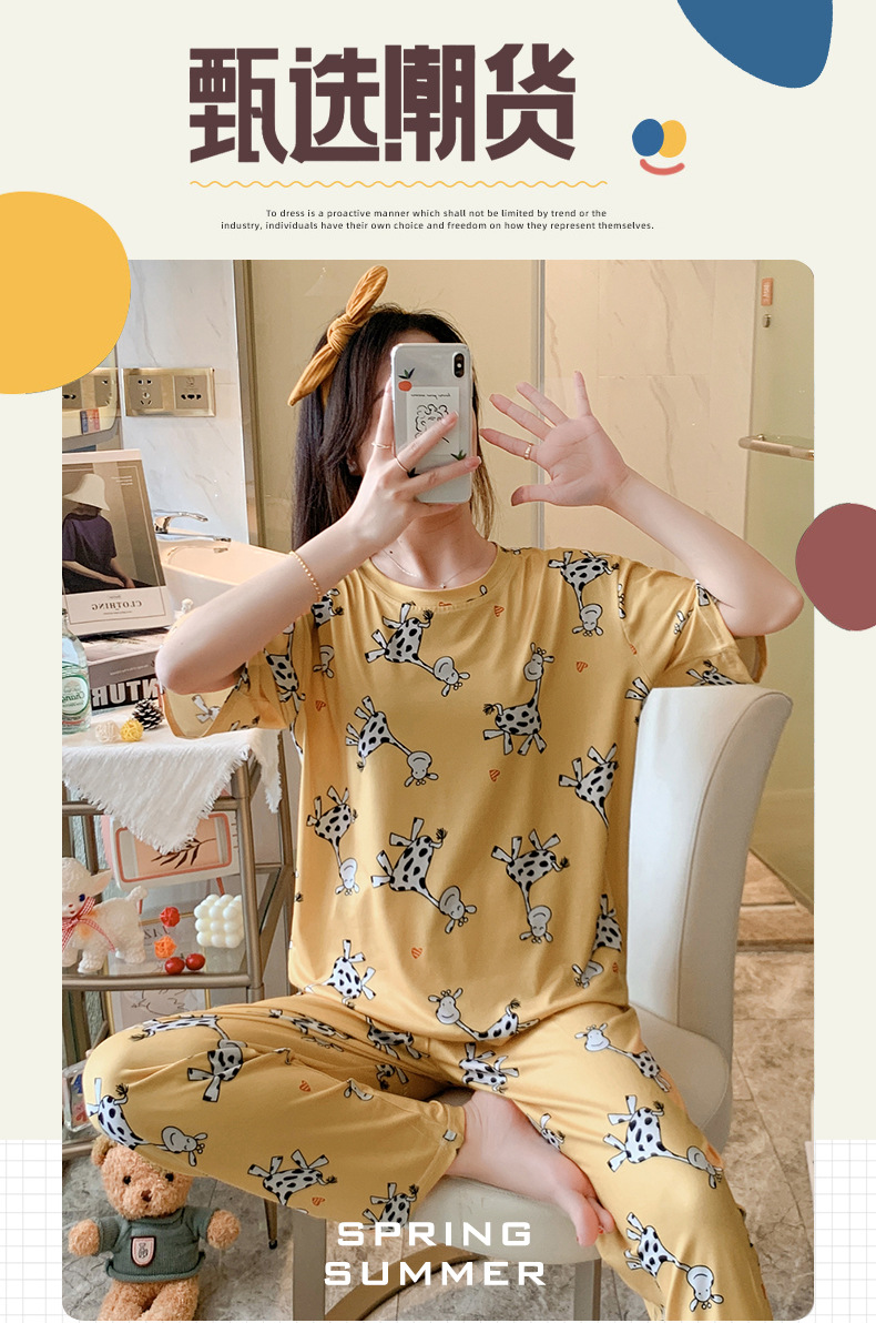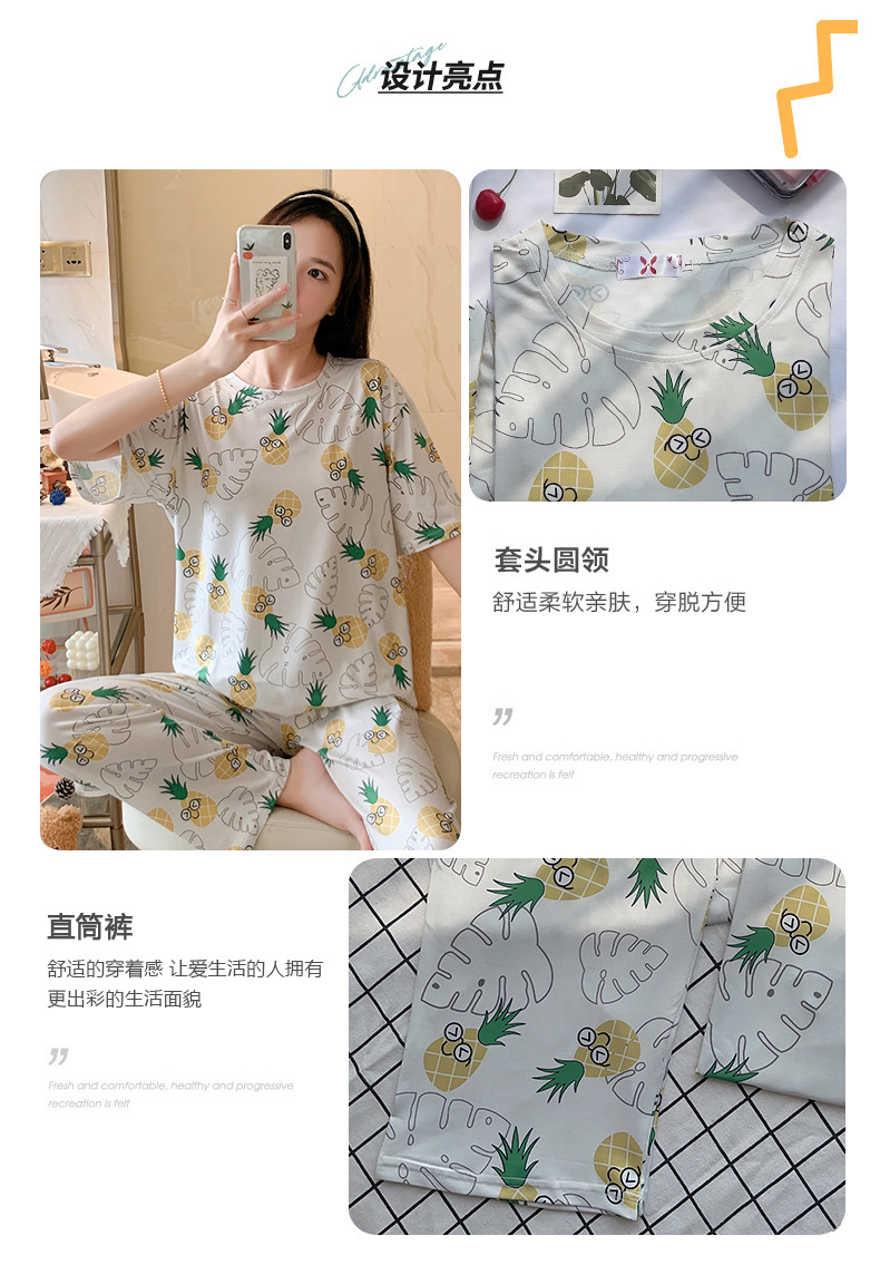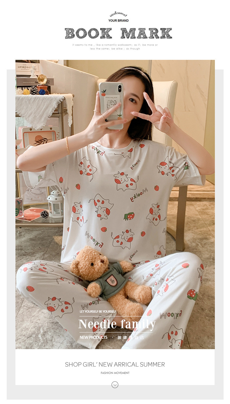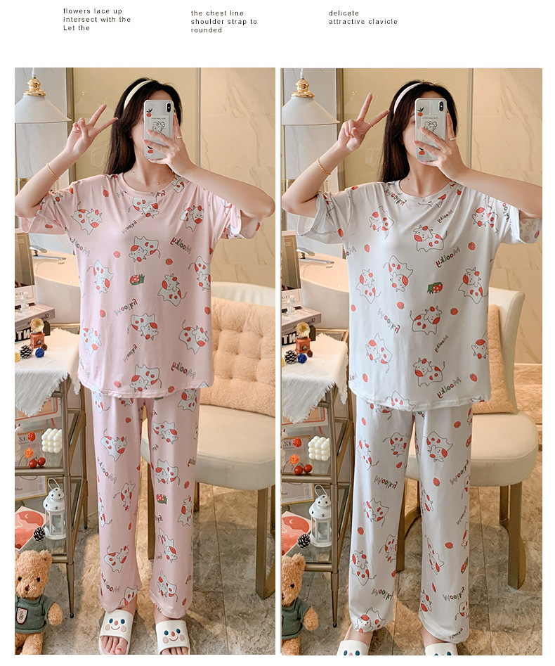 夏季短袖长裤睡衣女士圆领卡通甜美学生家居服套装外贸批发