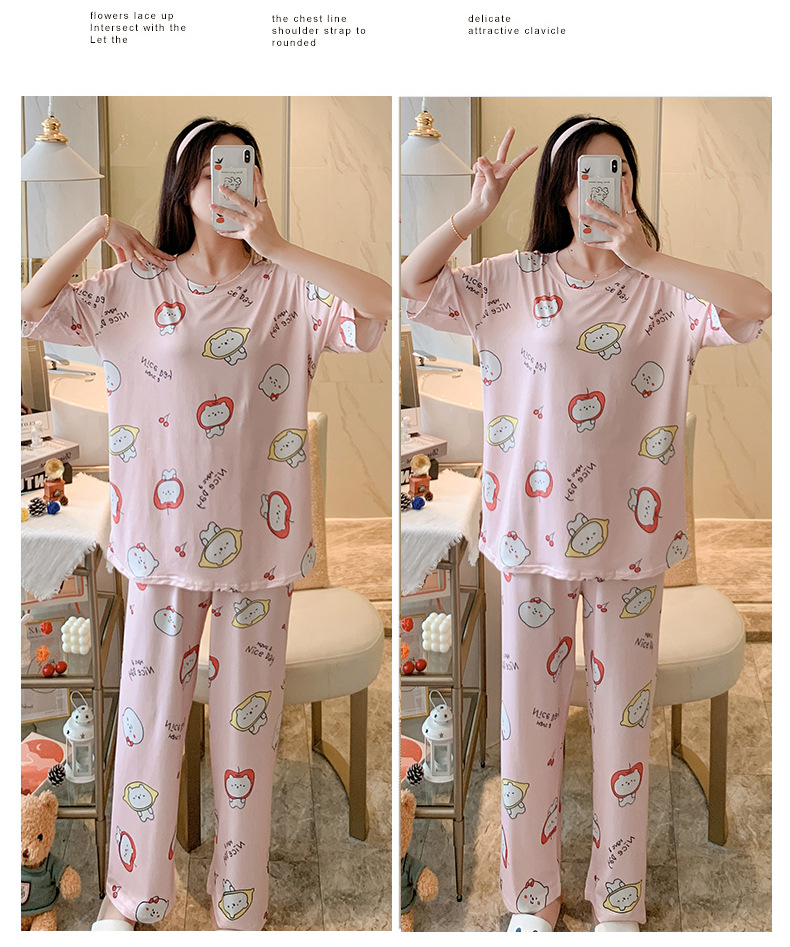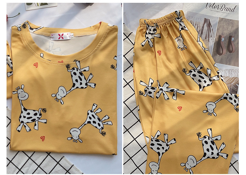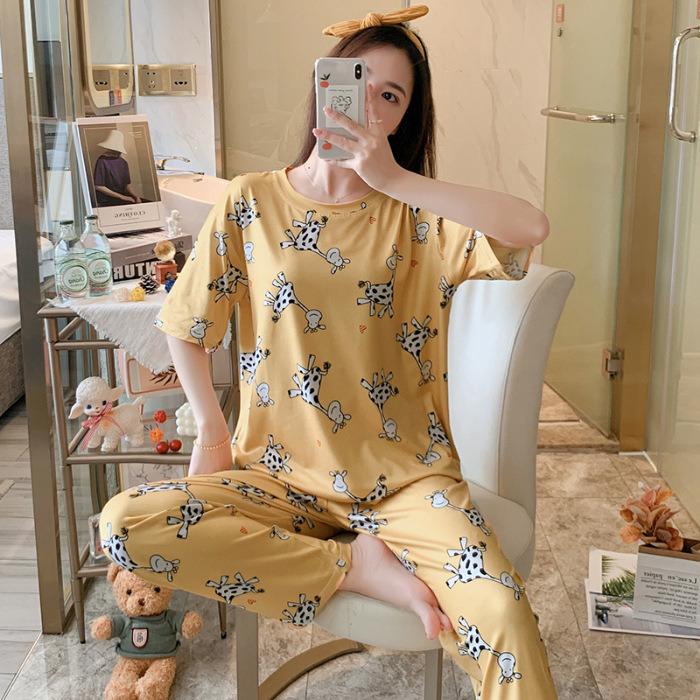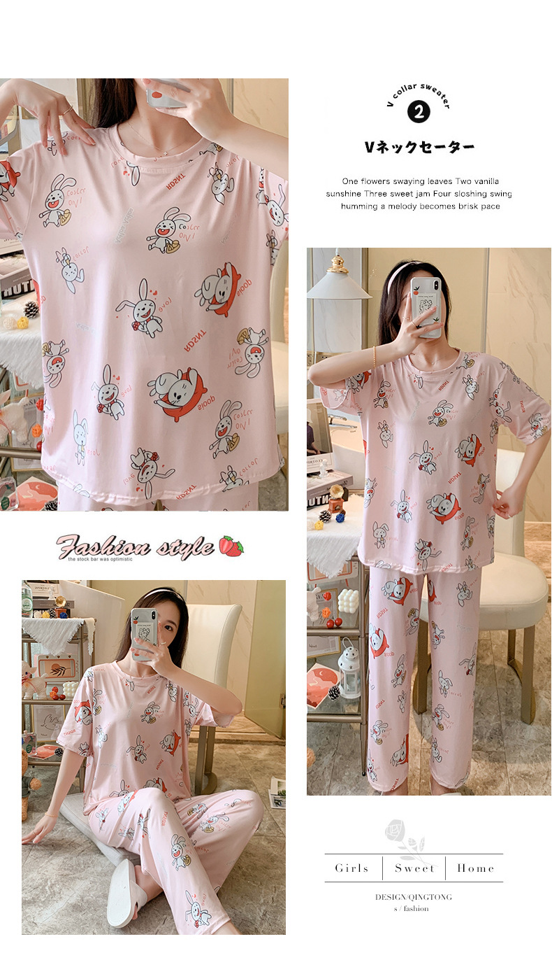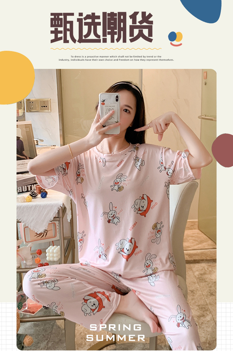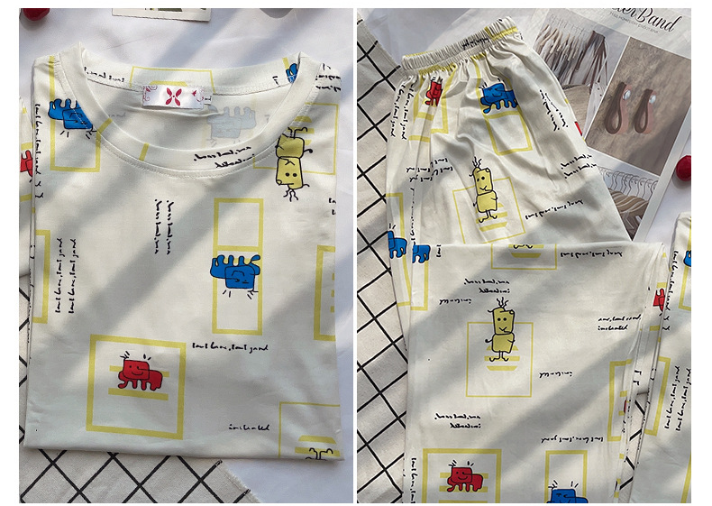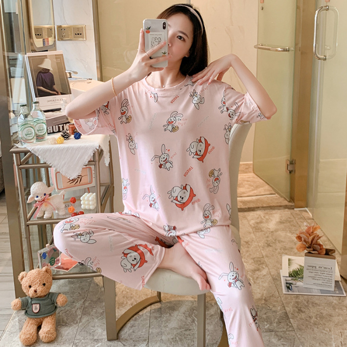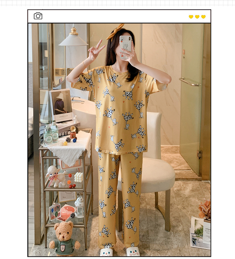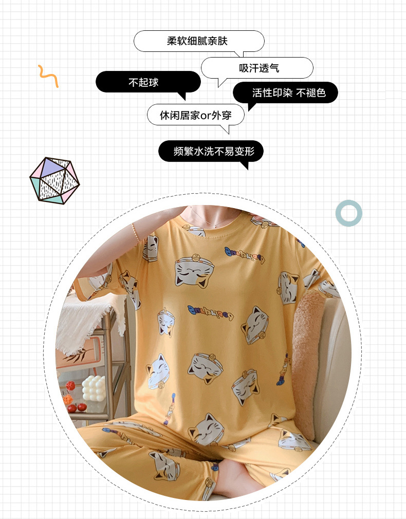 夏季短袖长裤睡衣女士圆领卡通甜美学生家居服套装外贸批发