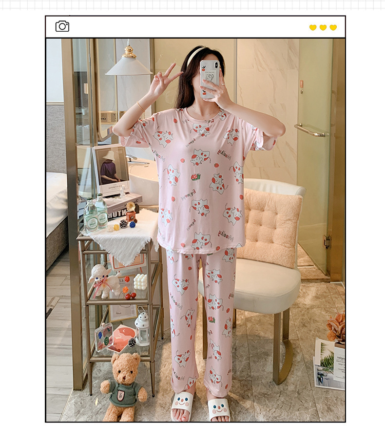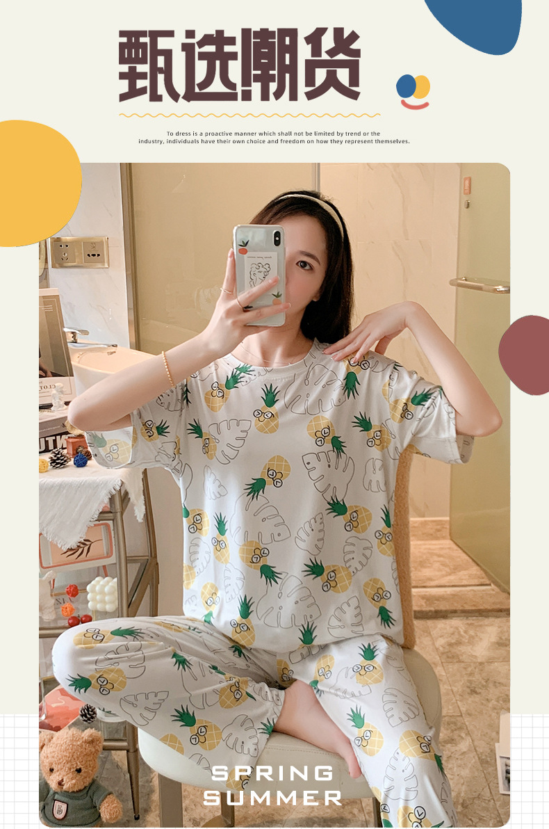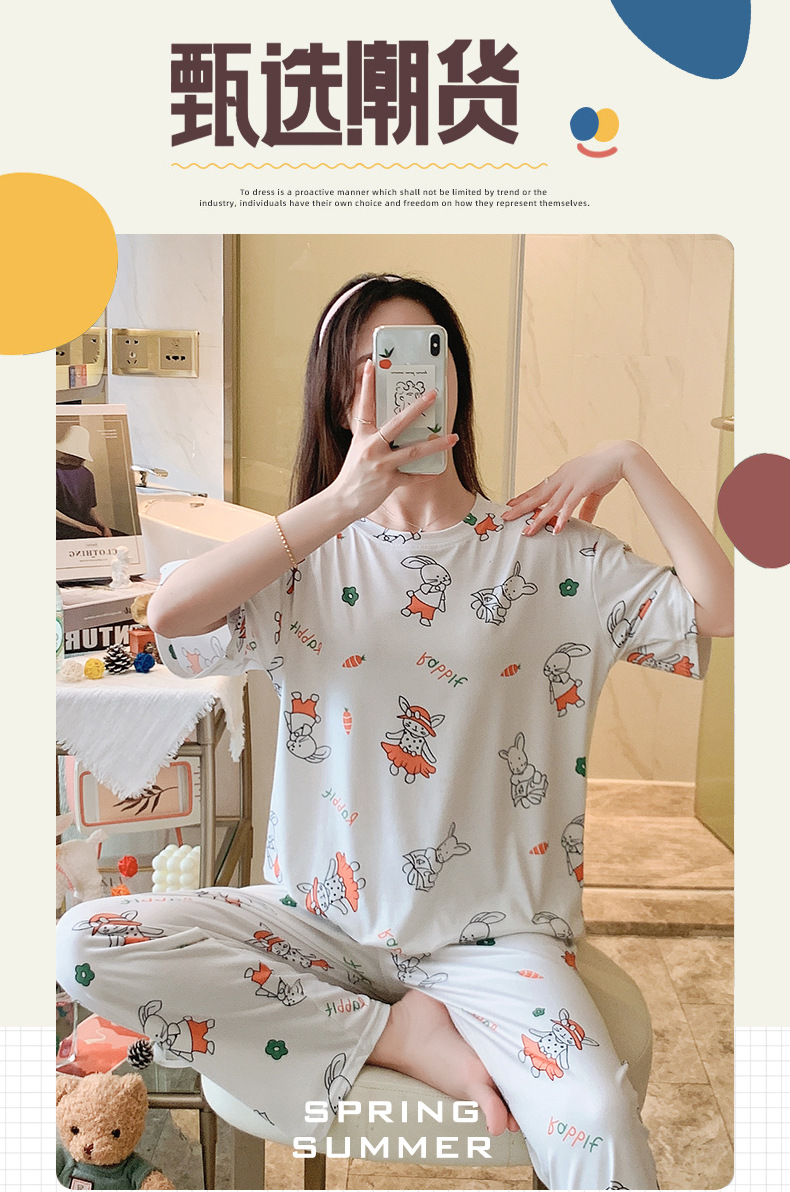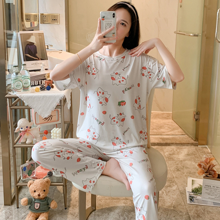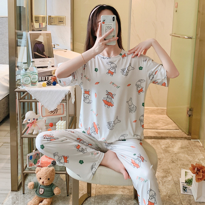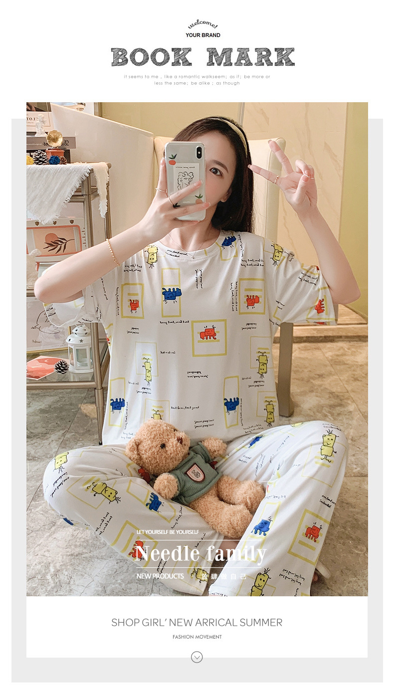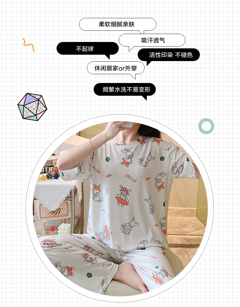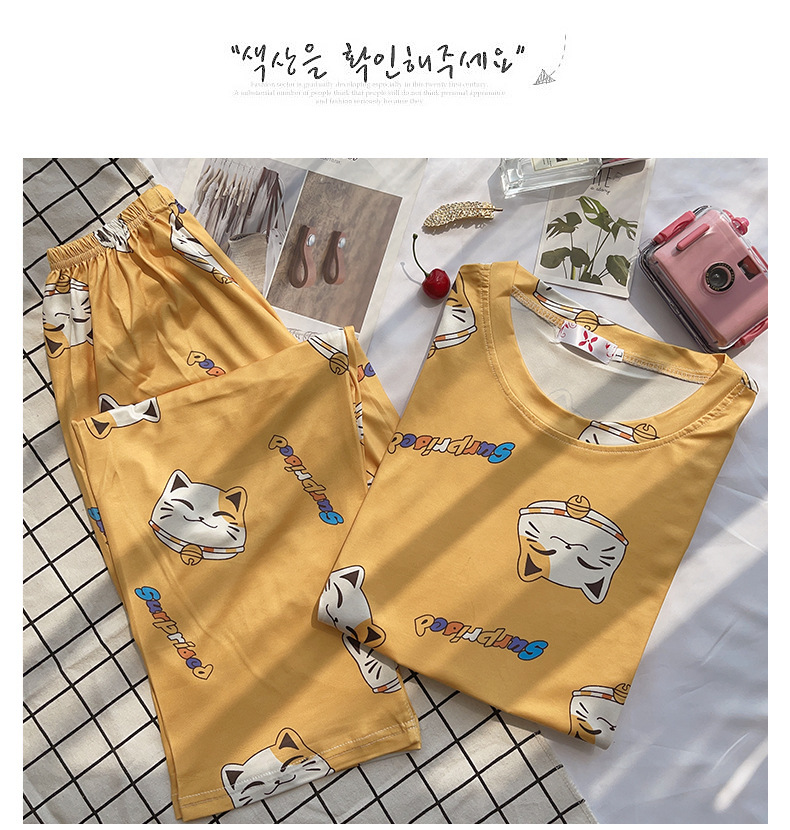 夏季短袖长裤睡衣女士圆领卡通甜美学生家居服套装外贸批发