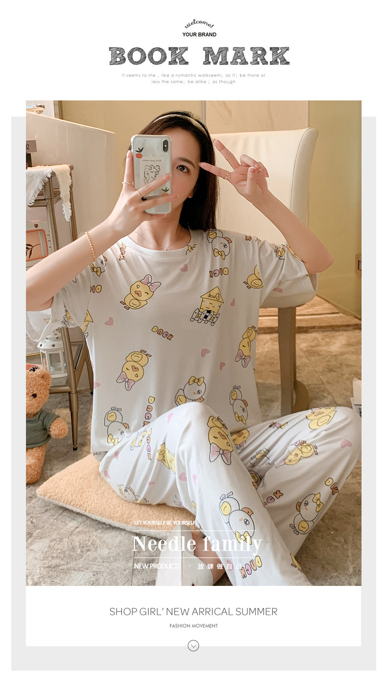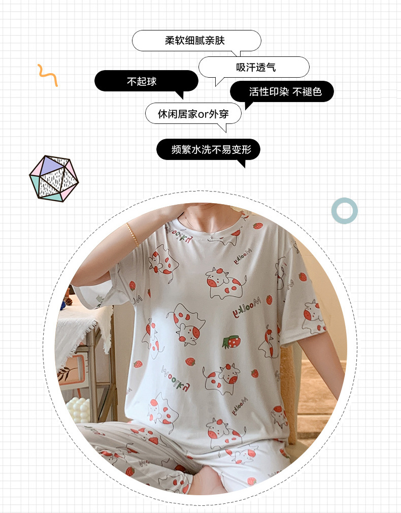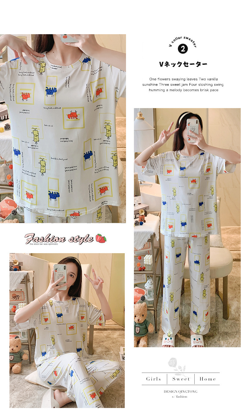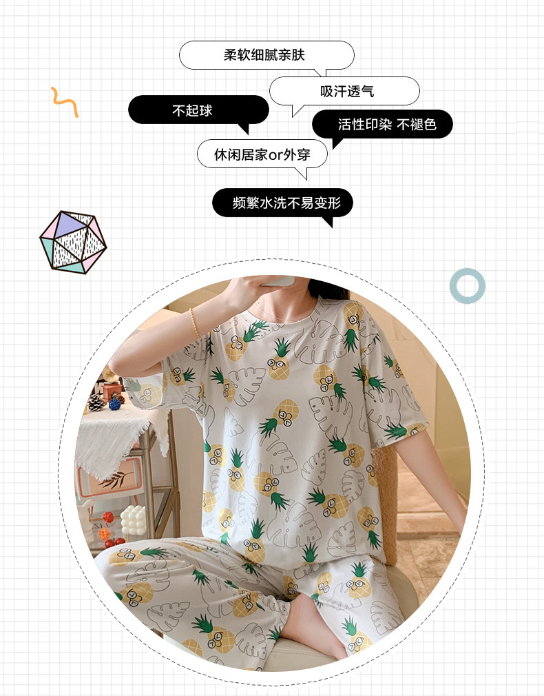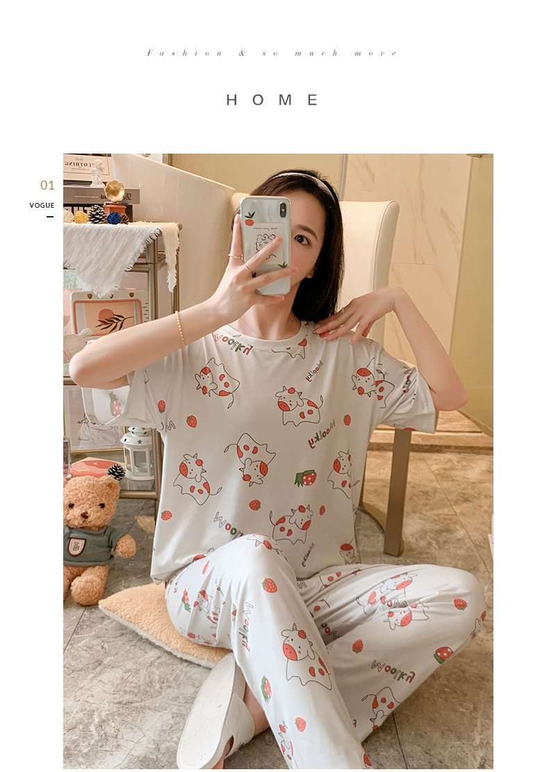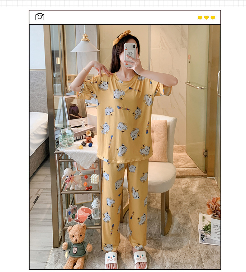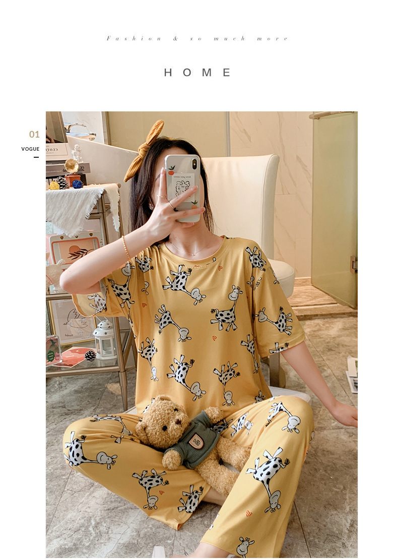 夏季短袖长裤睡衣女士圆领卡通甜美学生家居服套装外贸批发