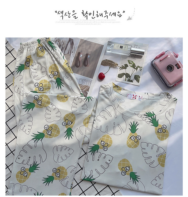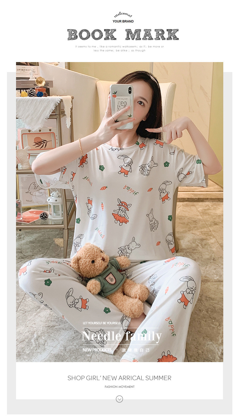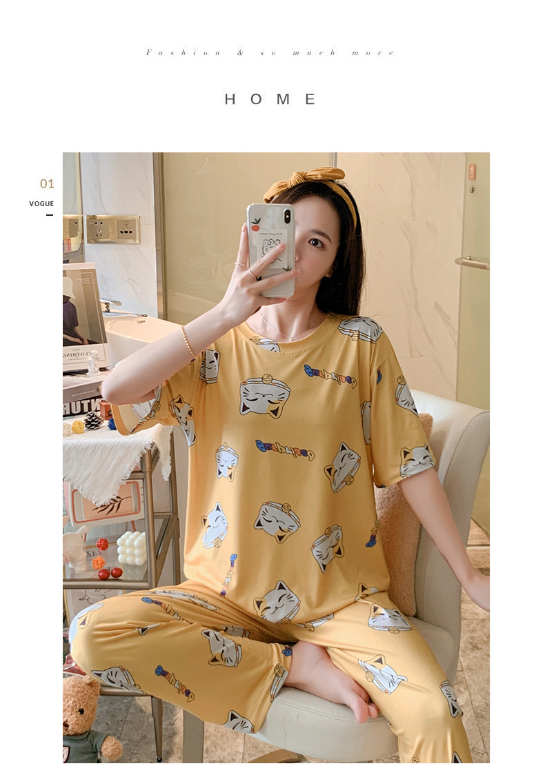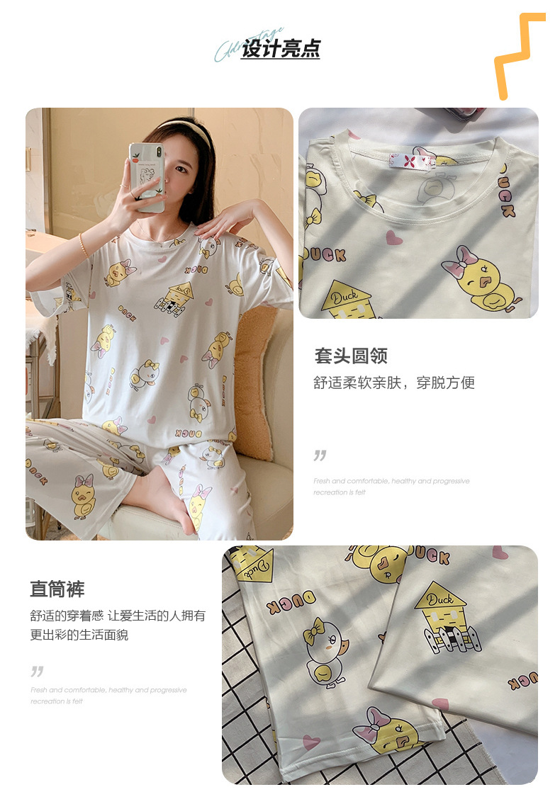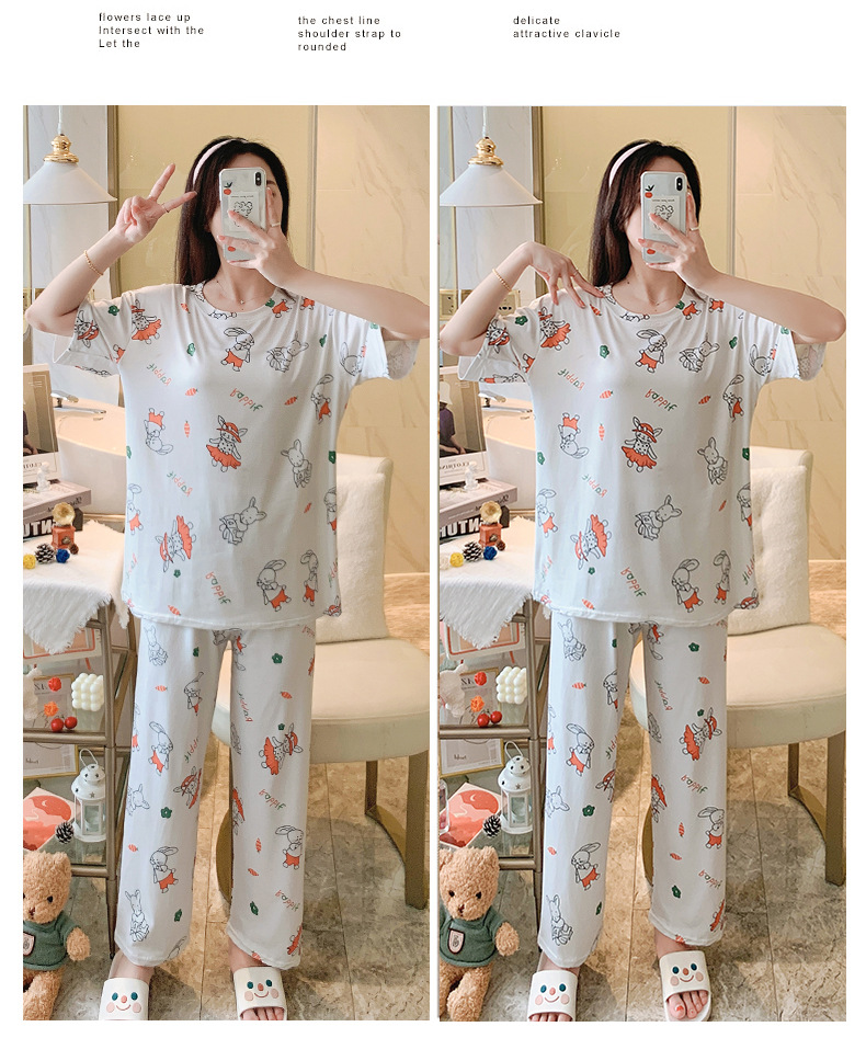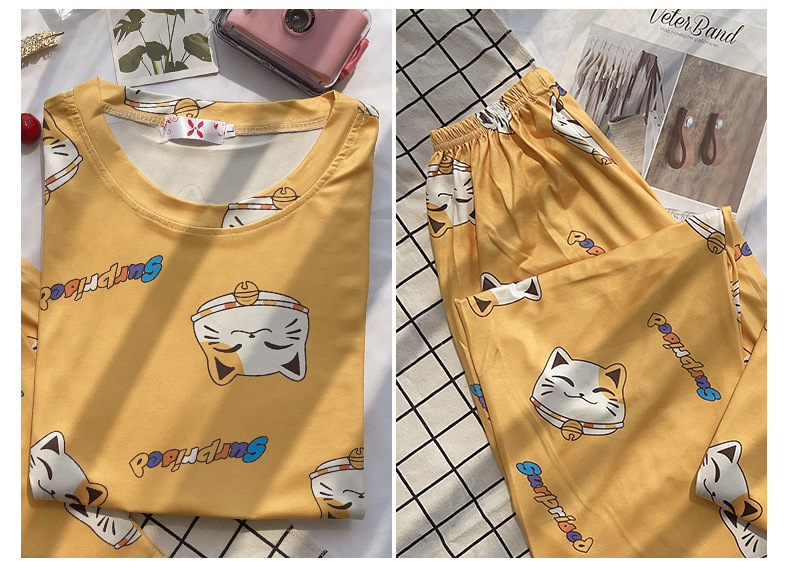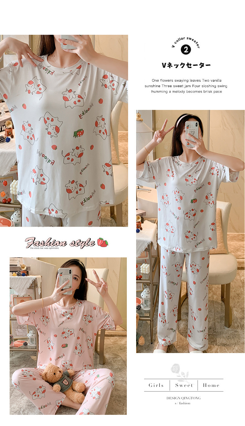 夏季短袖长裤睡衣女士圆领卡通甜美学生家居服套装外贸批发