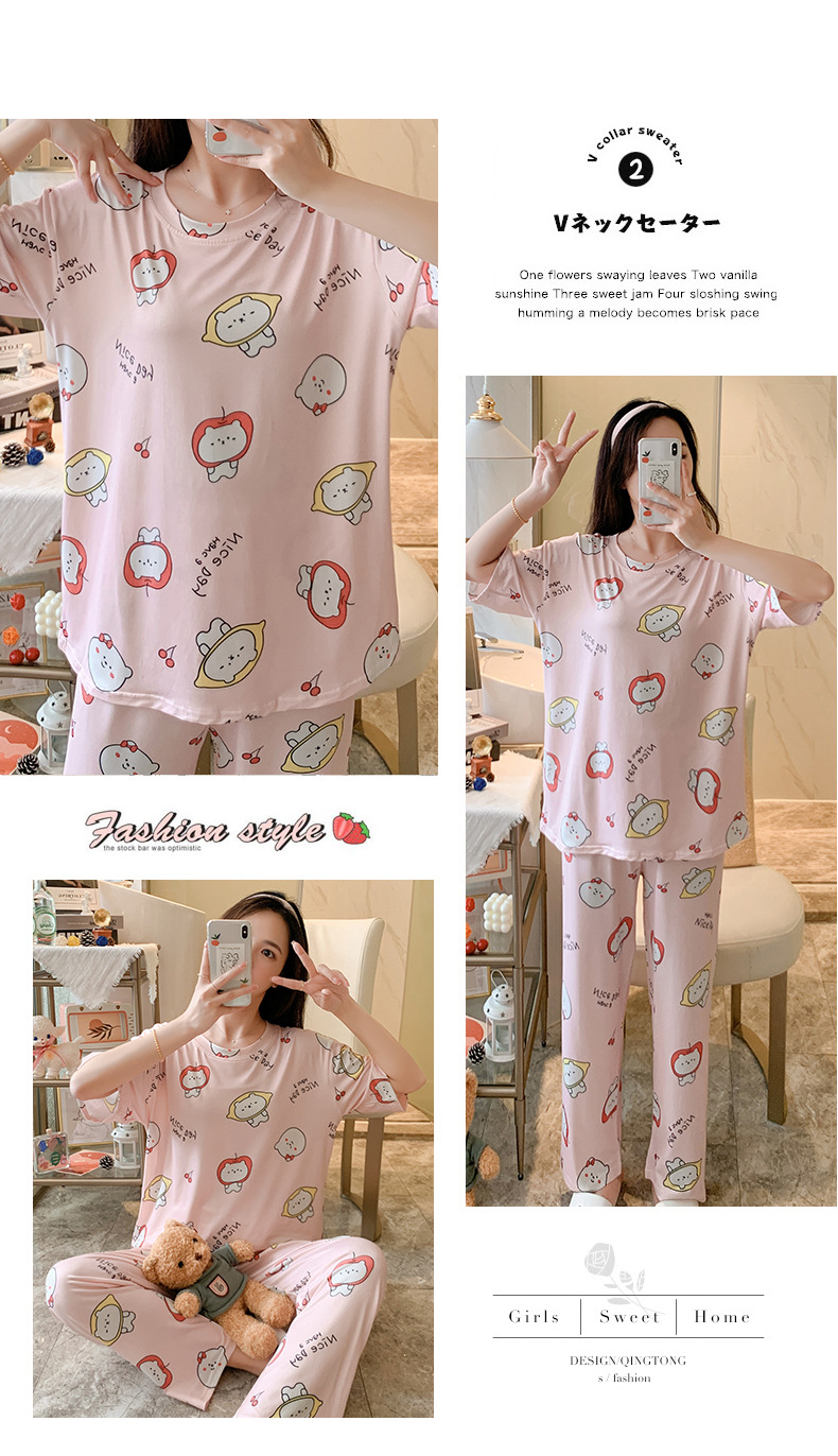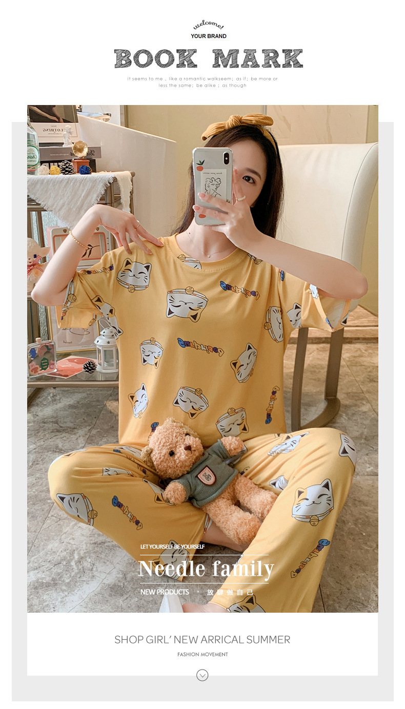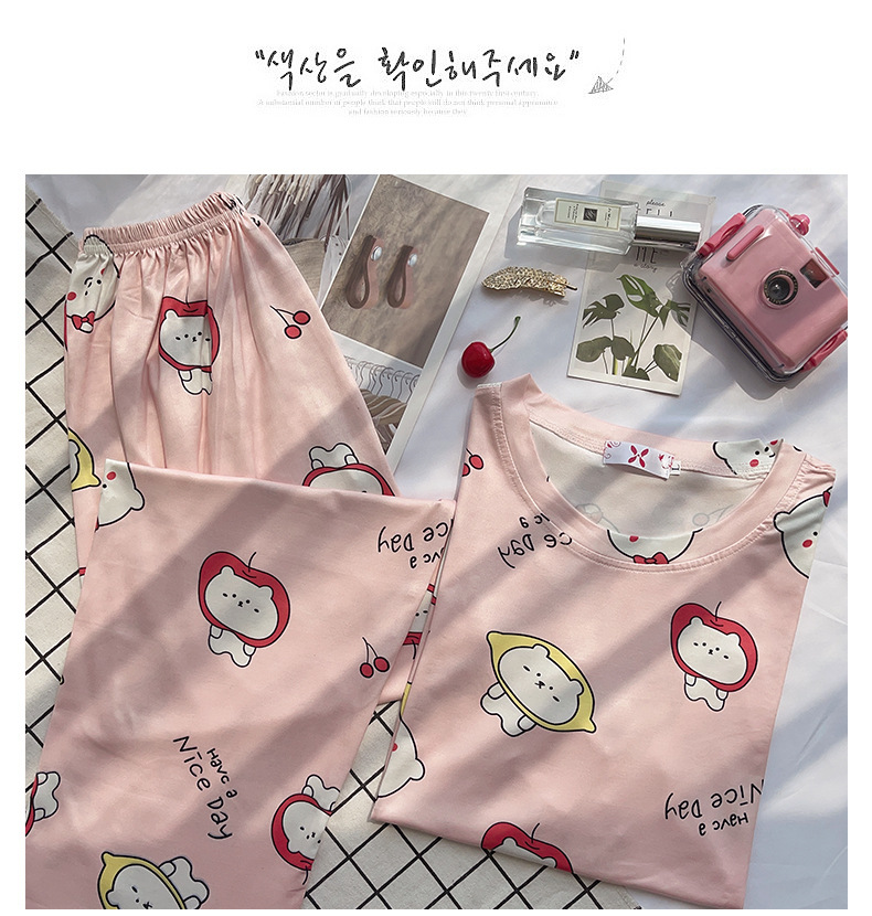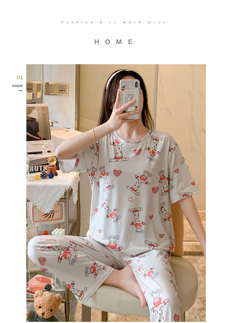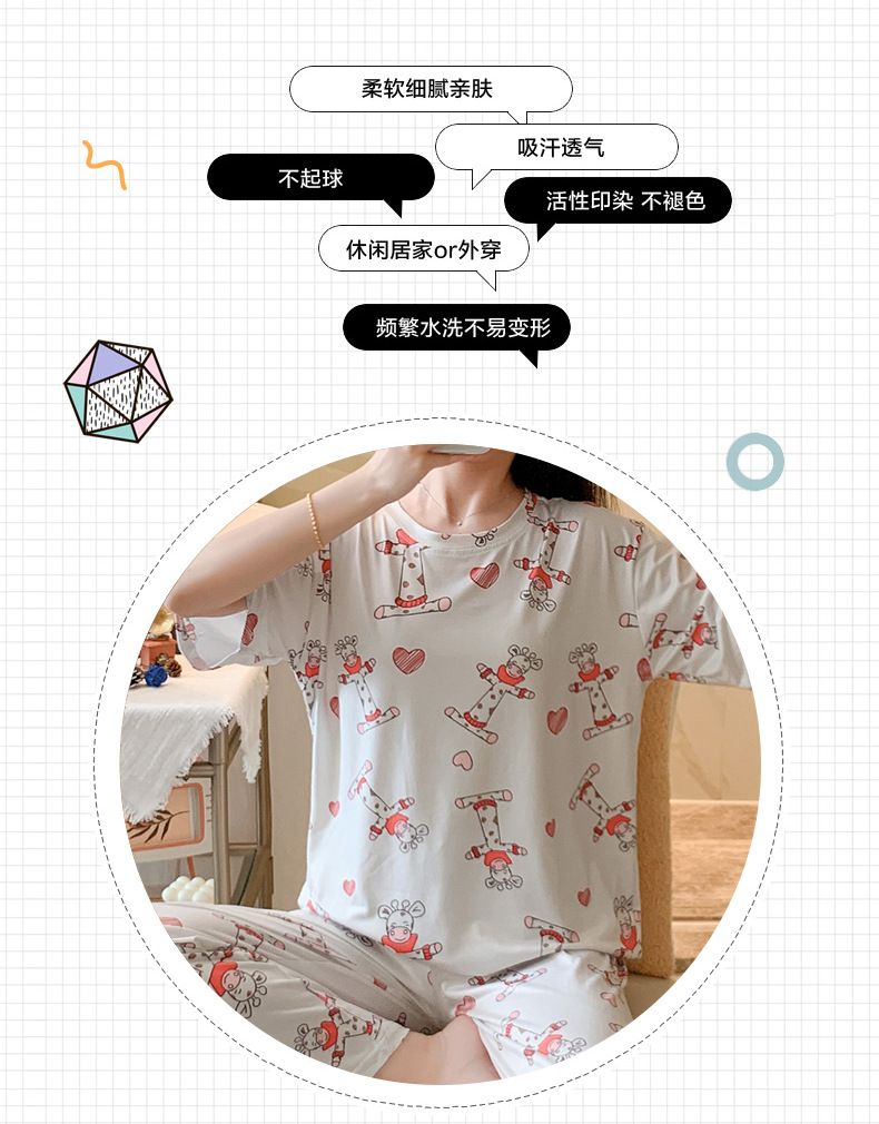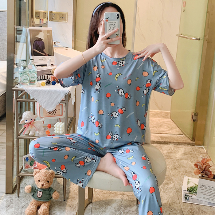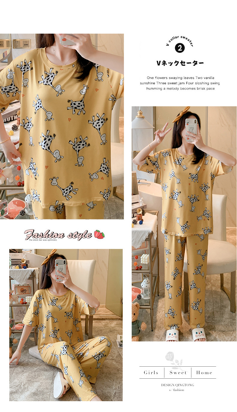 夏季短袖长裤睡衣女士圆领卡通甜美学生家居服套装外贸批发