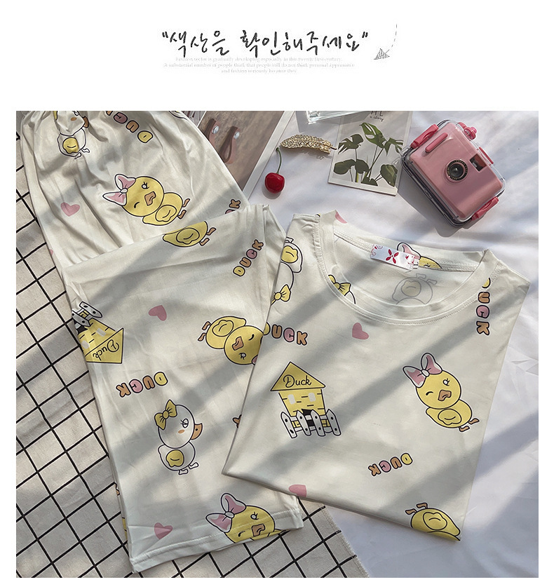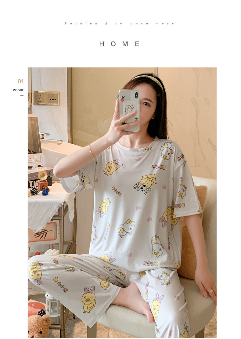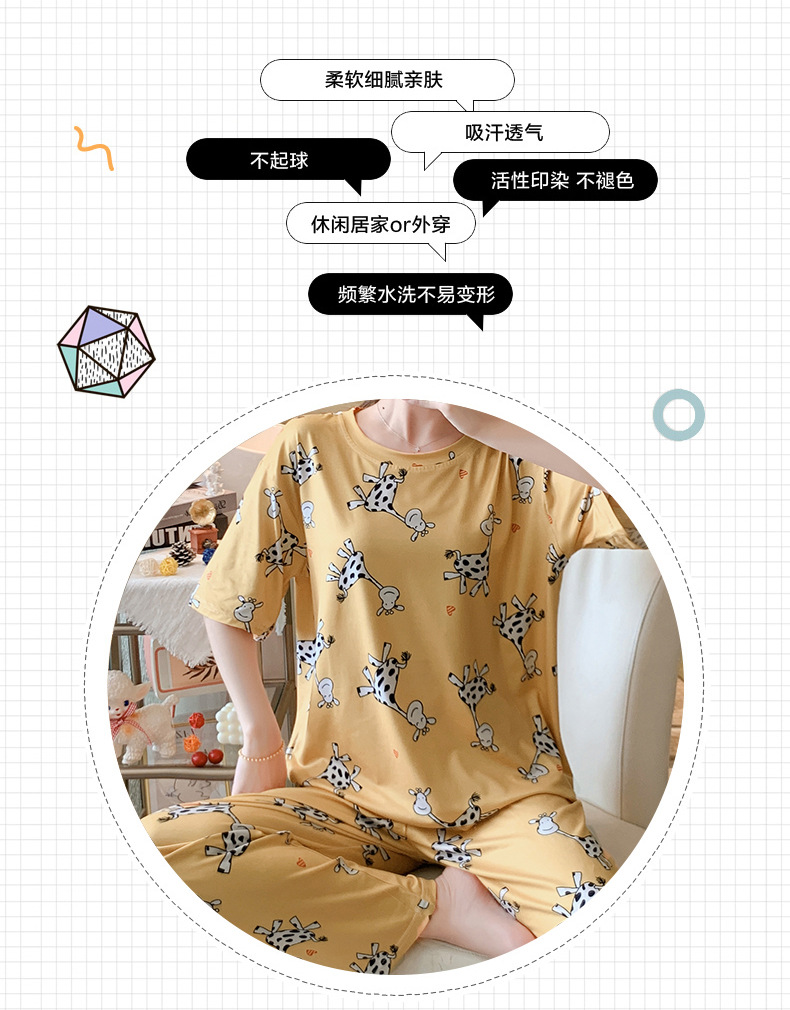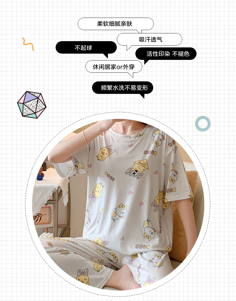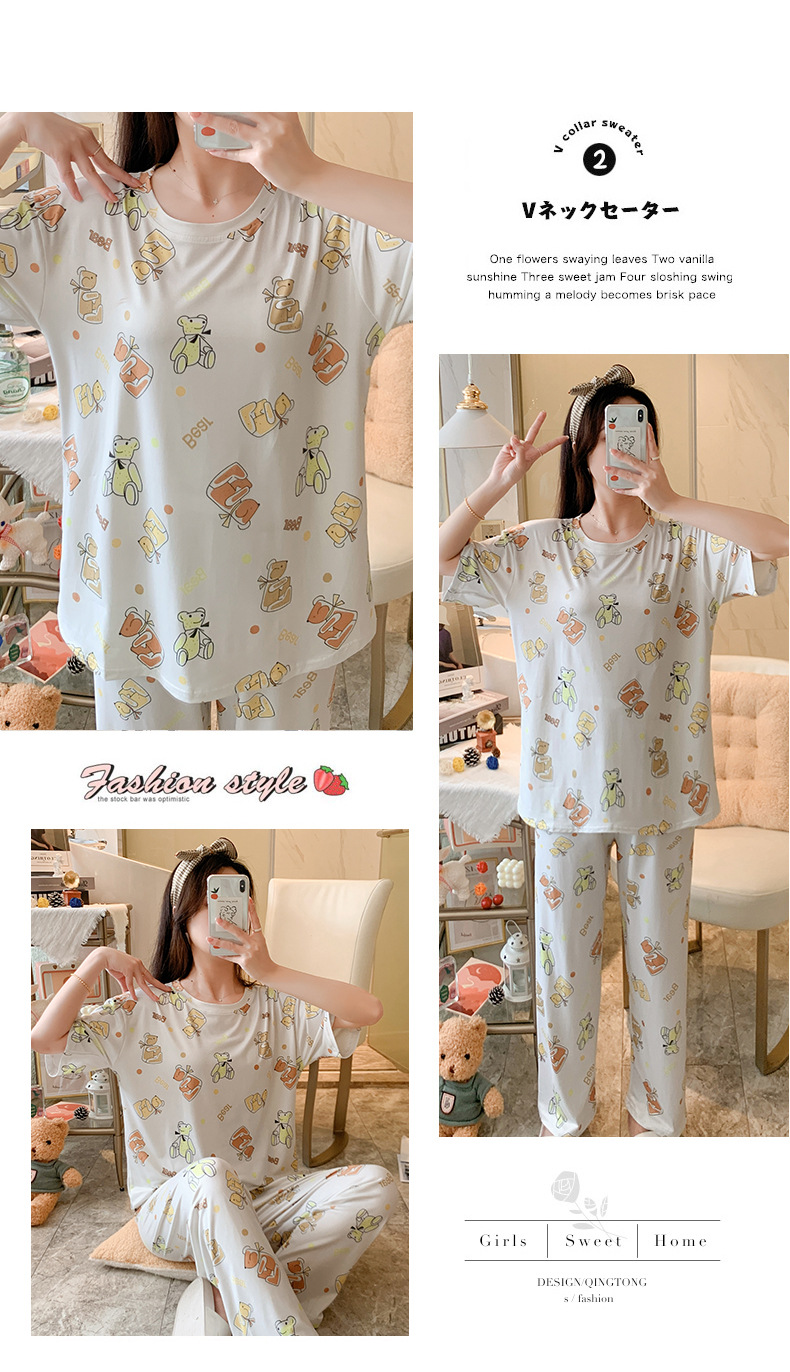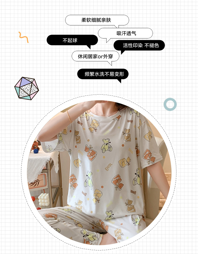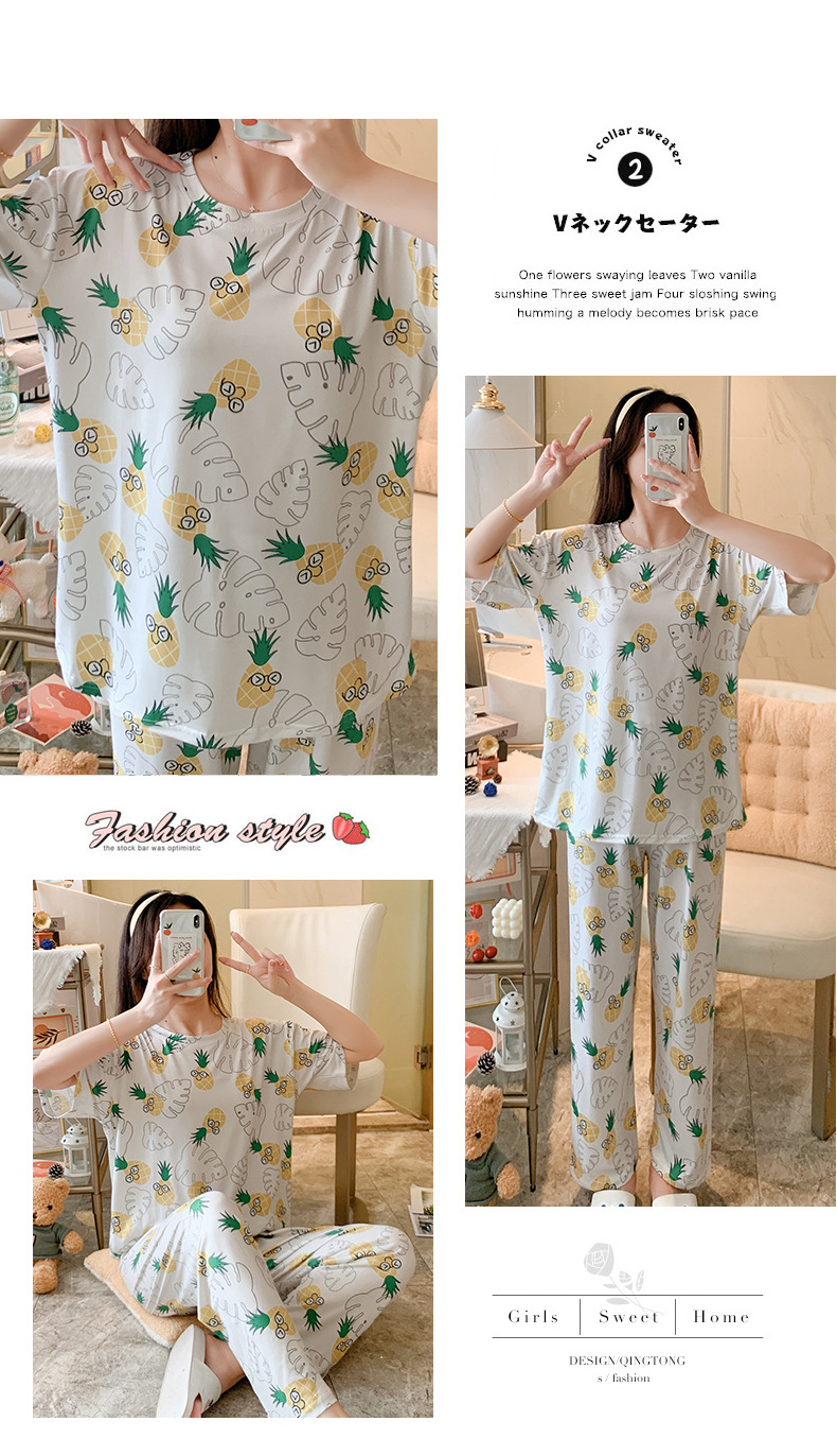 夏季短袖长裤睡衣女士圆领卡通甜美学生家居服套装外贸批发
