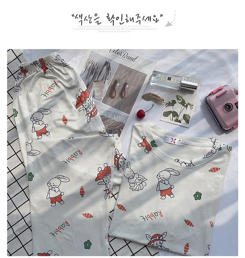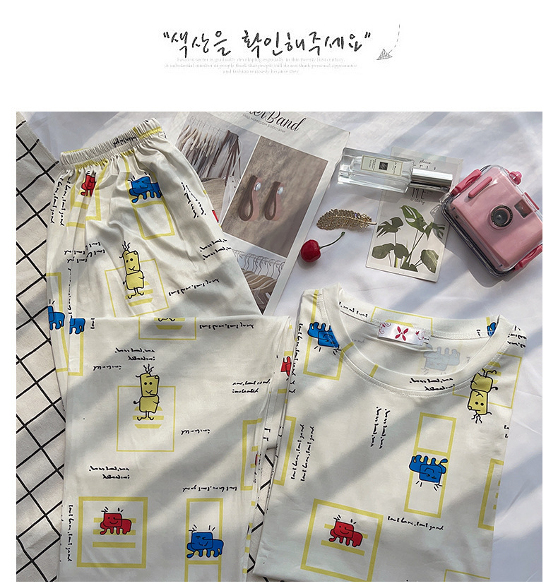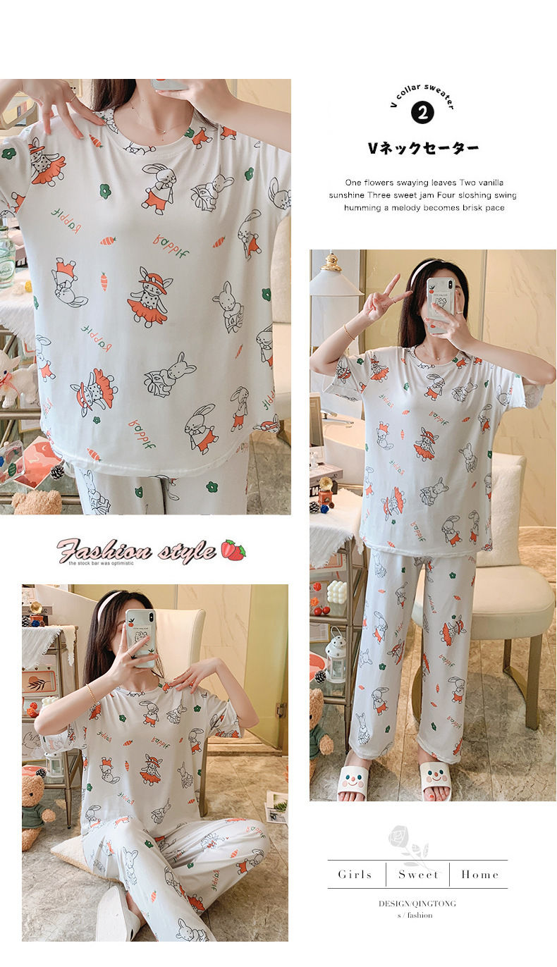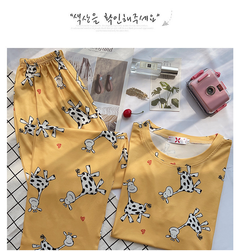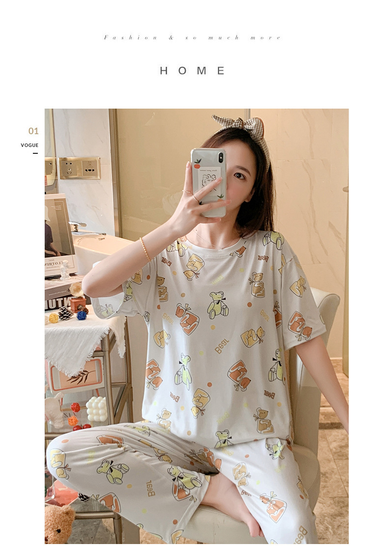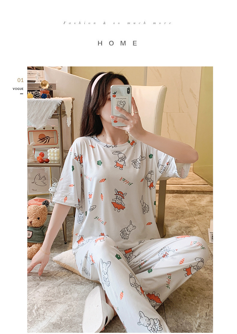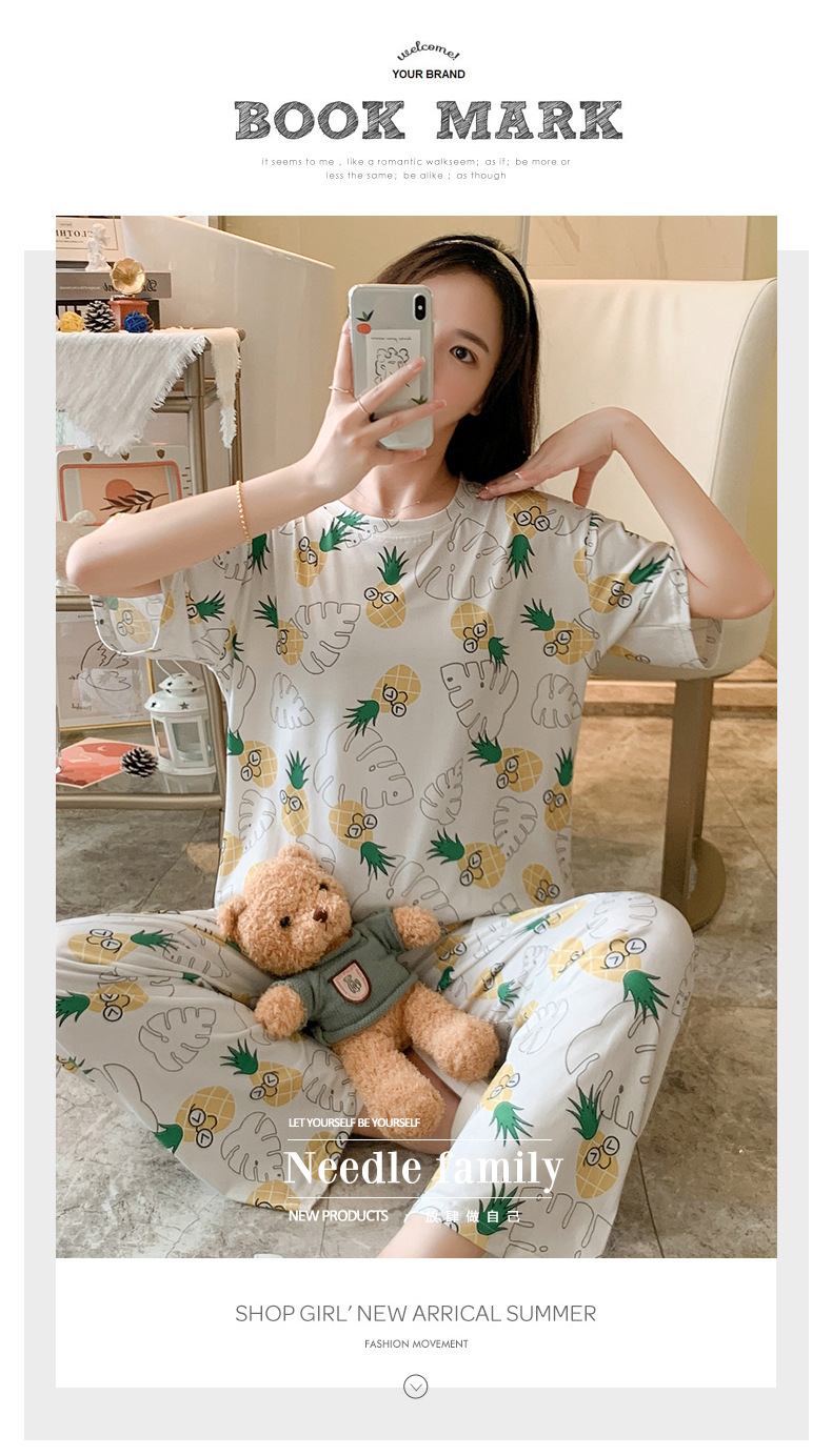 夏季短袖长裤睡衣女士圆领卡通甜美学生家居服套装外贸批发