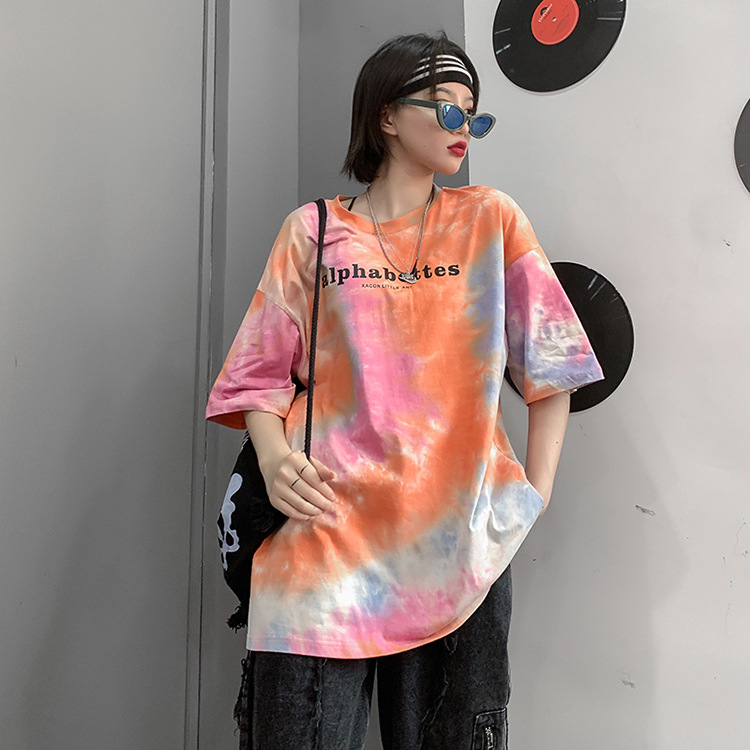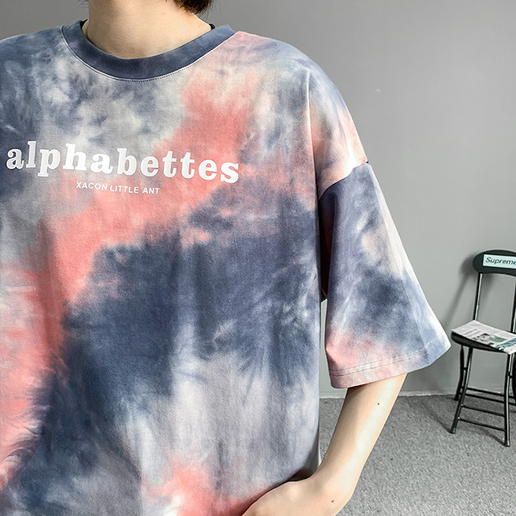 跨境新款韩版扎染印花字母情侣夏短袖t恤女ins潮女装2020宽松上衣