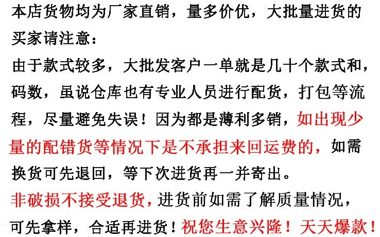 欢迎您的光临,本所售商品均为厂家直销,店铺批发有女装、男装、童装和中老年等衣服销售,薄利多量、长期货源!本店支持货到付款!