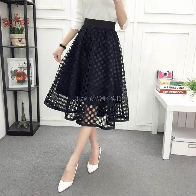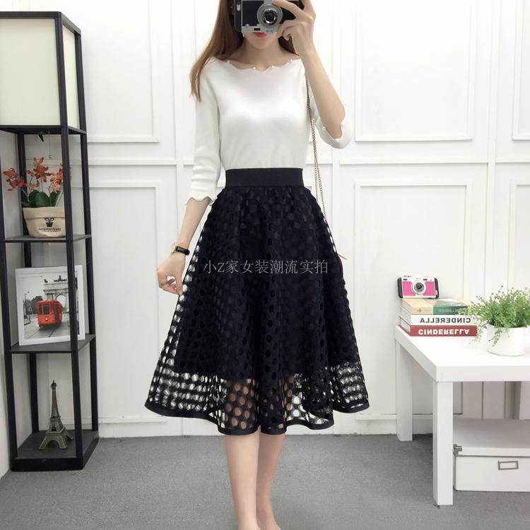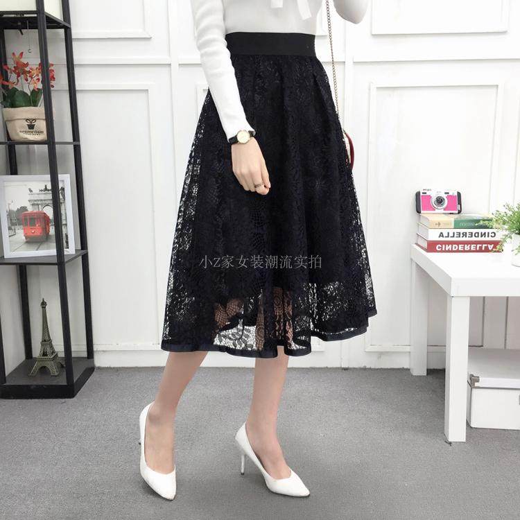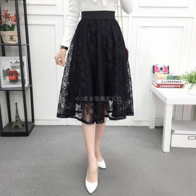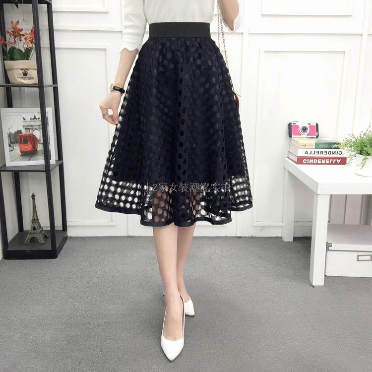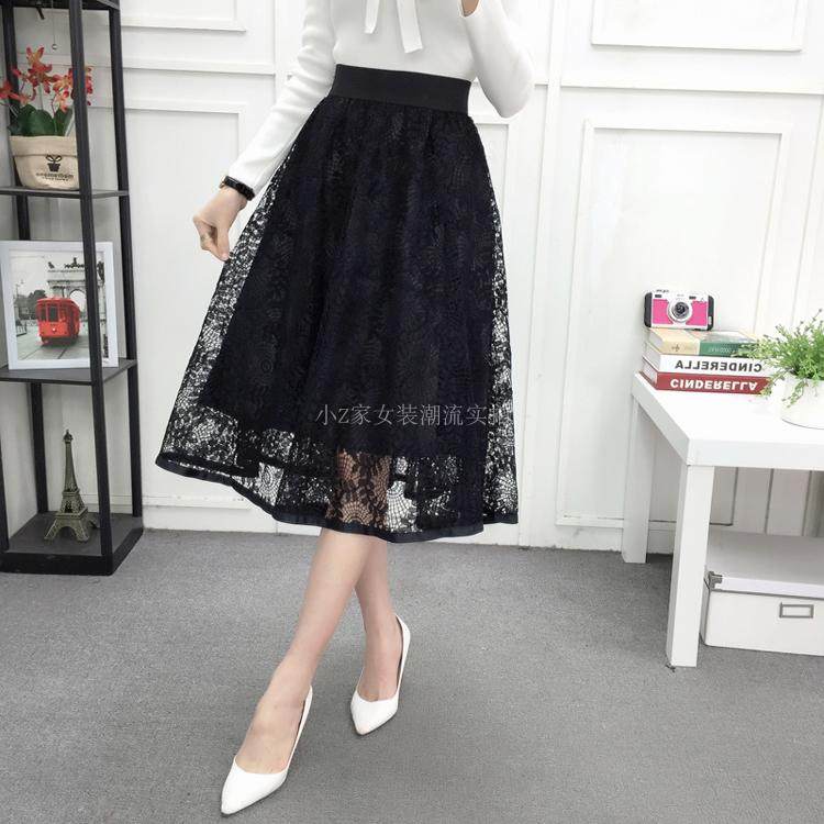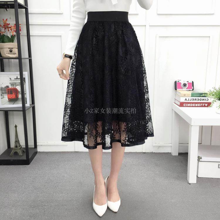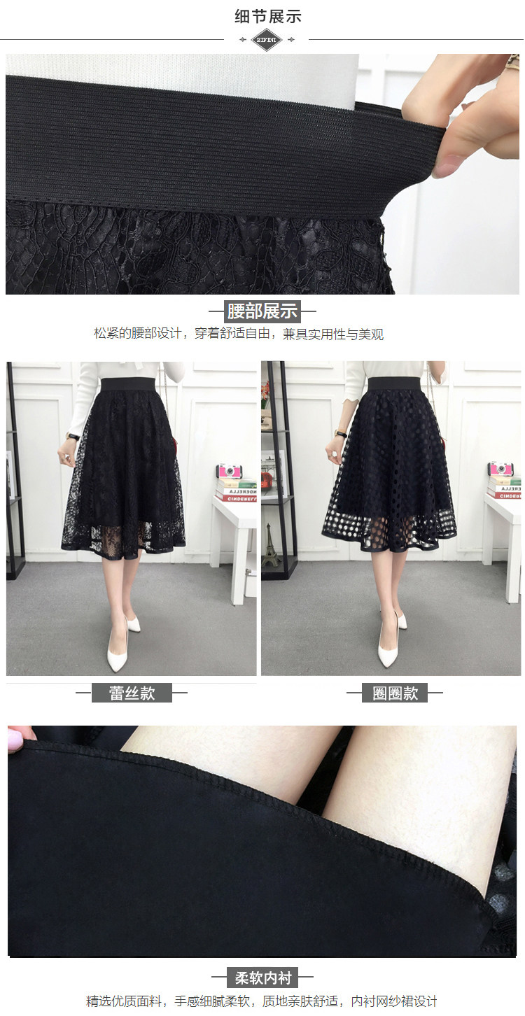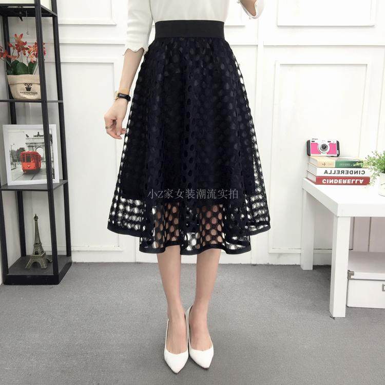 新款百褶网纱蕾丝半身裙中长款纱裙女韩版百搭高腰显瘦a字打底裙