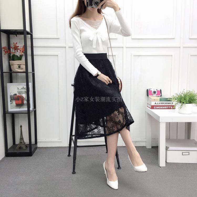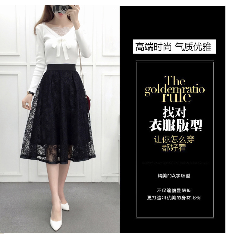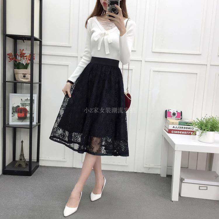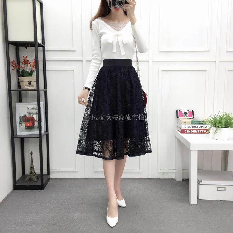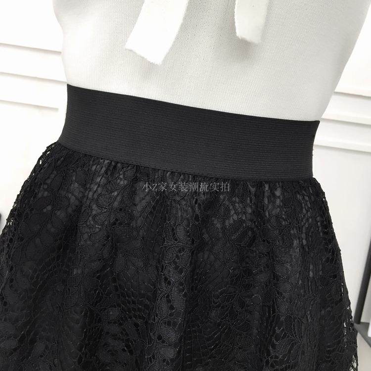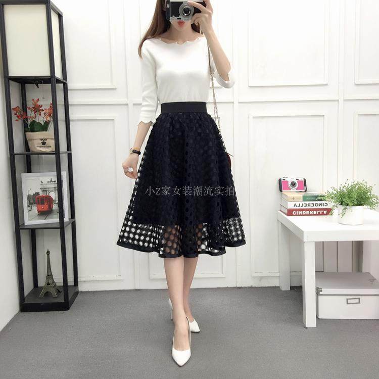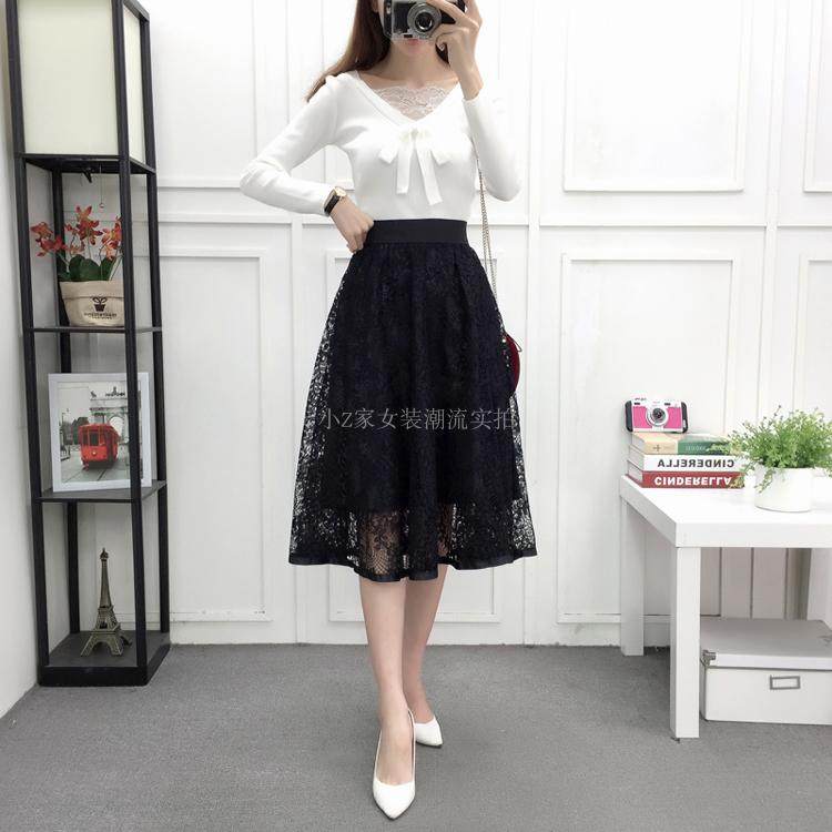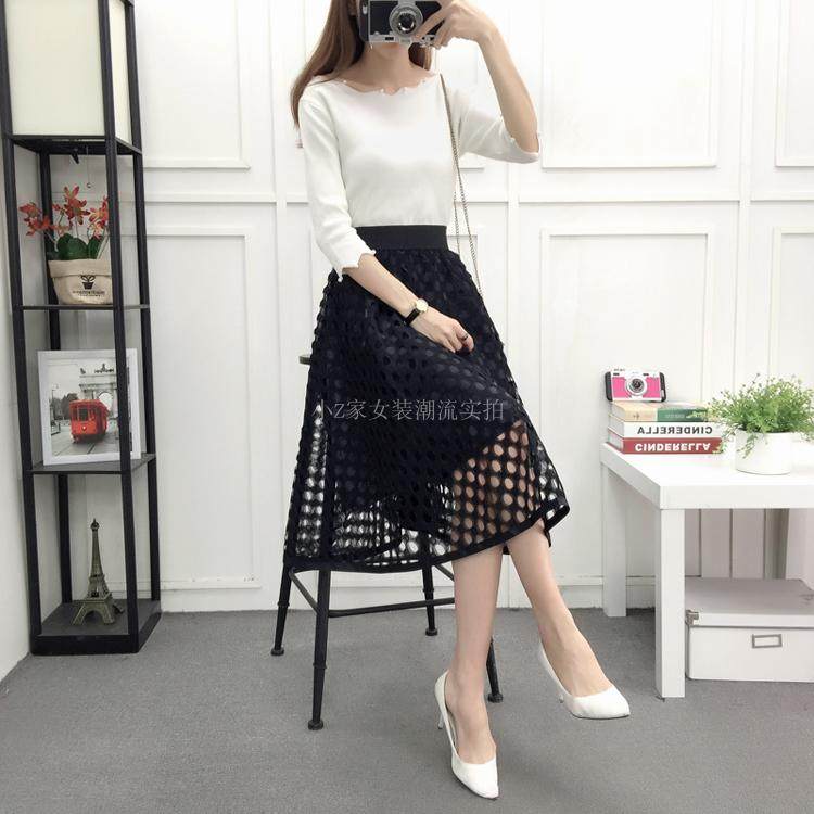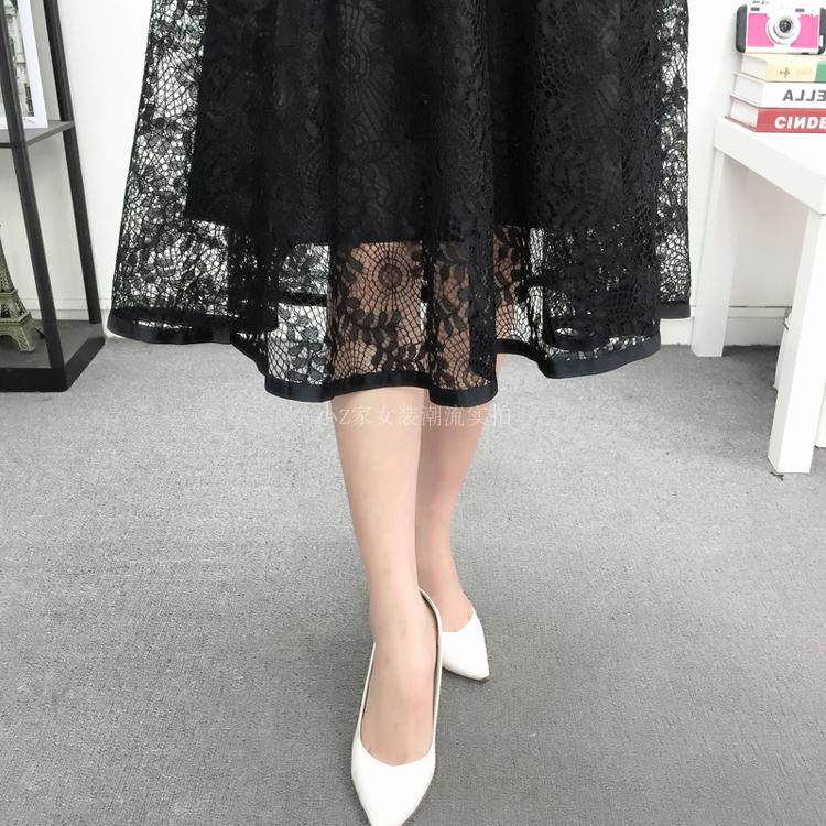 新款百褶网纱蕾丝半身裙中长款纱裙女韩版百搭高腰显瘦a字打底裙