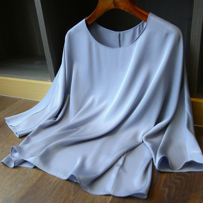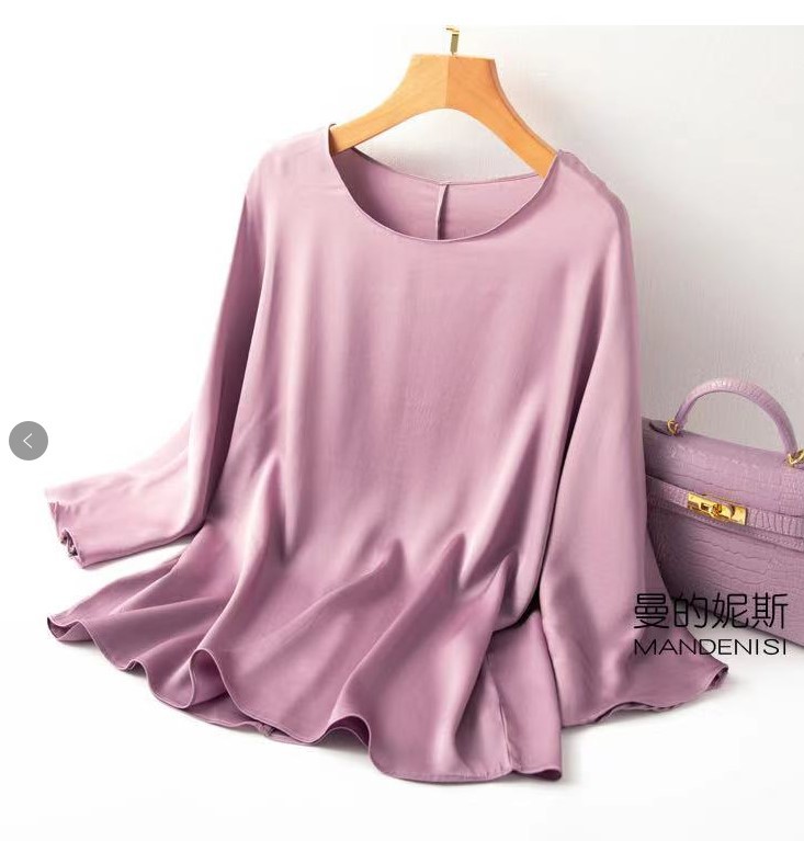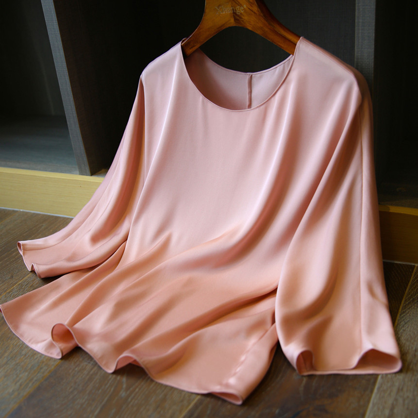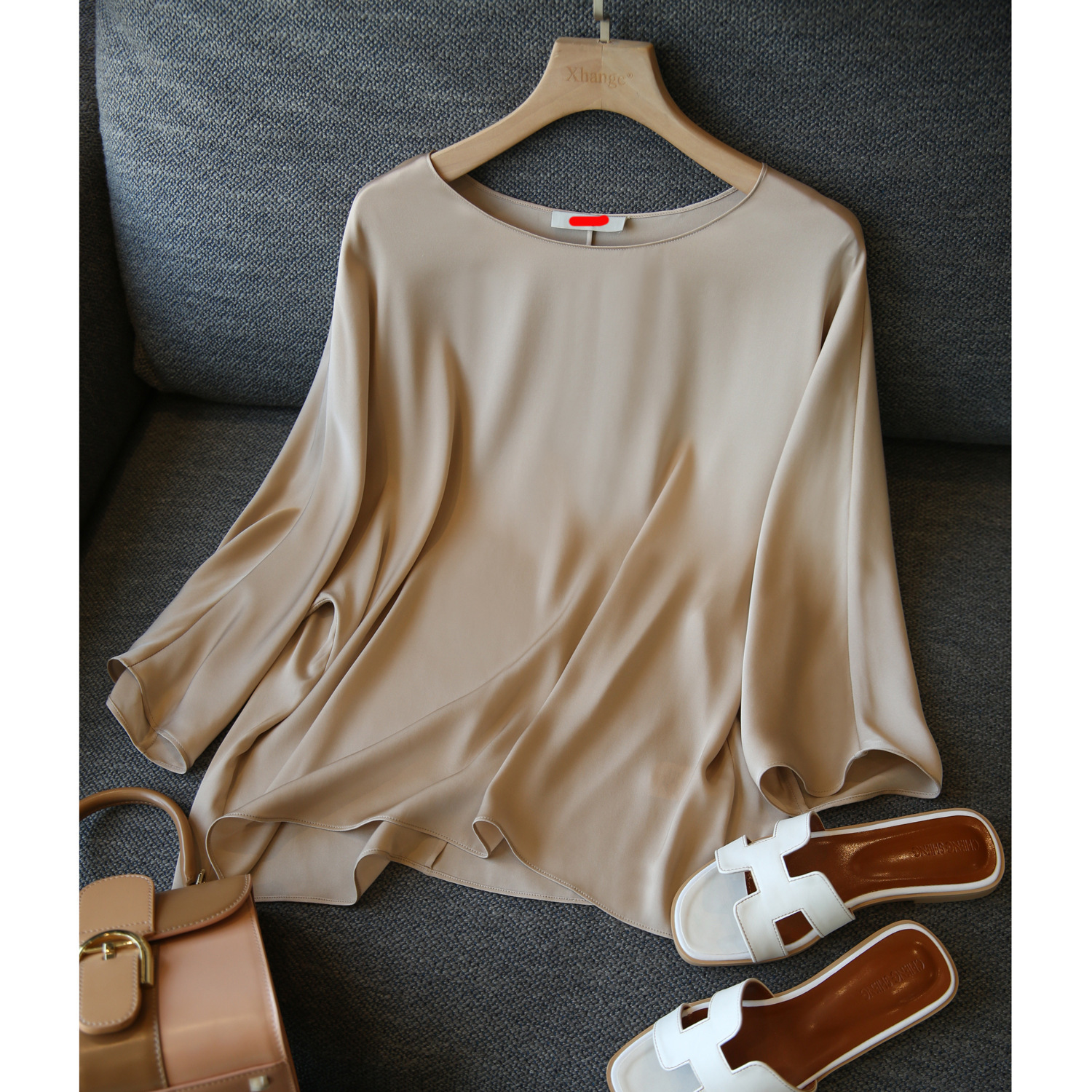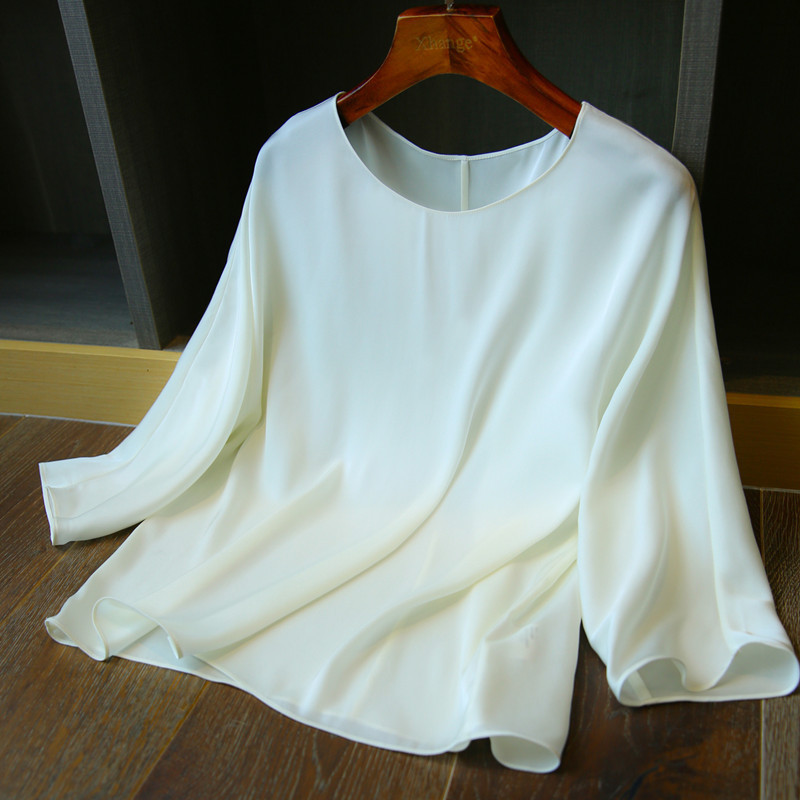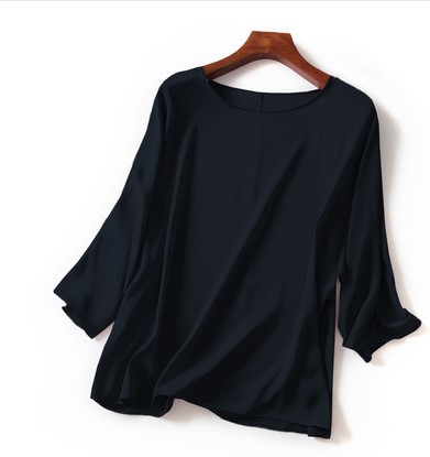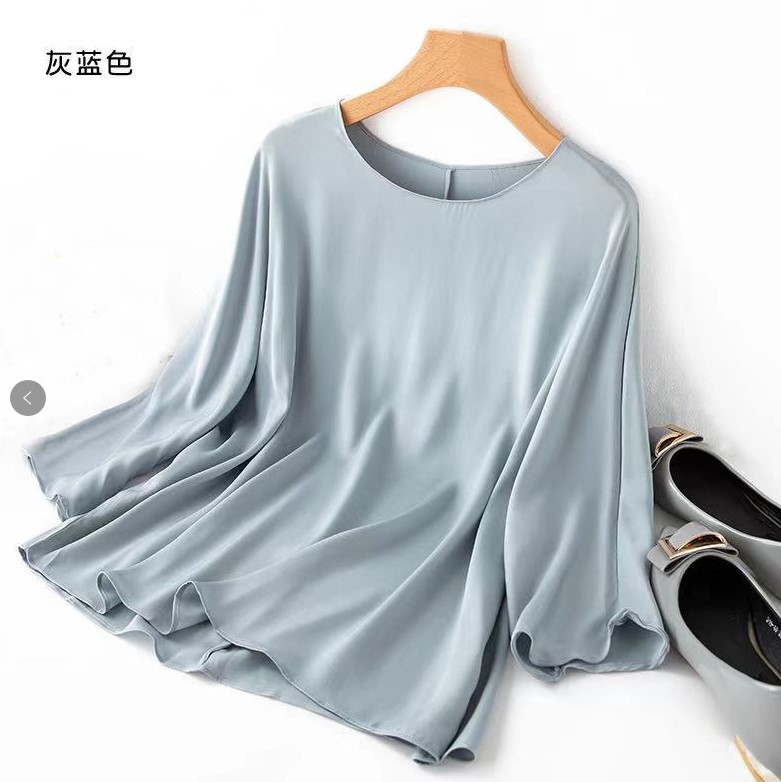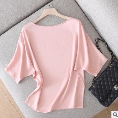 大码上衣夏女装潮仿真丝七分短袖女宽松圆领纯色百搭雪纺