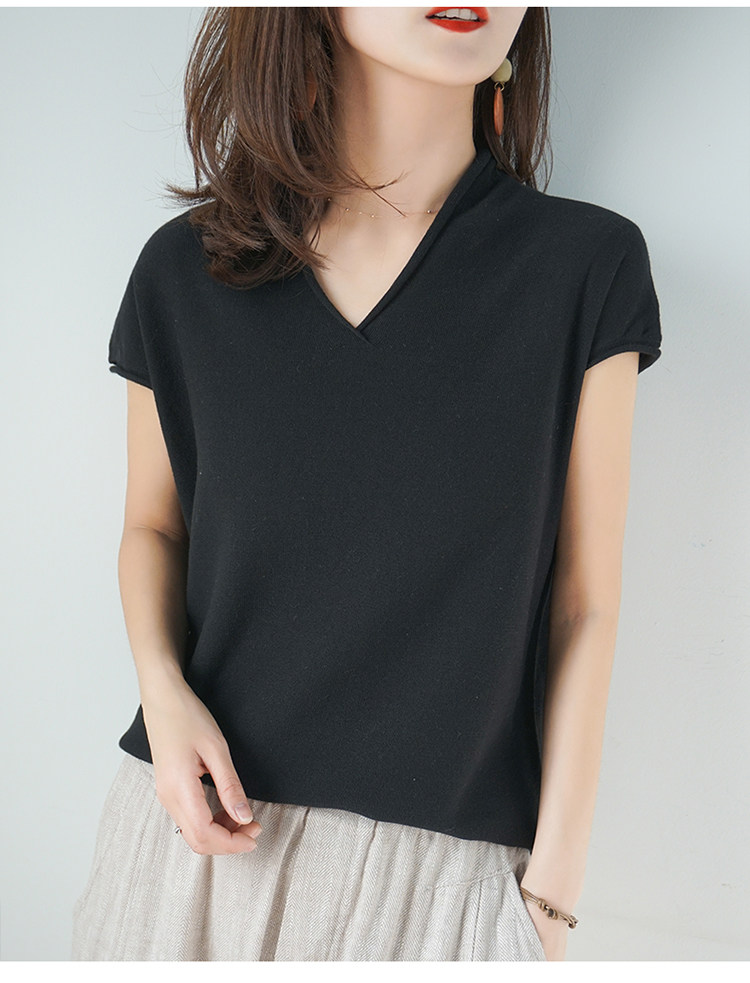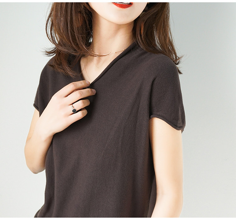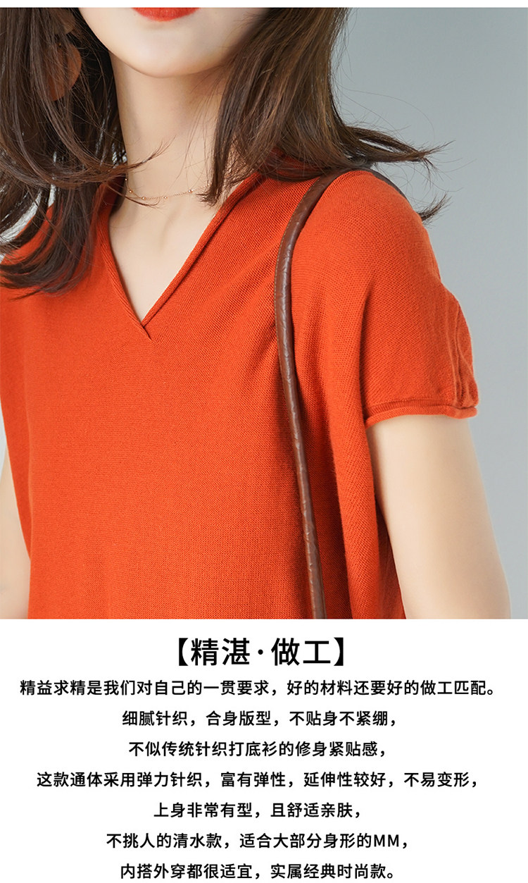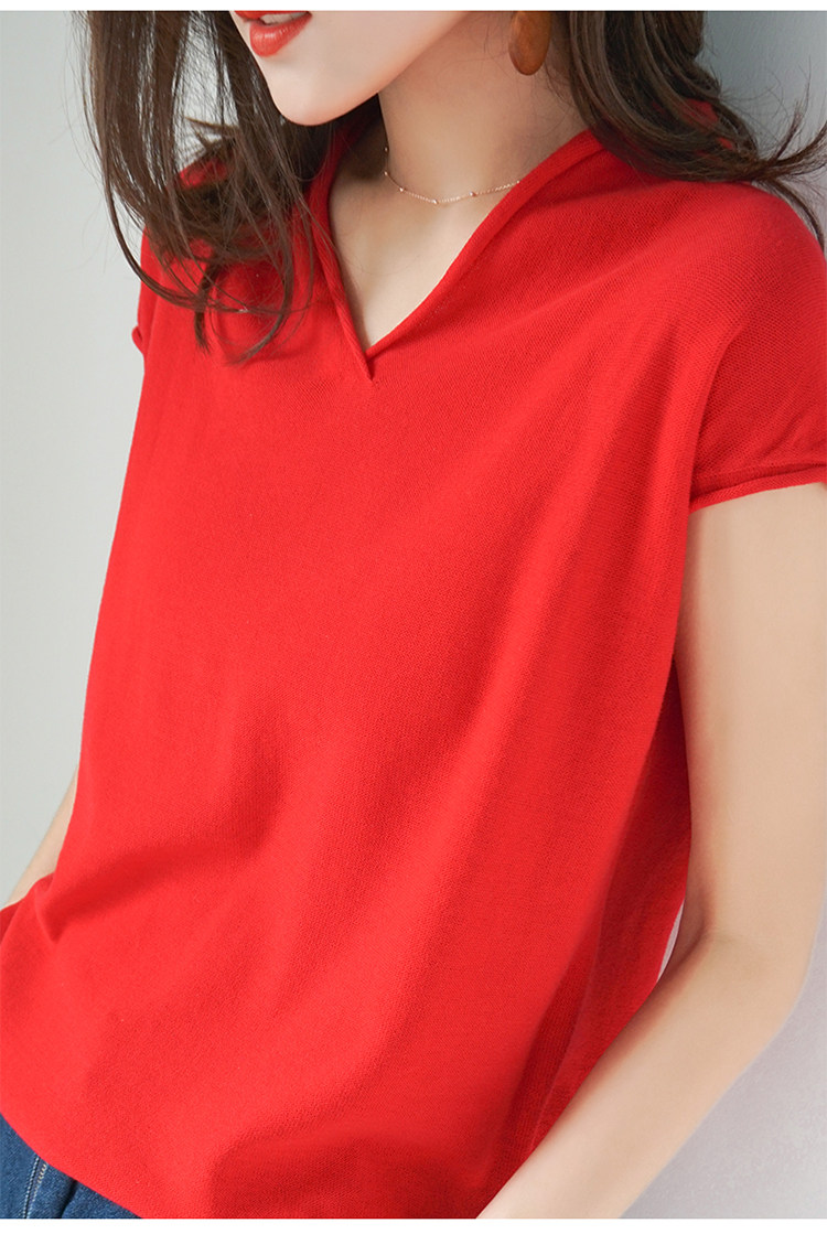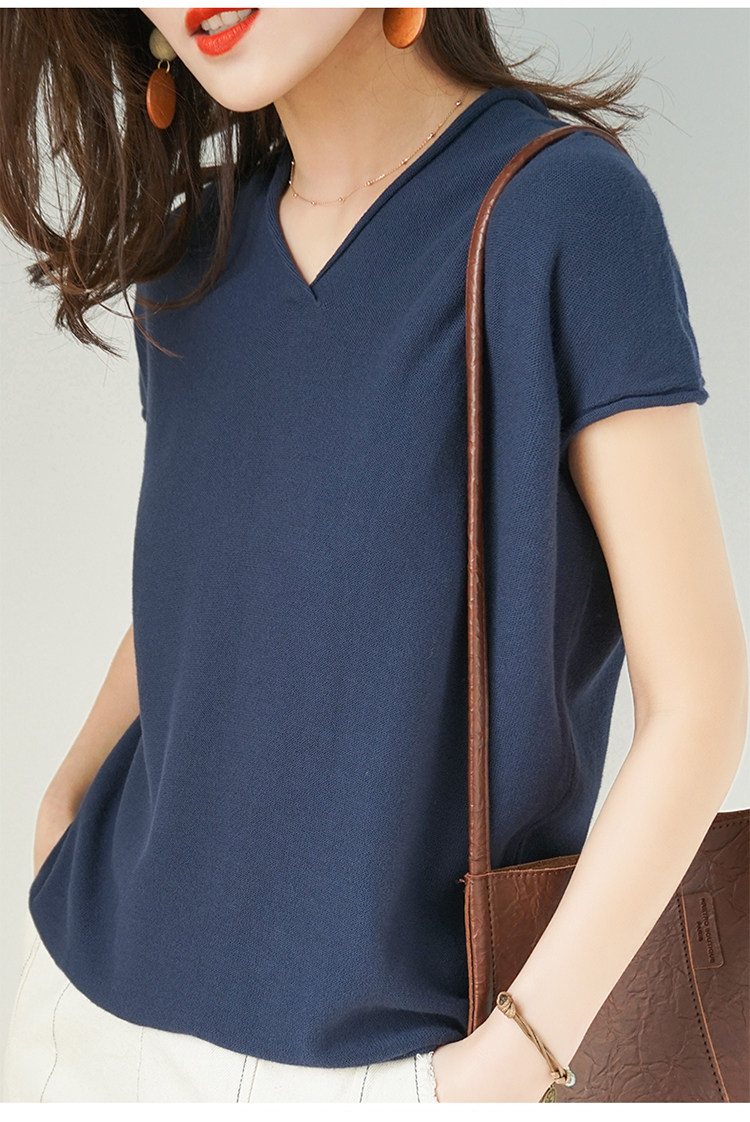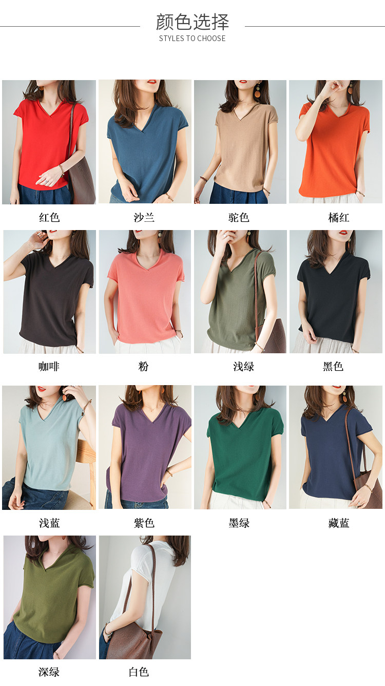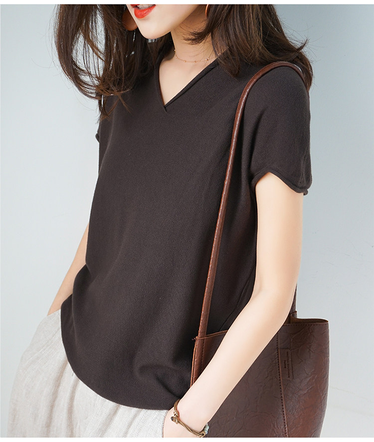 夏装新款棉麻针织短袖女宽松T恤半袖V领纯色女装上衣打底衫潮