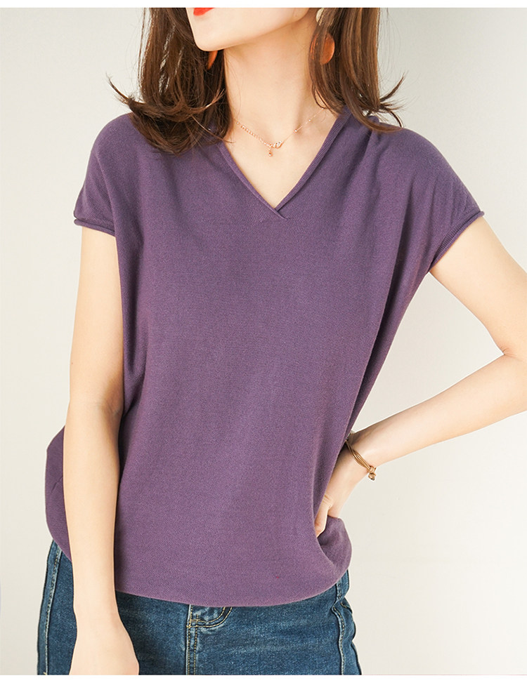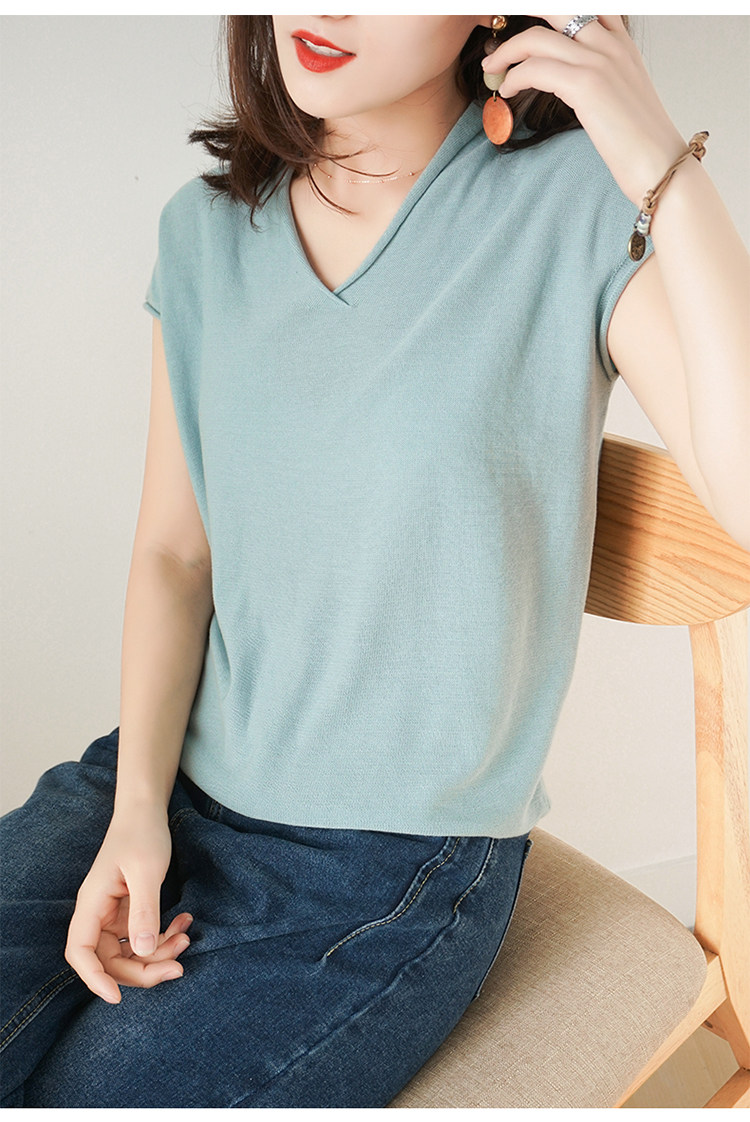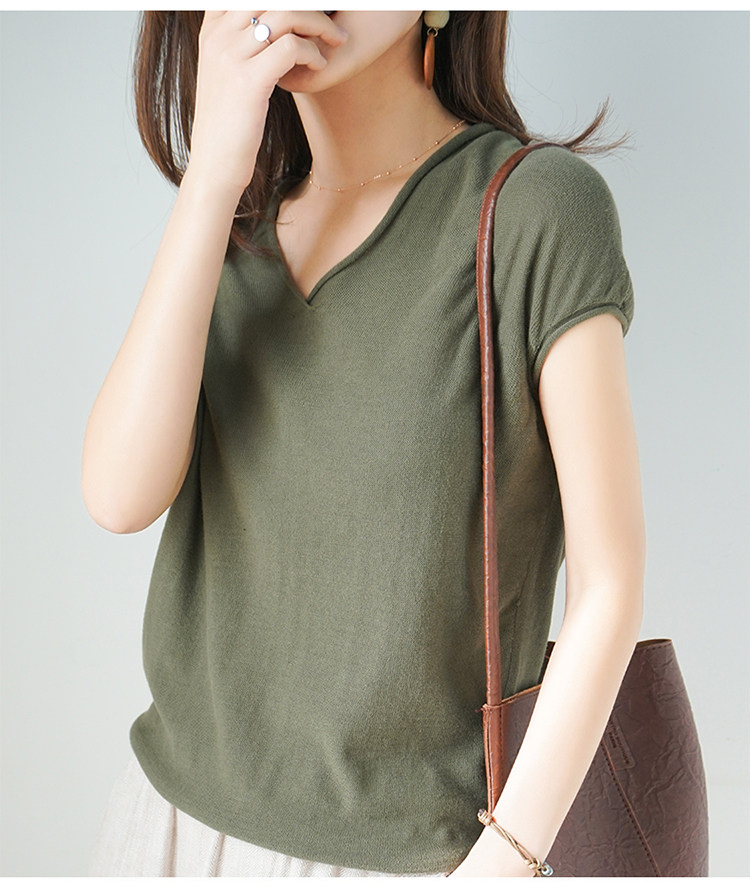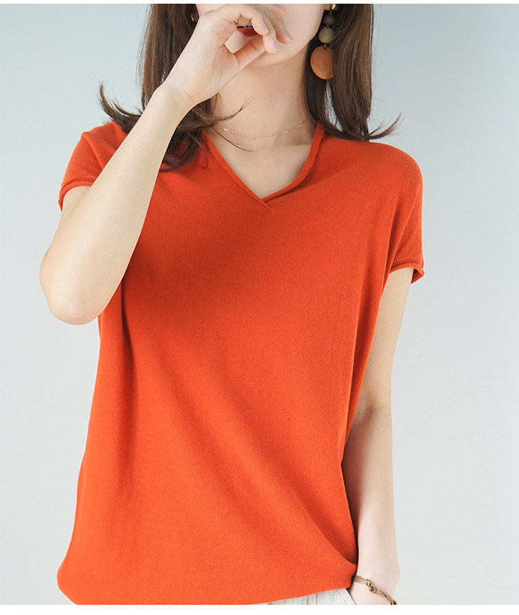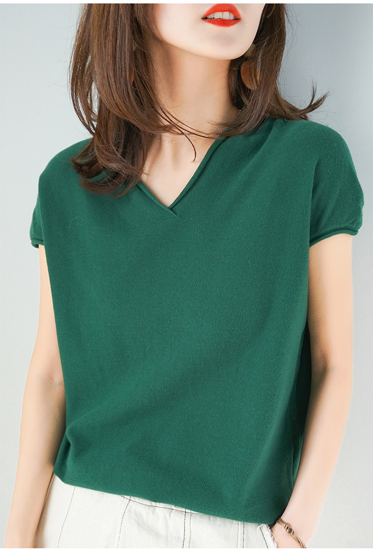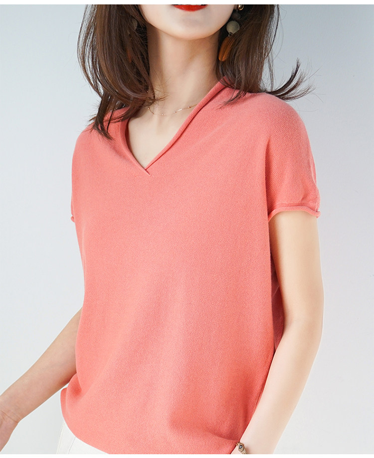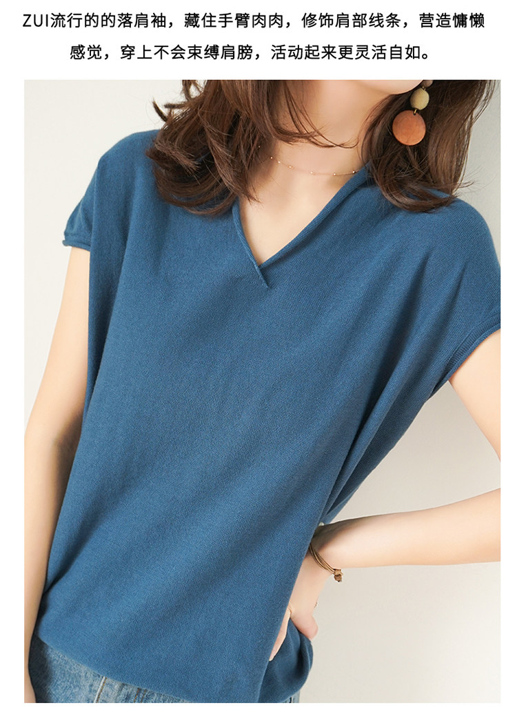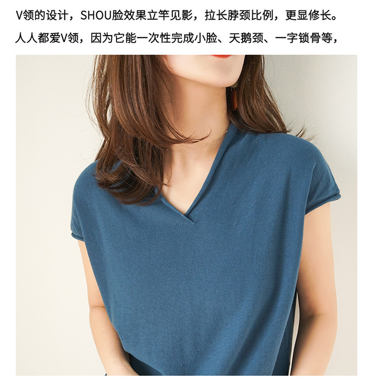 夏装新款棉麻针织短袖女宽松T恤半袖V领纯色女装上衣打底衫潮