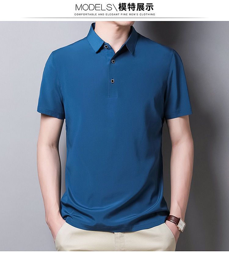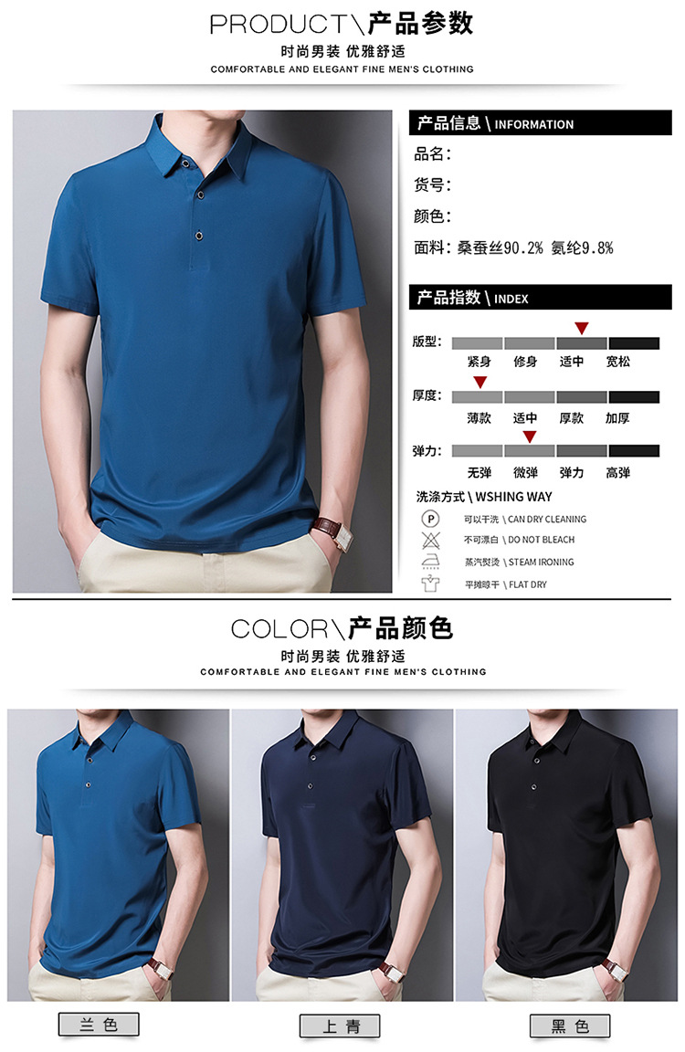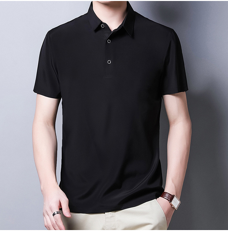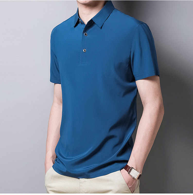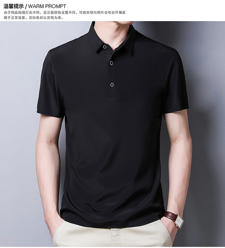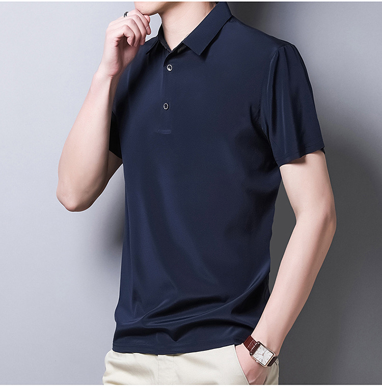 2024夏季新款中青年男士短袖T恤桑蚕丝纯色翻领半袖丝绸体恤衫潮