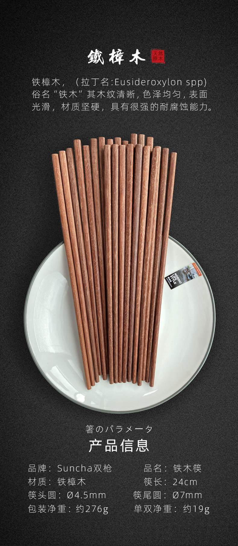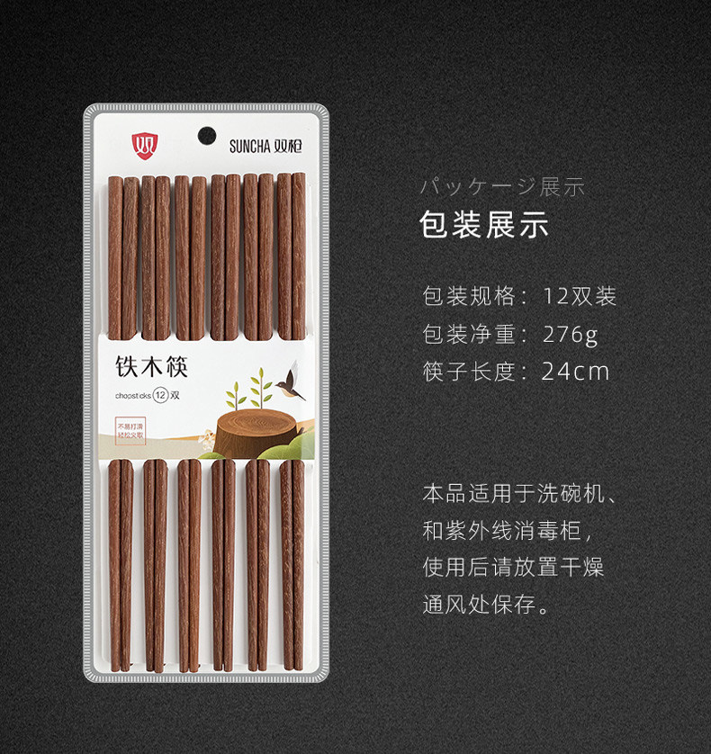 双枪筷子中式铁木筷家用实木筷子防霉耐用铁樟木筷加量12双装