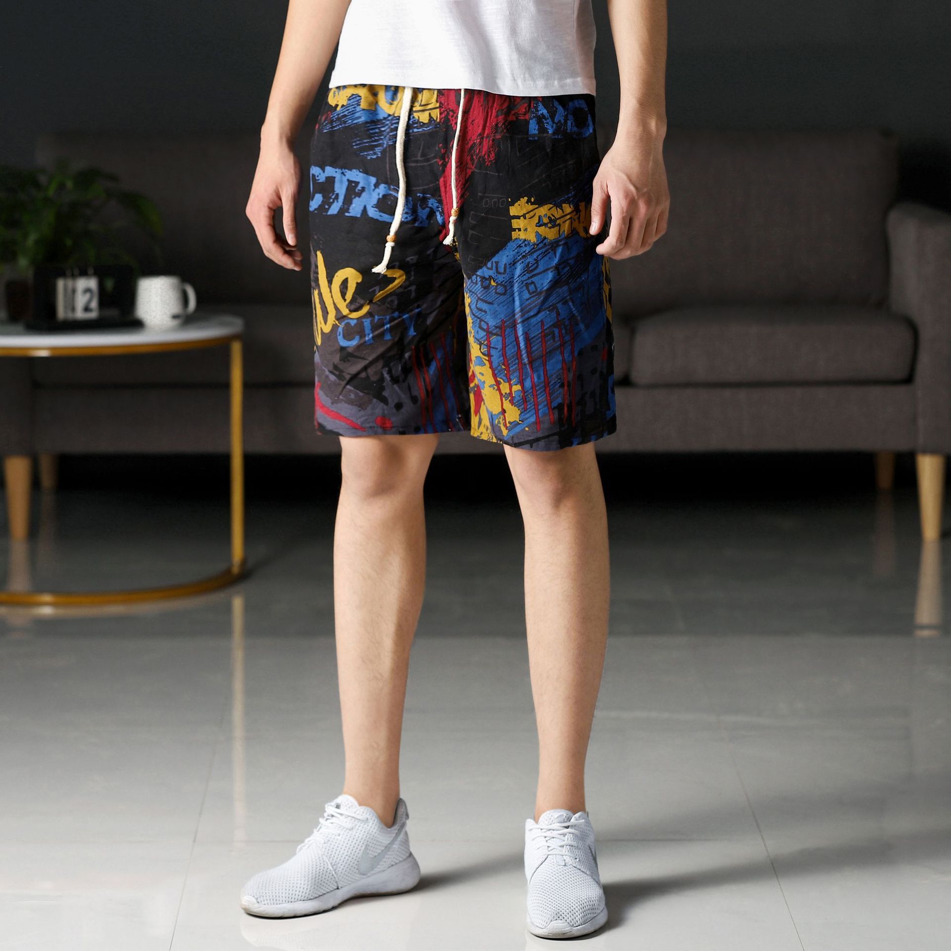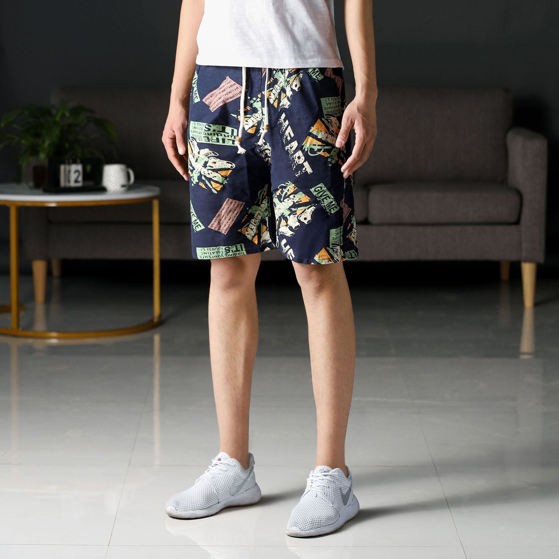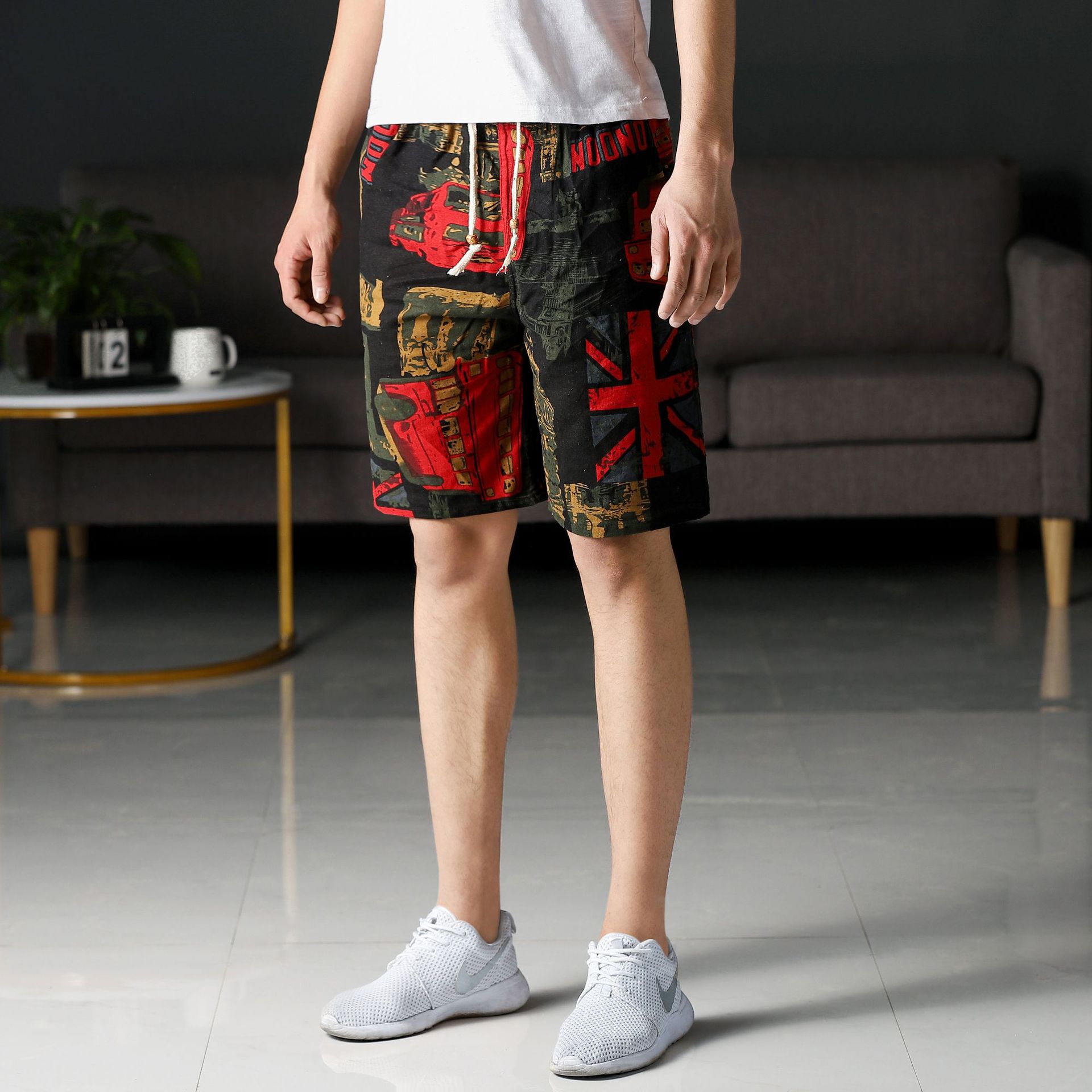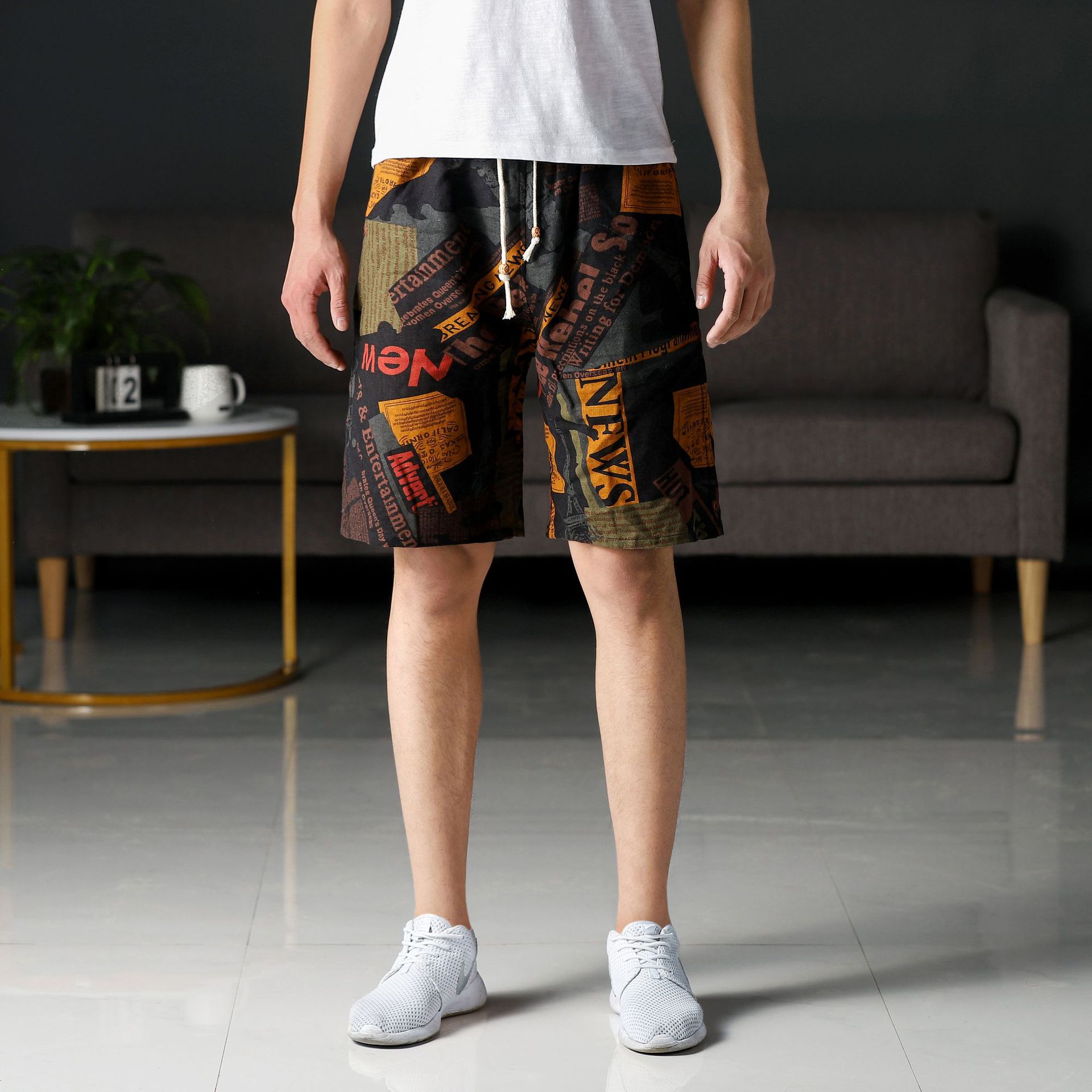 男士短袖沙滩裤夏季印花宽松大裤衩运动五分裤棉亚麻时尚休闲短裤