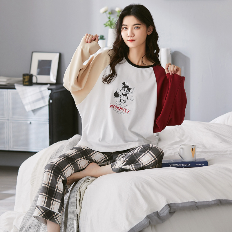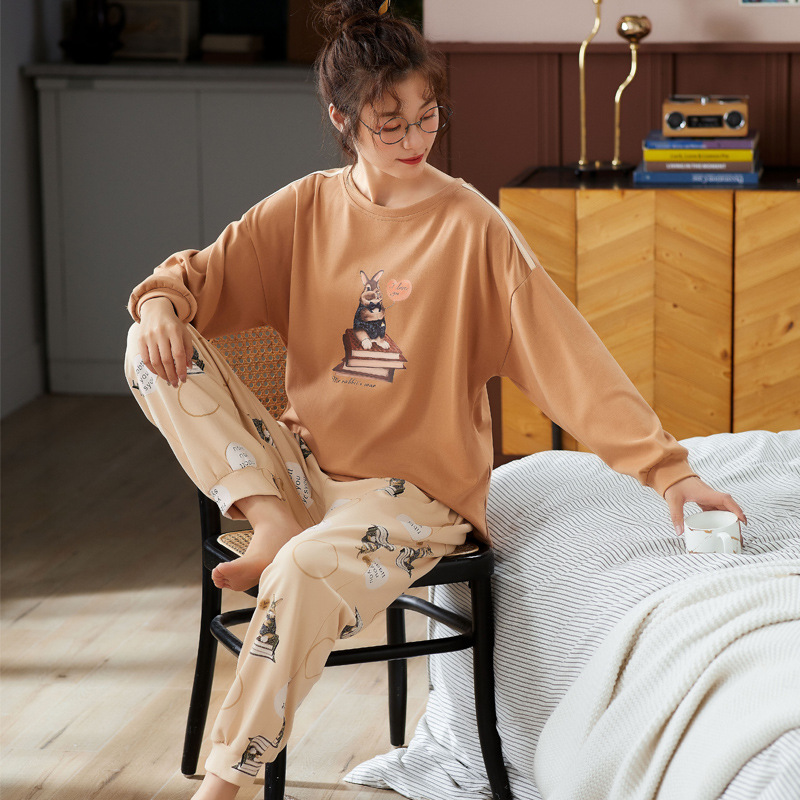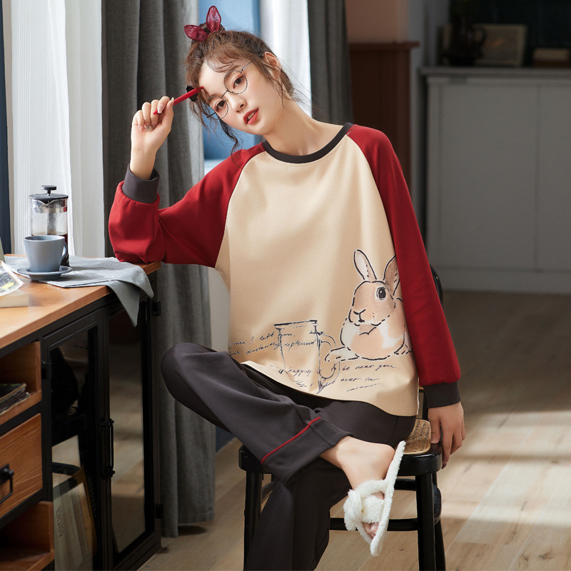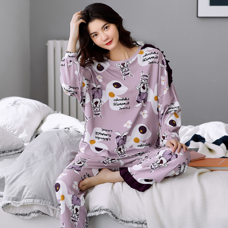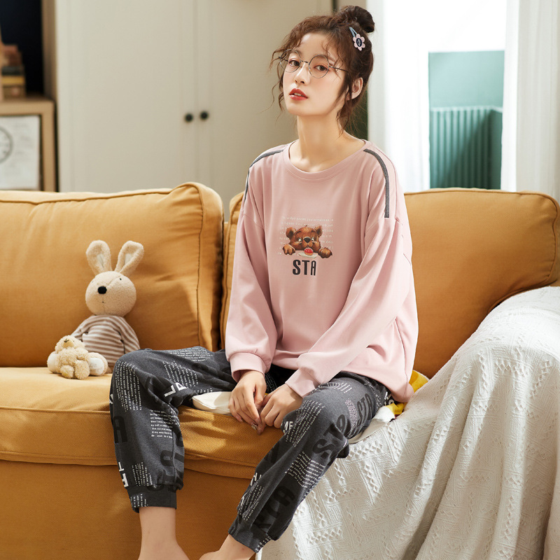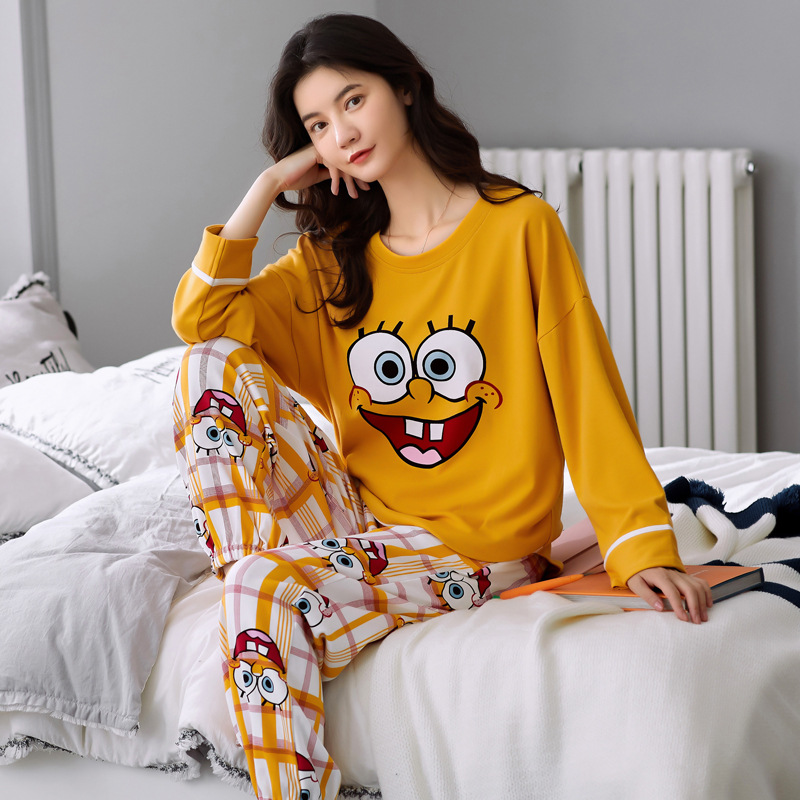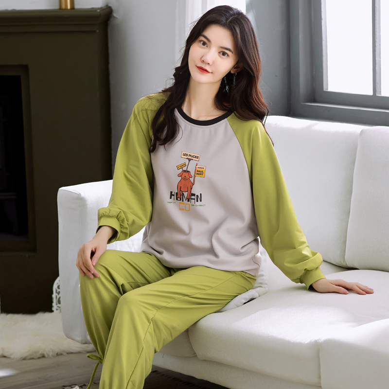 卡通睡衣女秋棉质套装春秋冬季圆领套头长袖宽松加大码家居服学生