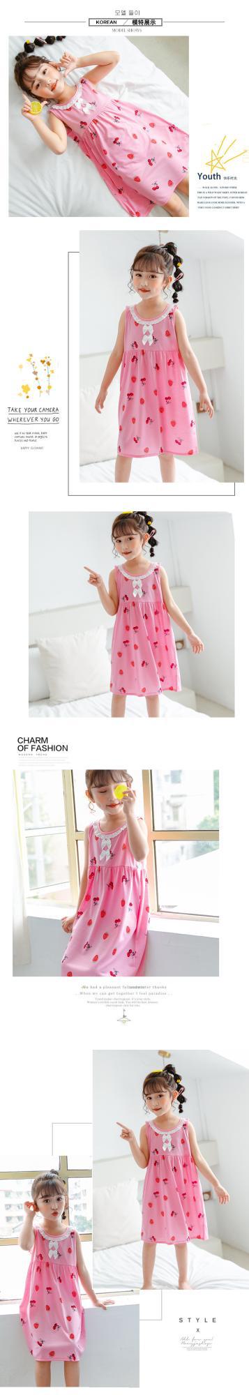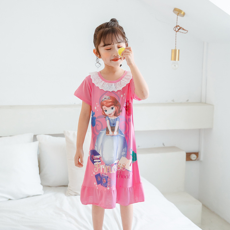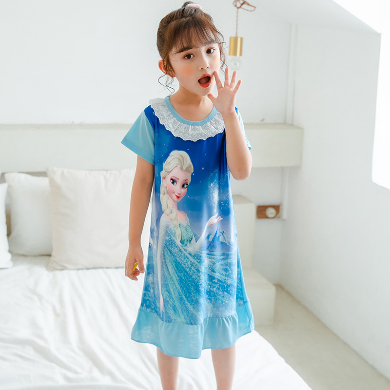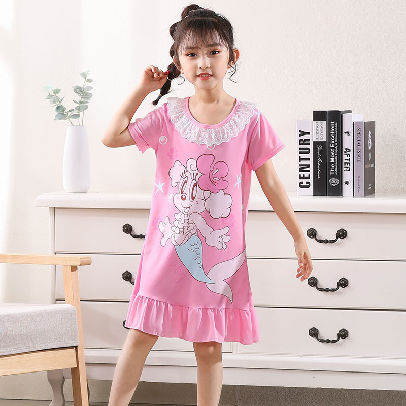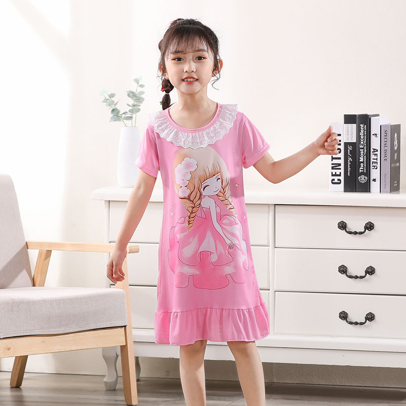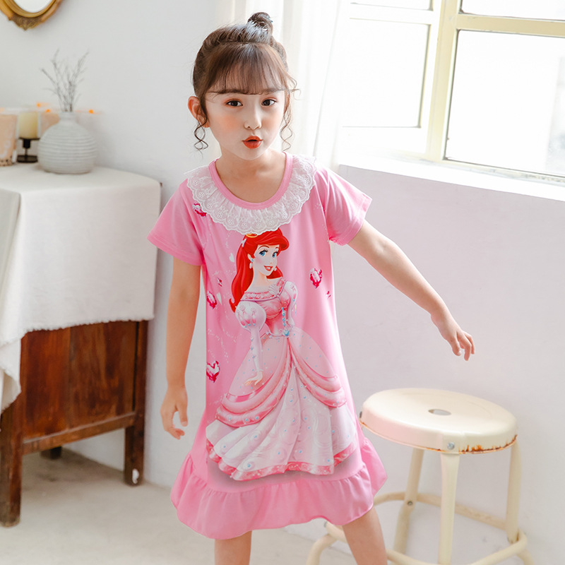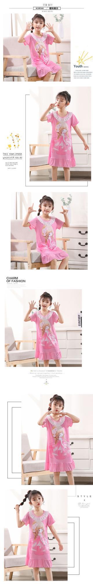 新款夏季薄款儿童睡裙 圆领短袖荷叶边公主印花甜美女童家居服