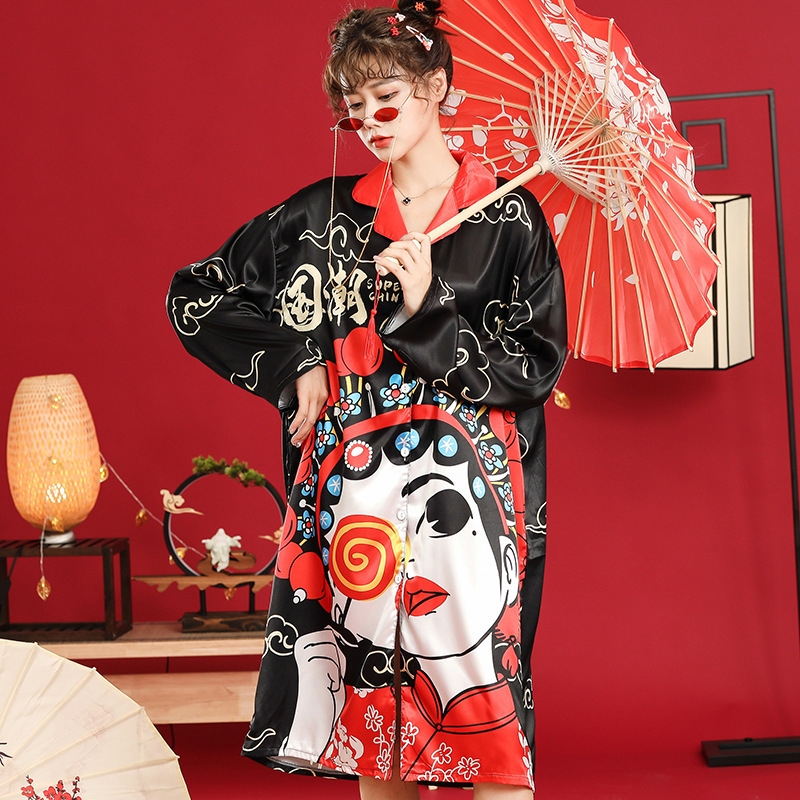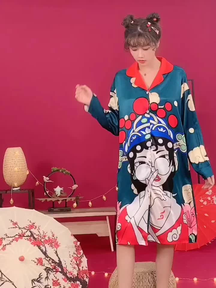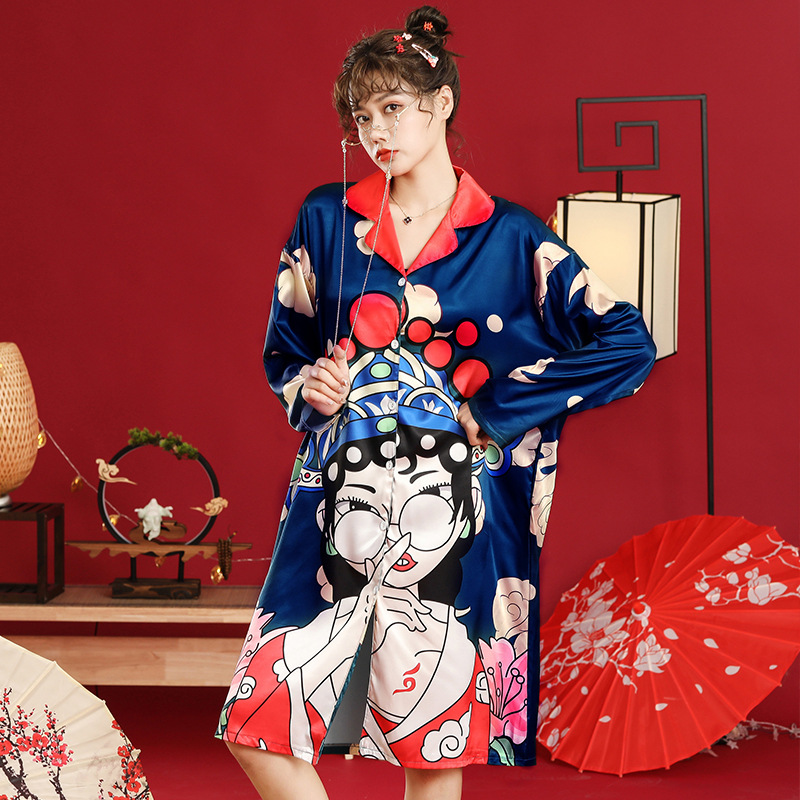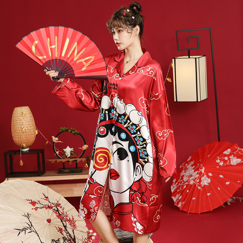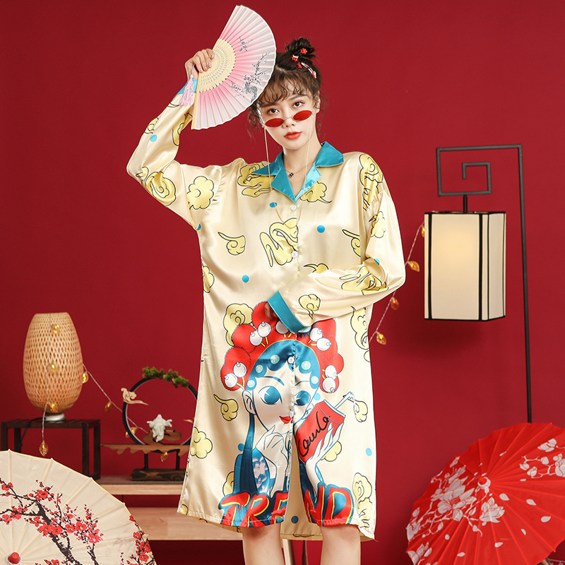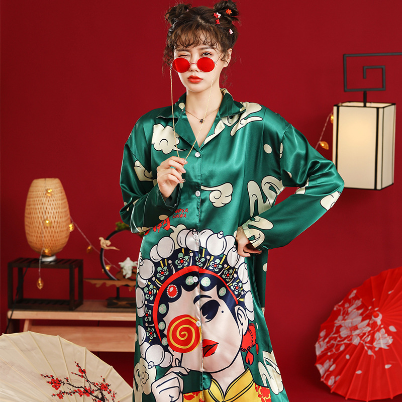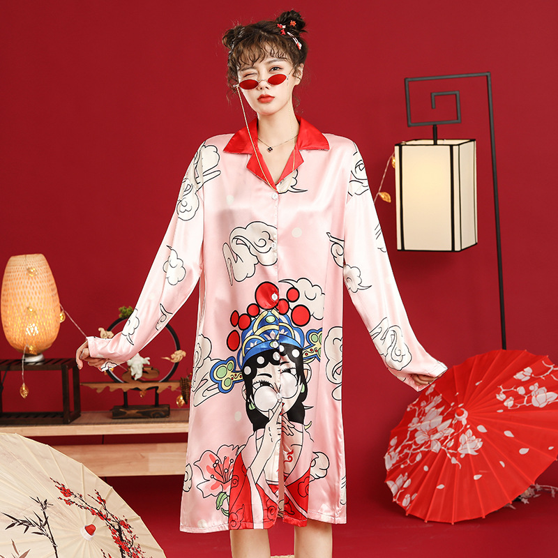 国潮睡衣中国风京剧脸谱秋季冰雪丝女明星同款长袖睡裙宽松家居服