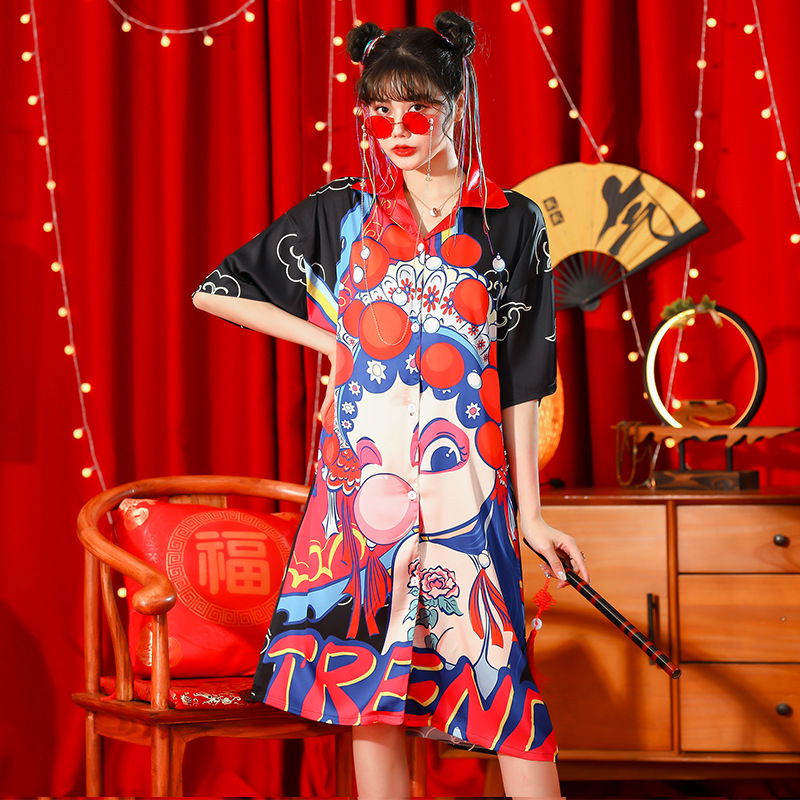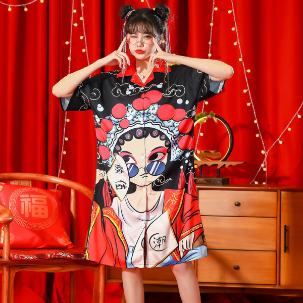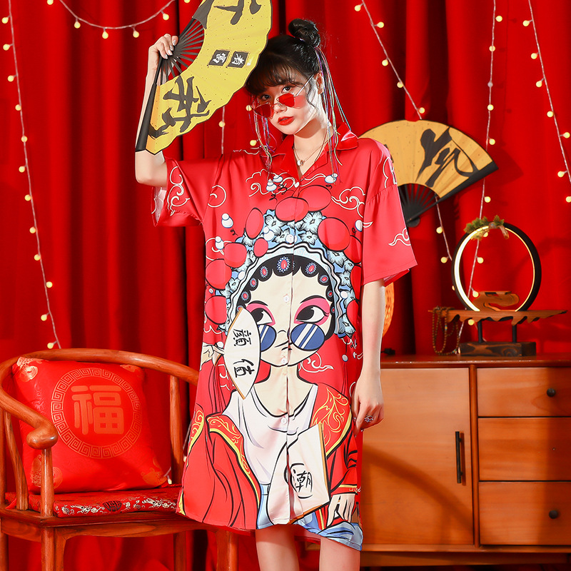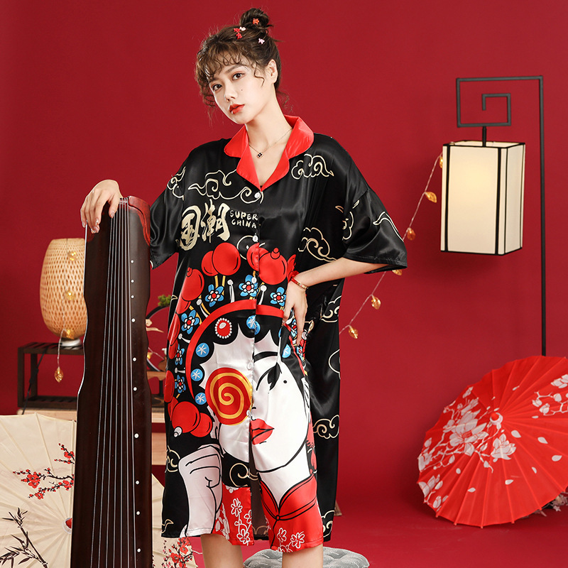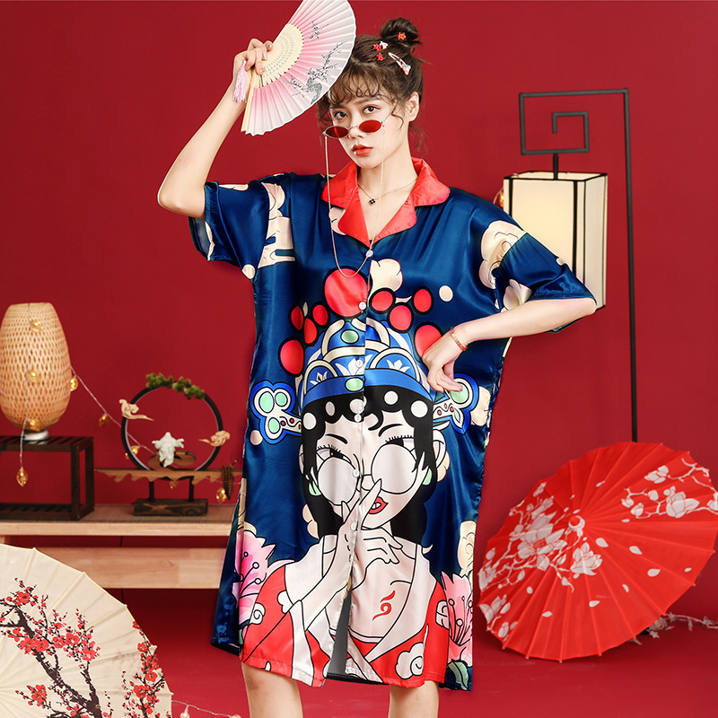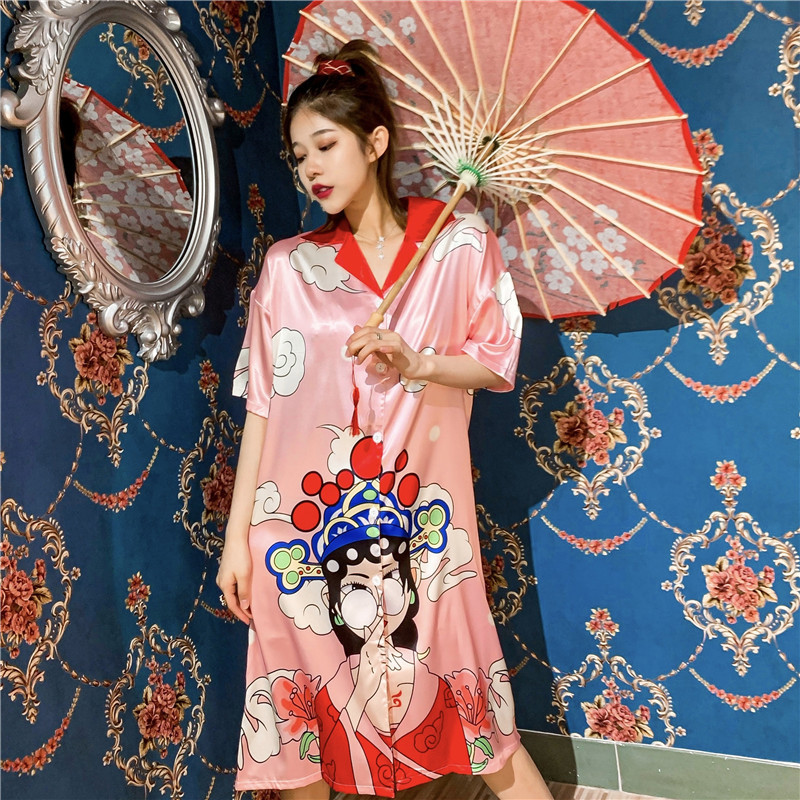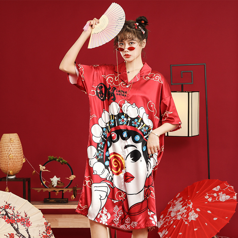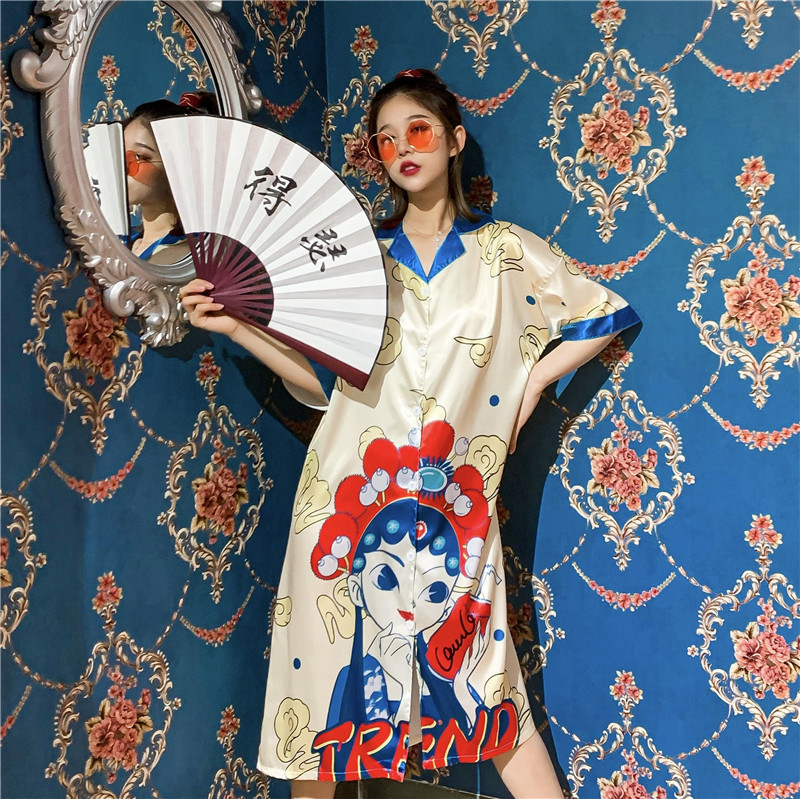 睡衣女夏冰丝国潮夏季仿真丝短袖睡裙子中国风学生可爱宽松家居服