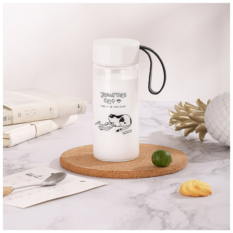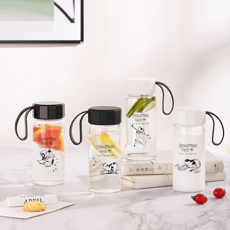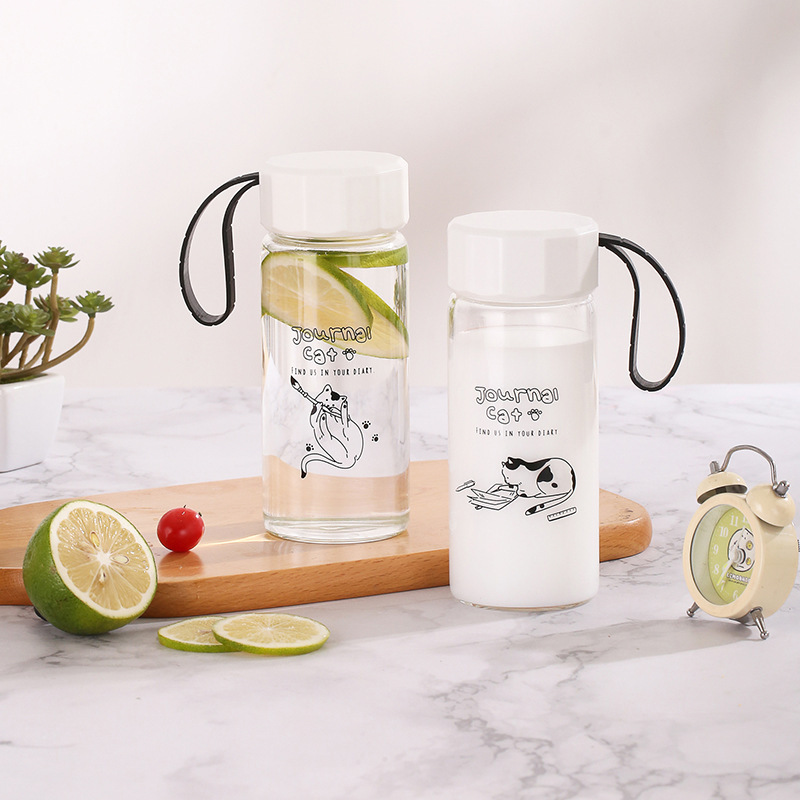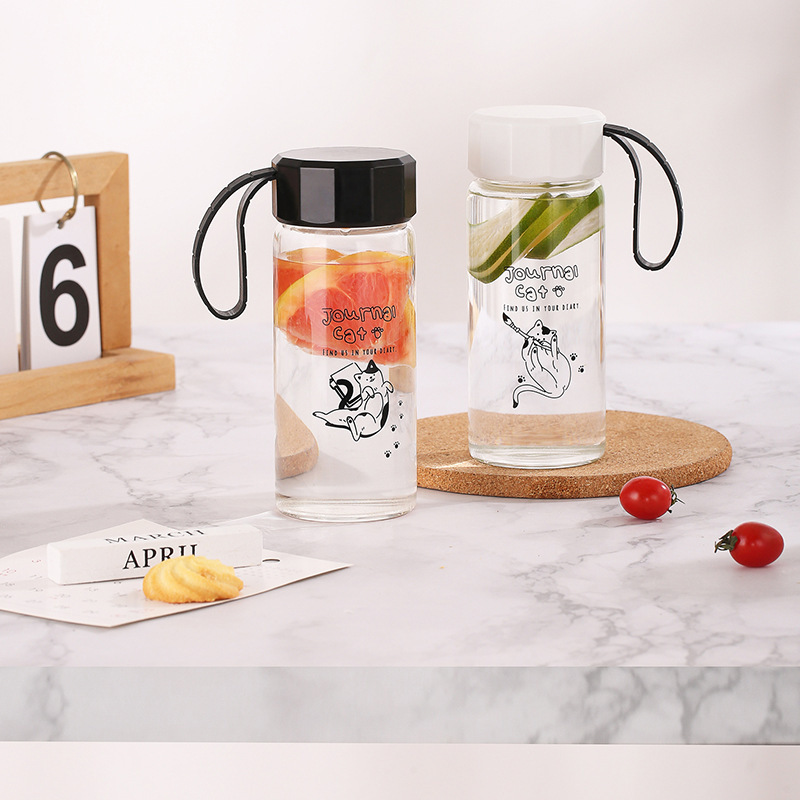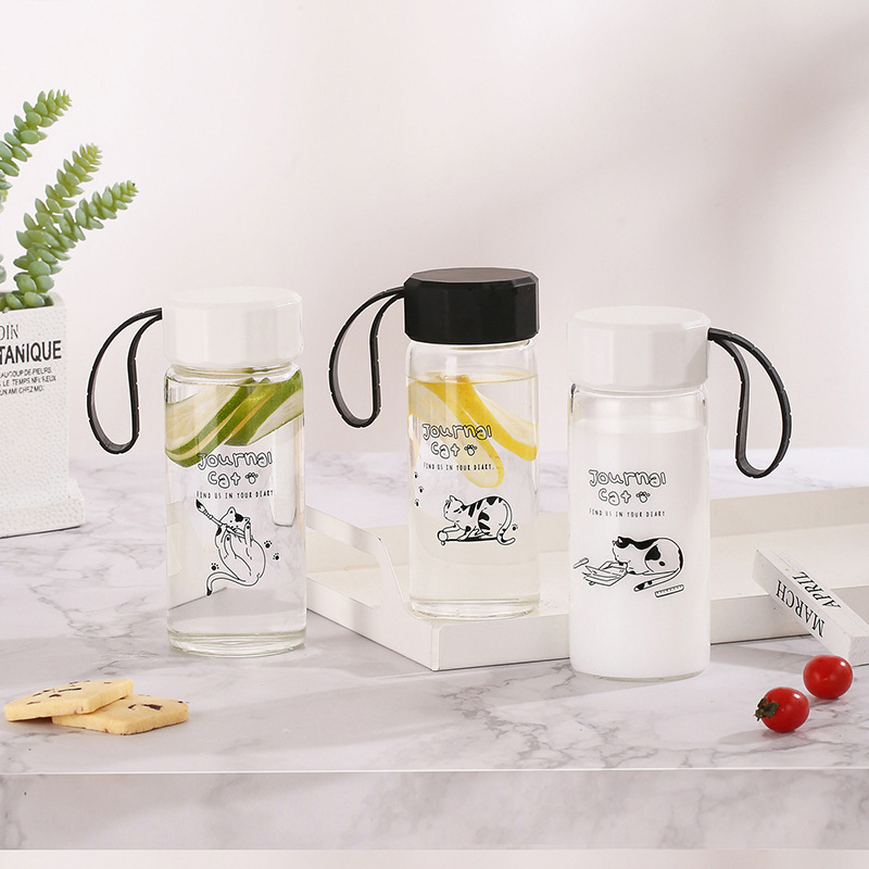 新款高硼硅玻璃杯户外卡通猫咪可爱耐高温硅胶提手水杯可定制