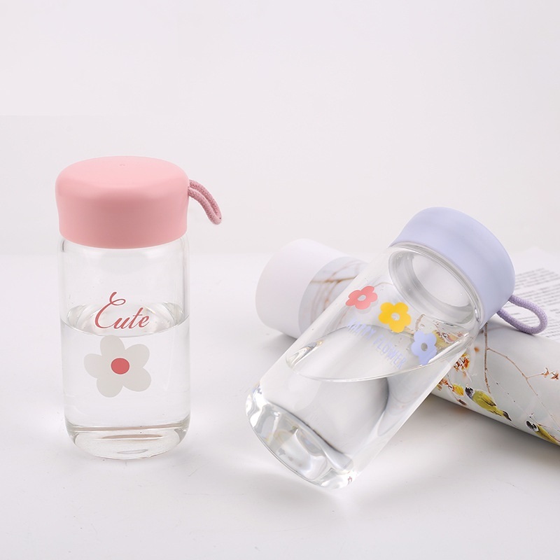 创意韩版小碎花提手玻璃杯情侣简约水杯户外便携随手杯