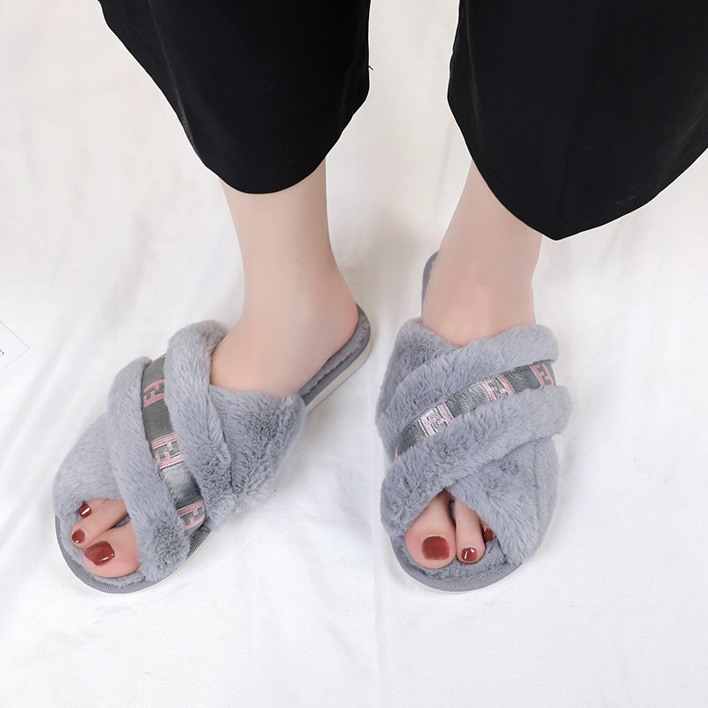 新款秋冬季时尚棉拖鞋女居家室内防滑平底交叉毛毛拖鞋