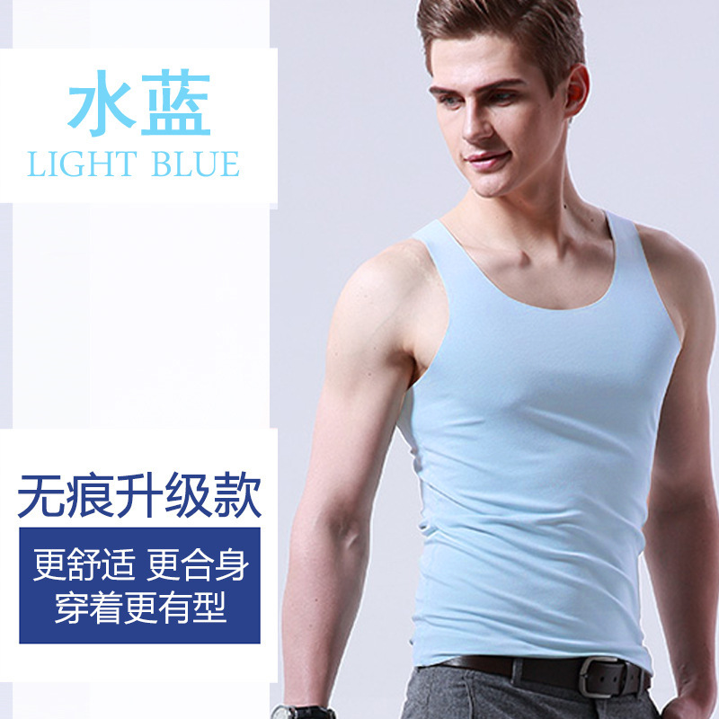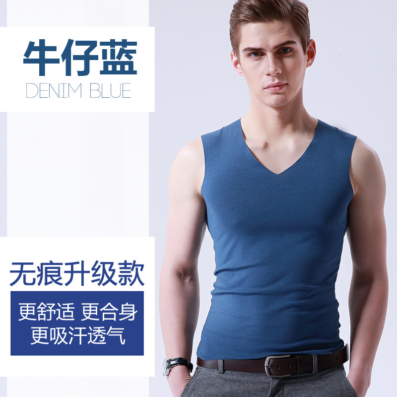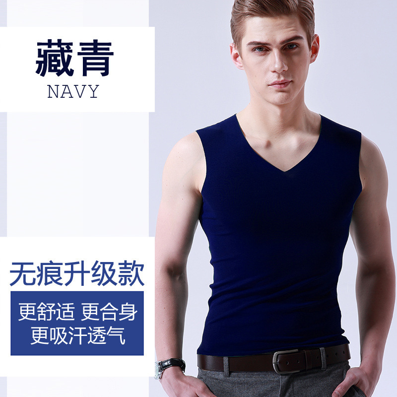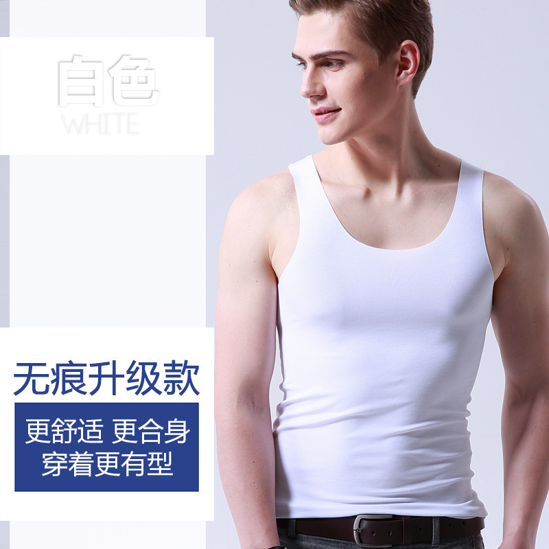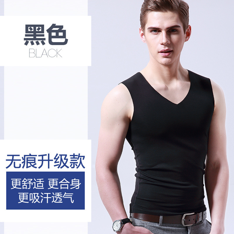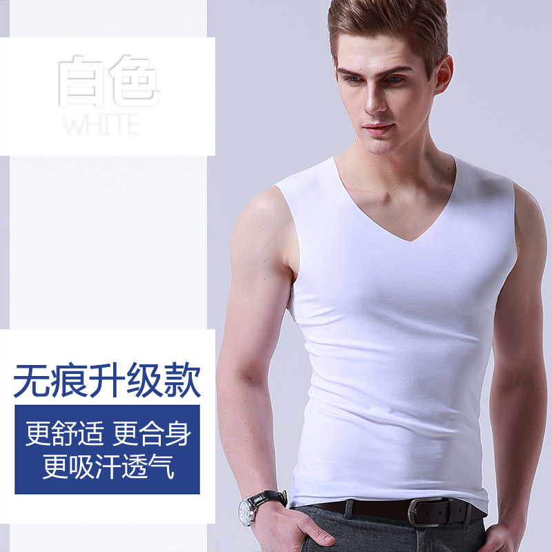 男士冰丝无痕背心白色夏季紧身宽肩V领运动无袖打底薄款