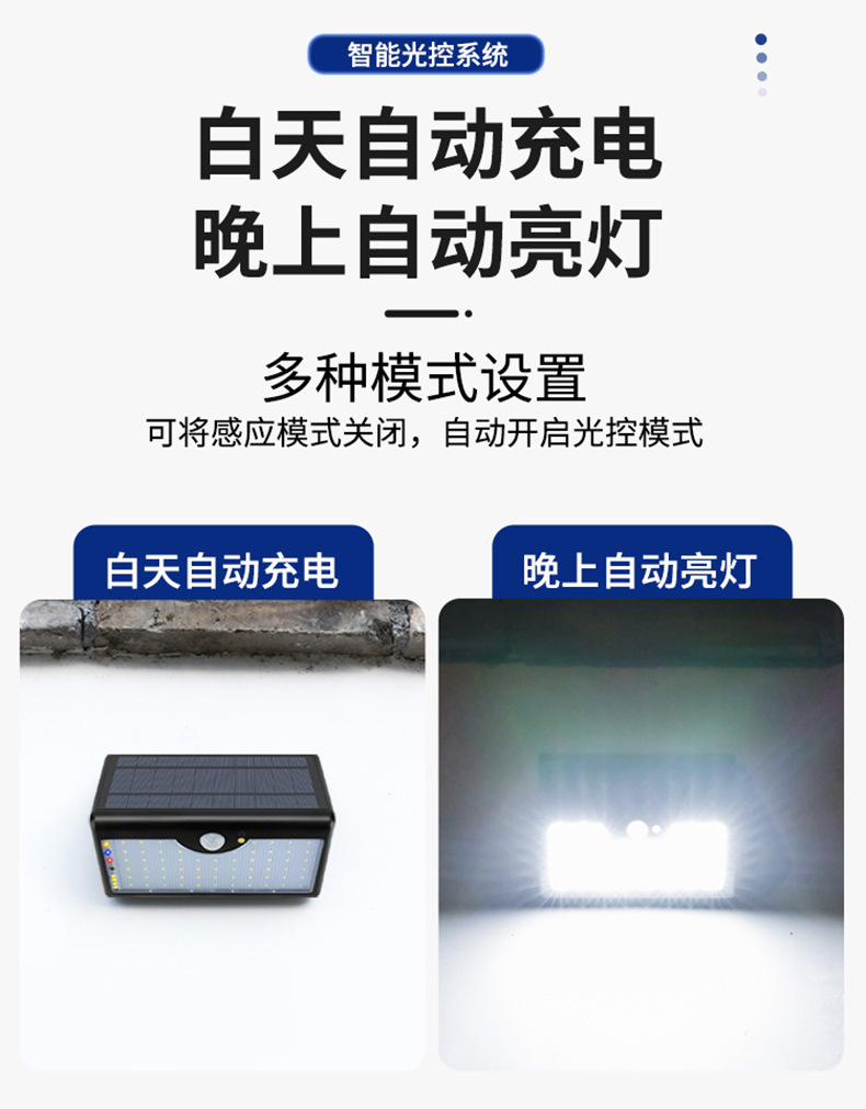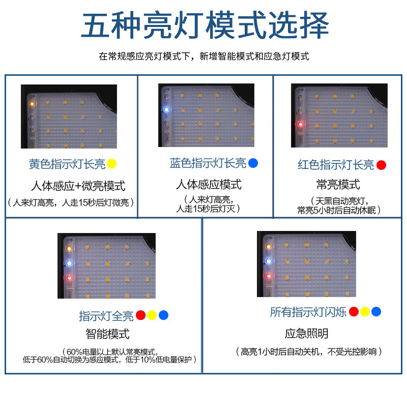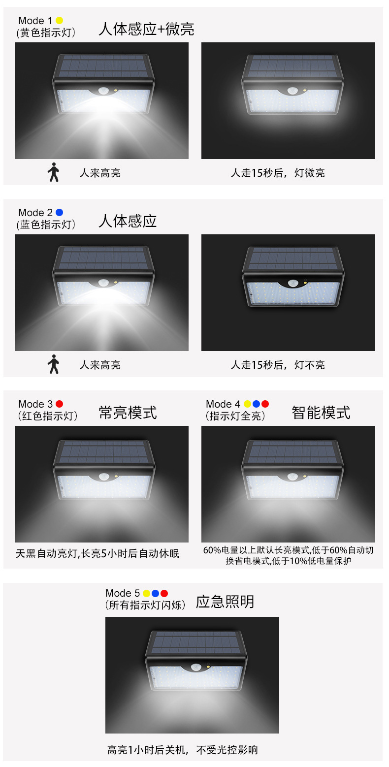 亮灯模式:1,人体感应+微亮模式 2,人体感应+灭灯 3,常亮模式 4,智能模式 5,应急灯模式