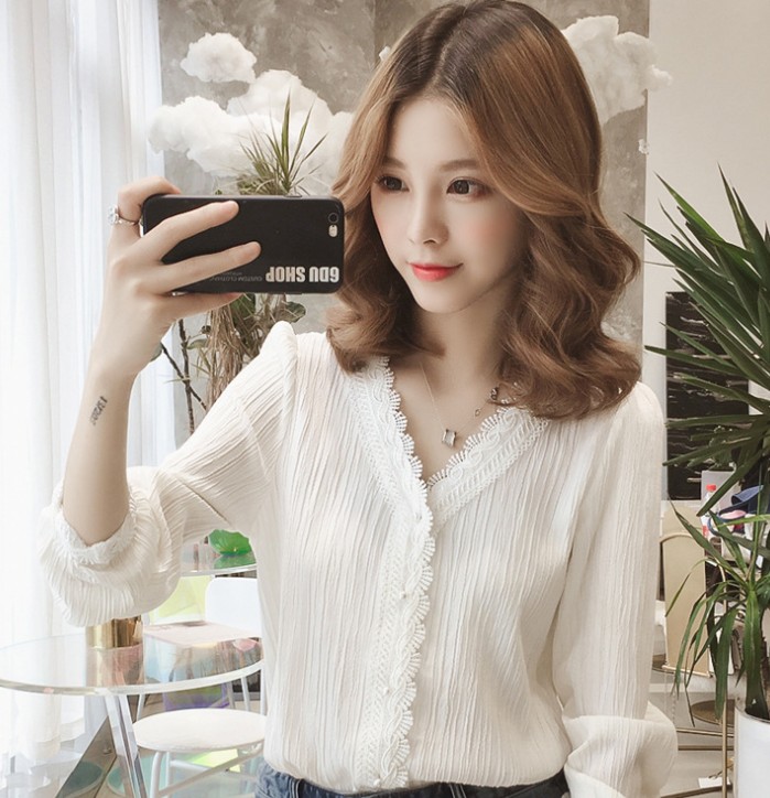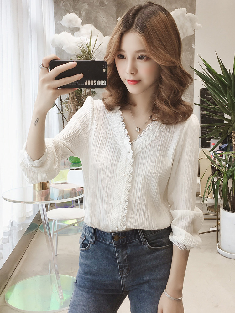 雪纺衬衫女春装韩版V领上衣长袖洋气设计感小众白色衬衣