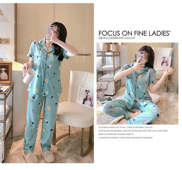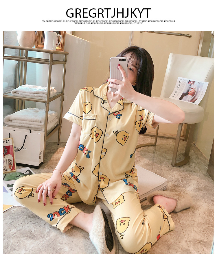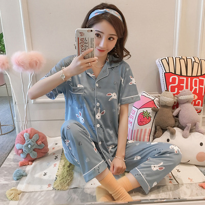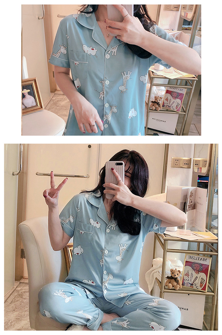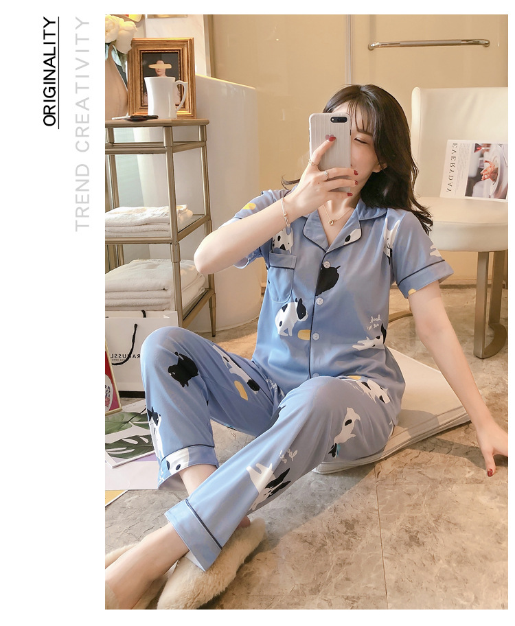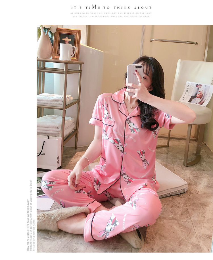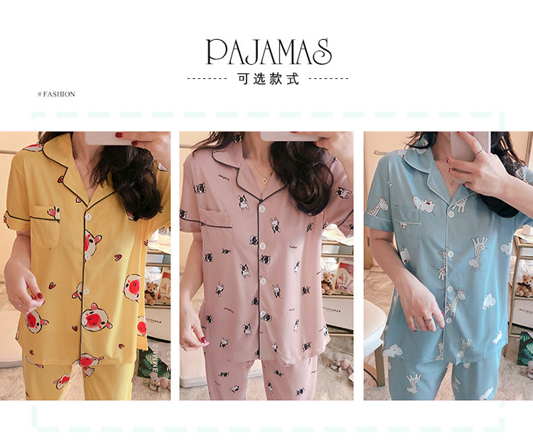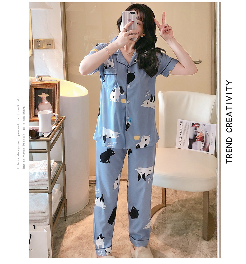夏季短袖长裤开衫睡衣女士薄款牛奶丝卡通可爱翻领套装外贸家居服