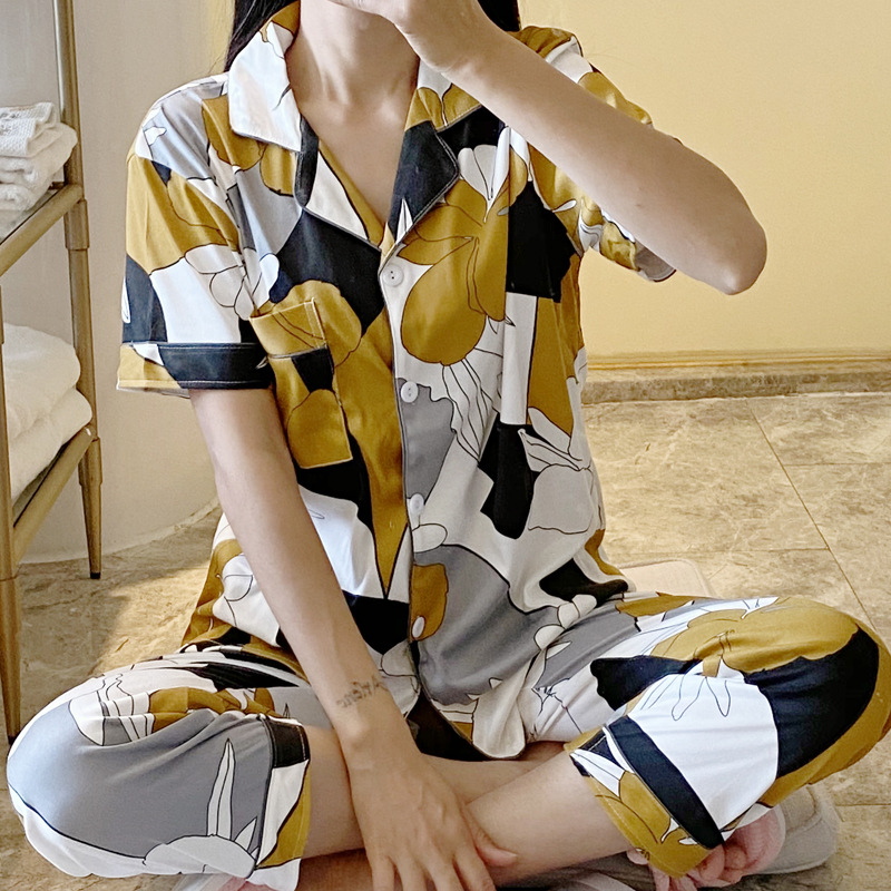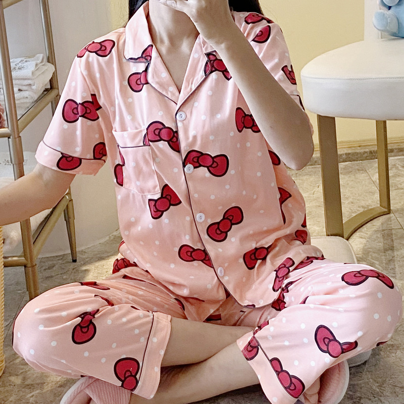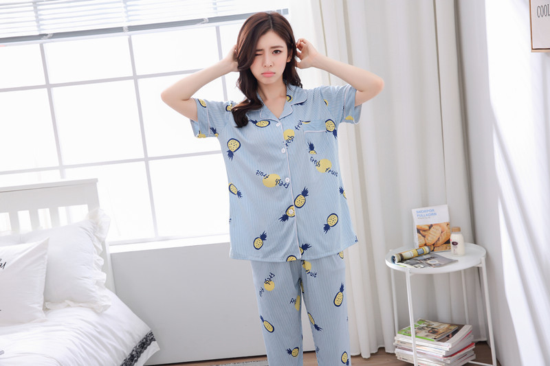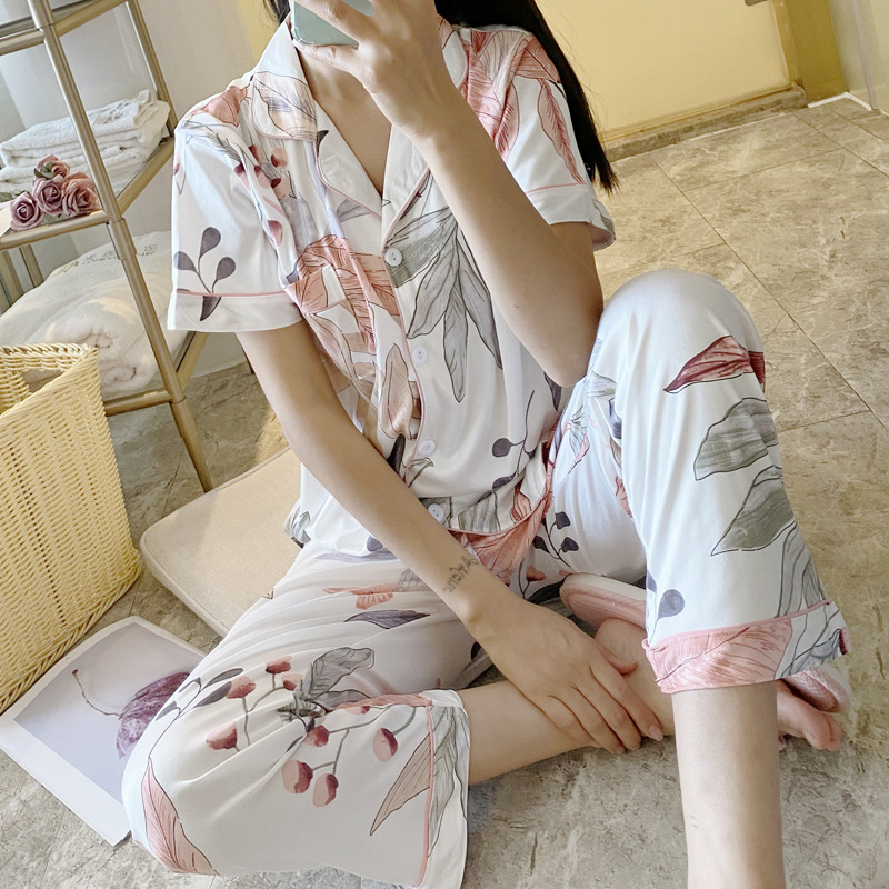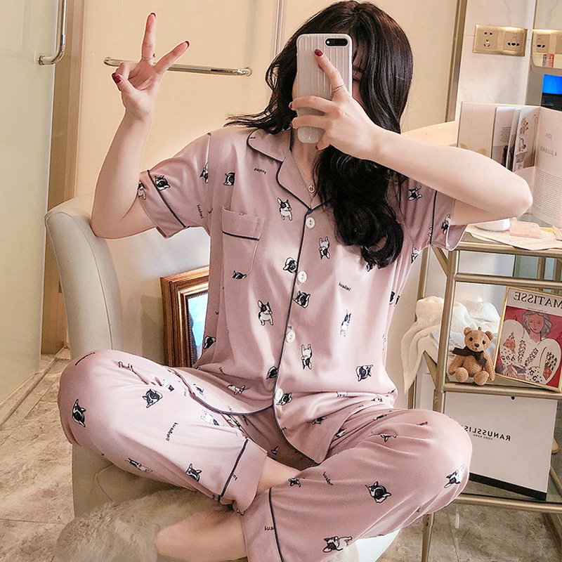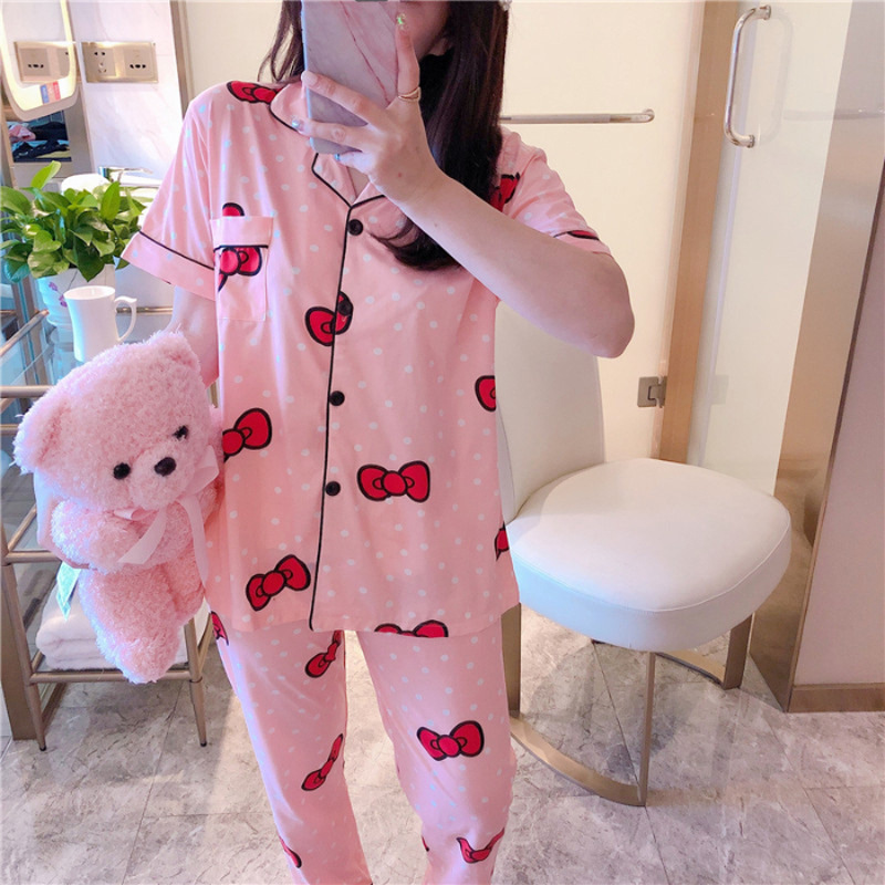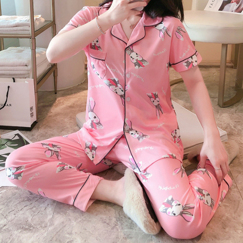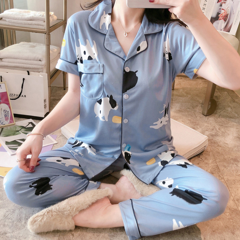 夏季短袖长裤开衫睡衣女士薄款牛奶丝卡通可爱翻领套装外贸家居服