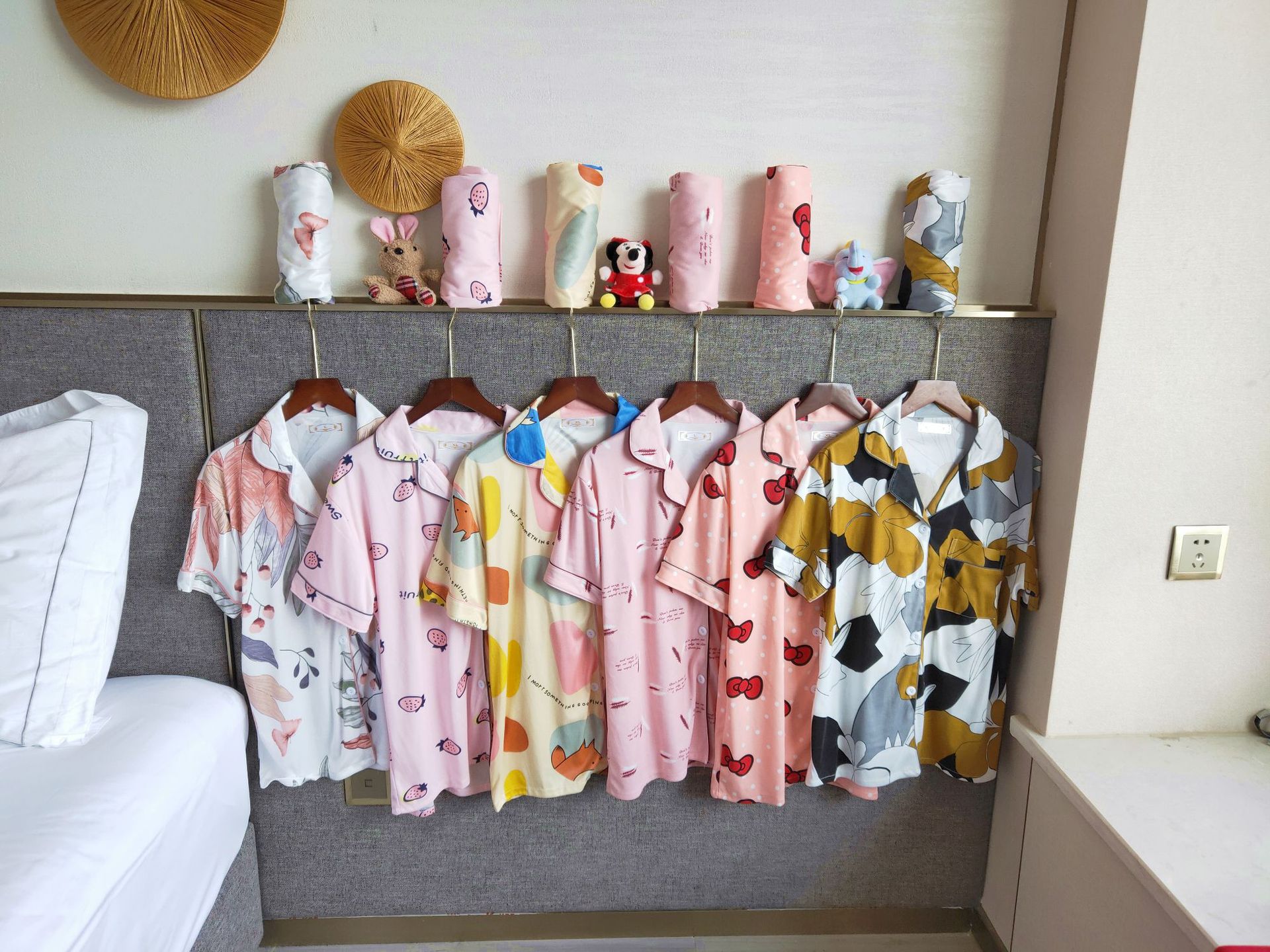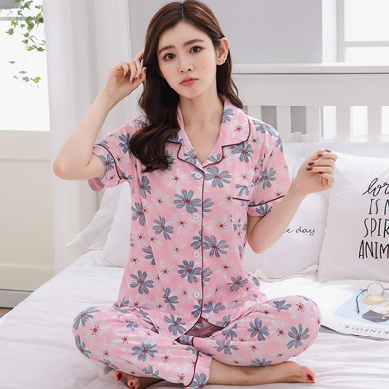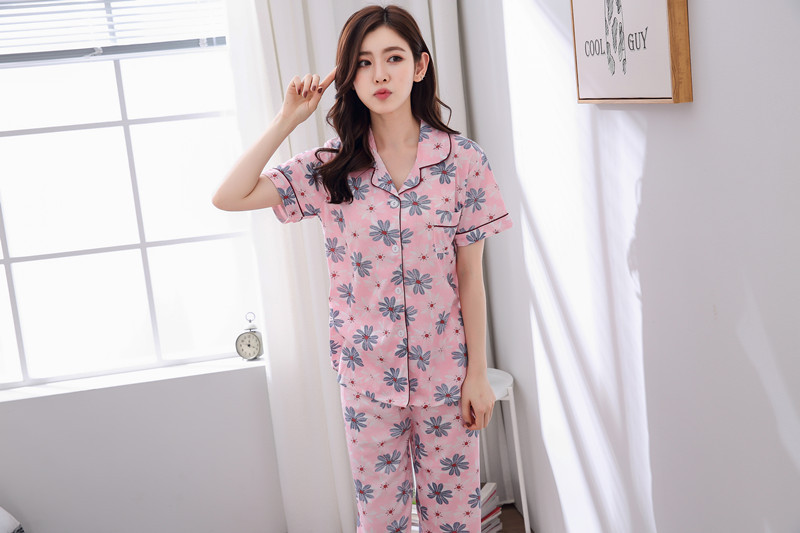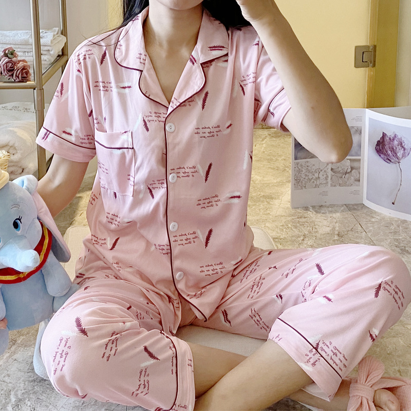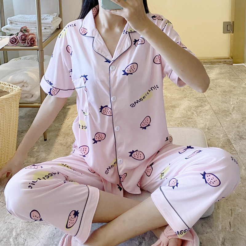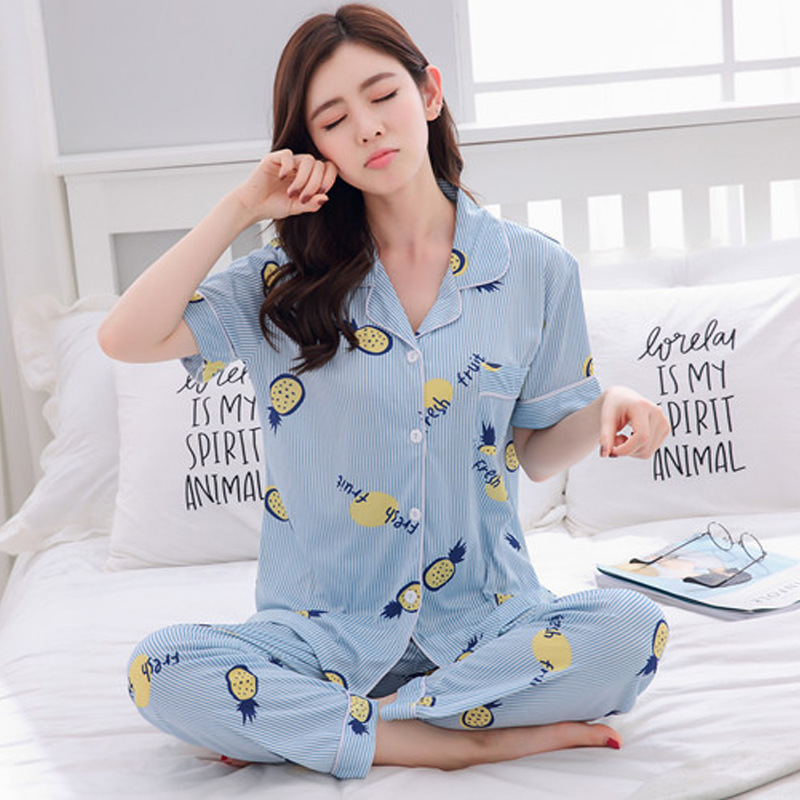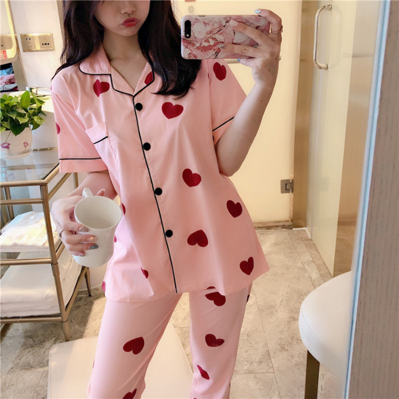 夏季短袖长裤开衫睡衣女士薄款牛奶丝卡通可爱翻领套装外贸家居服