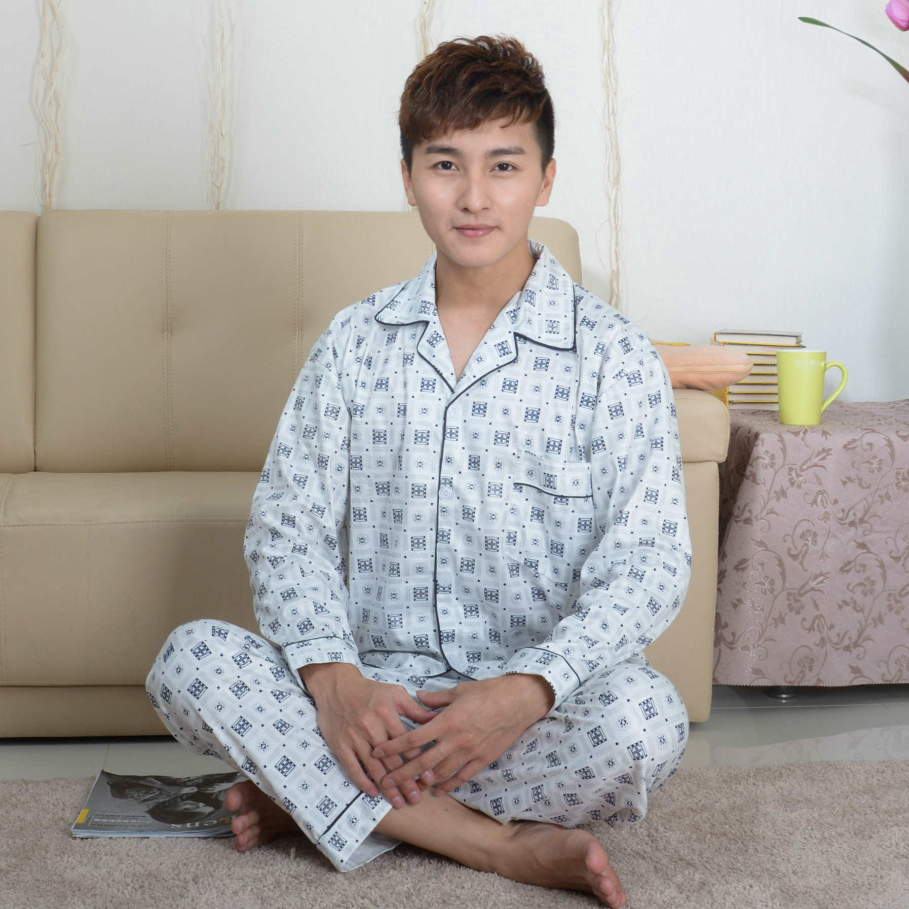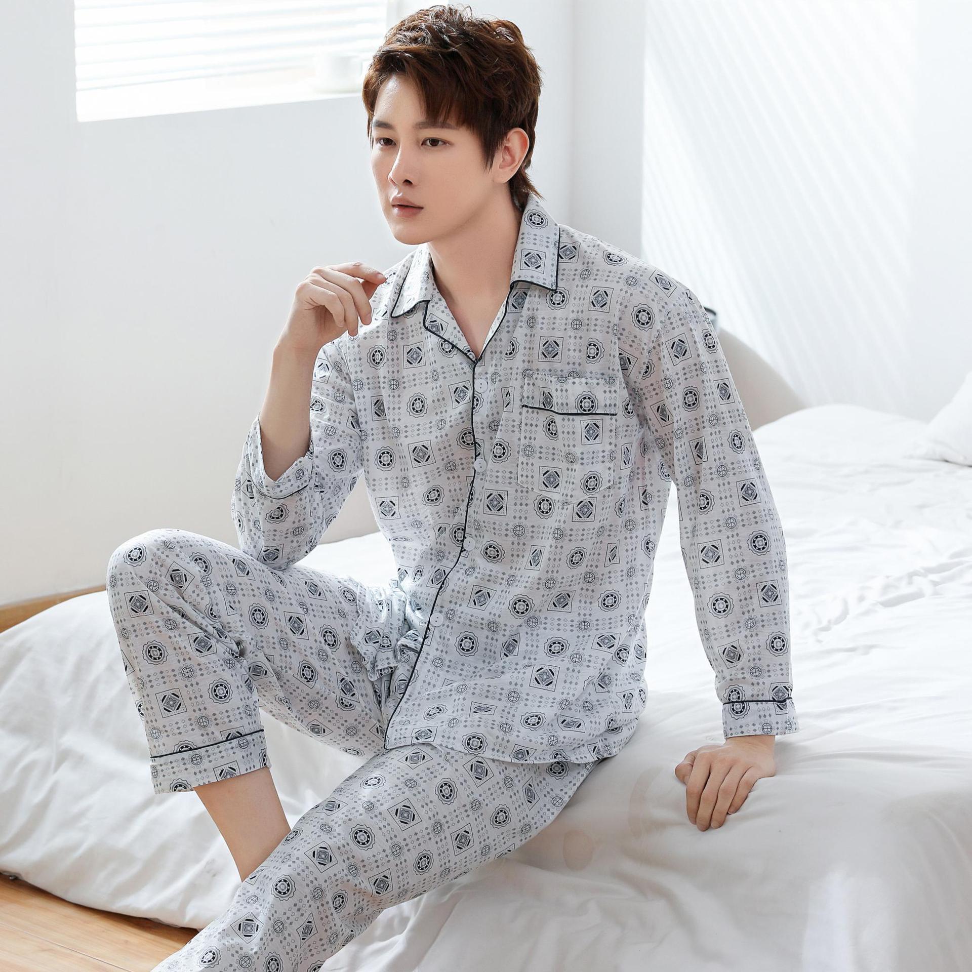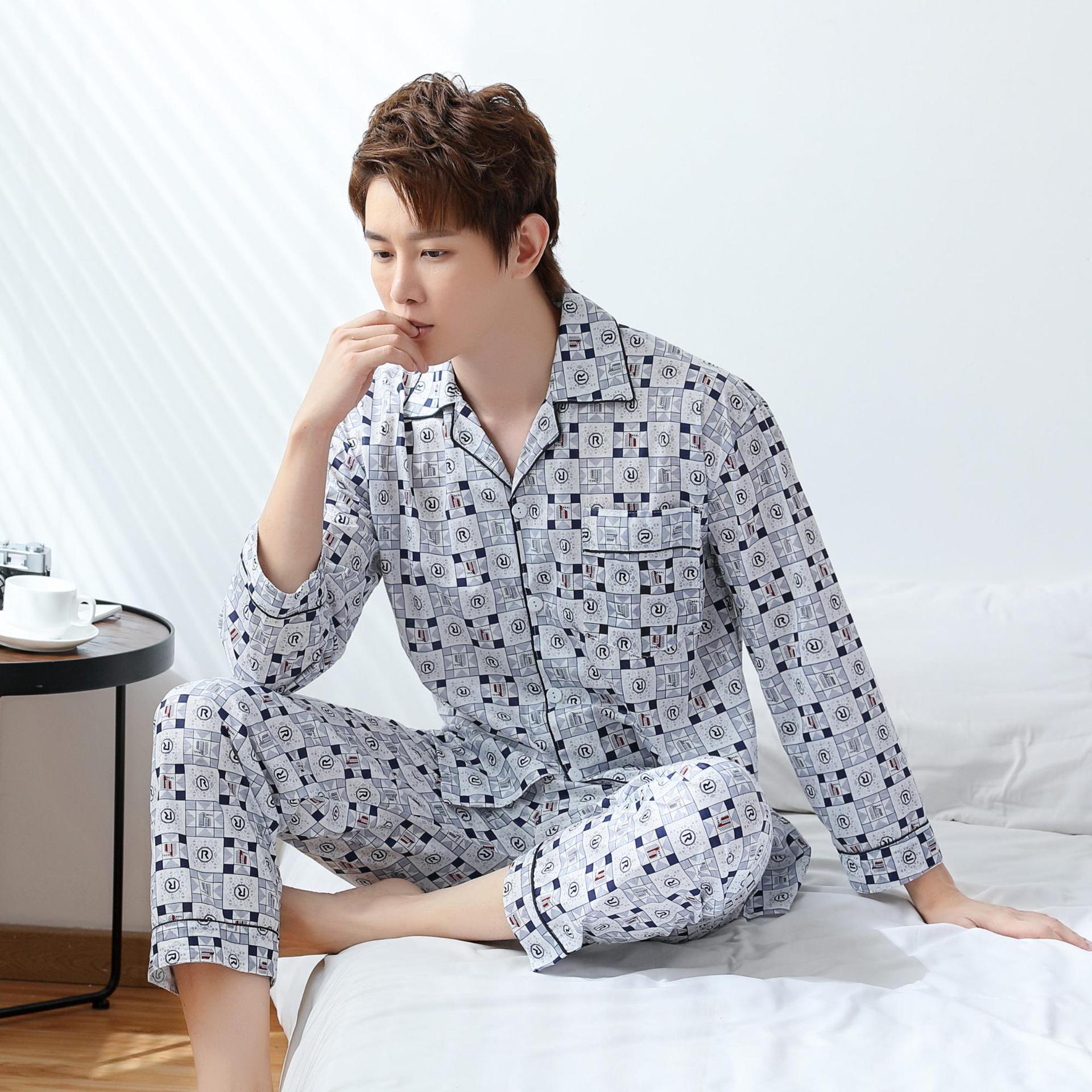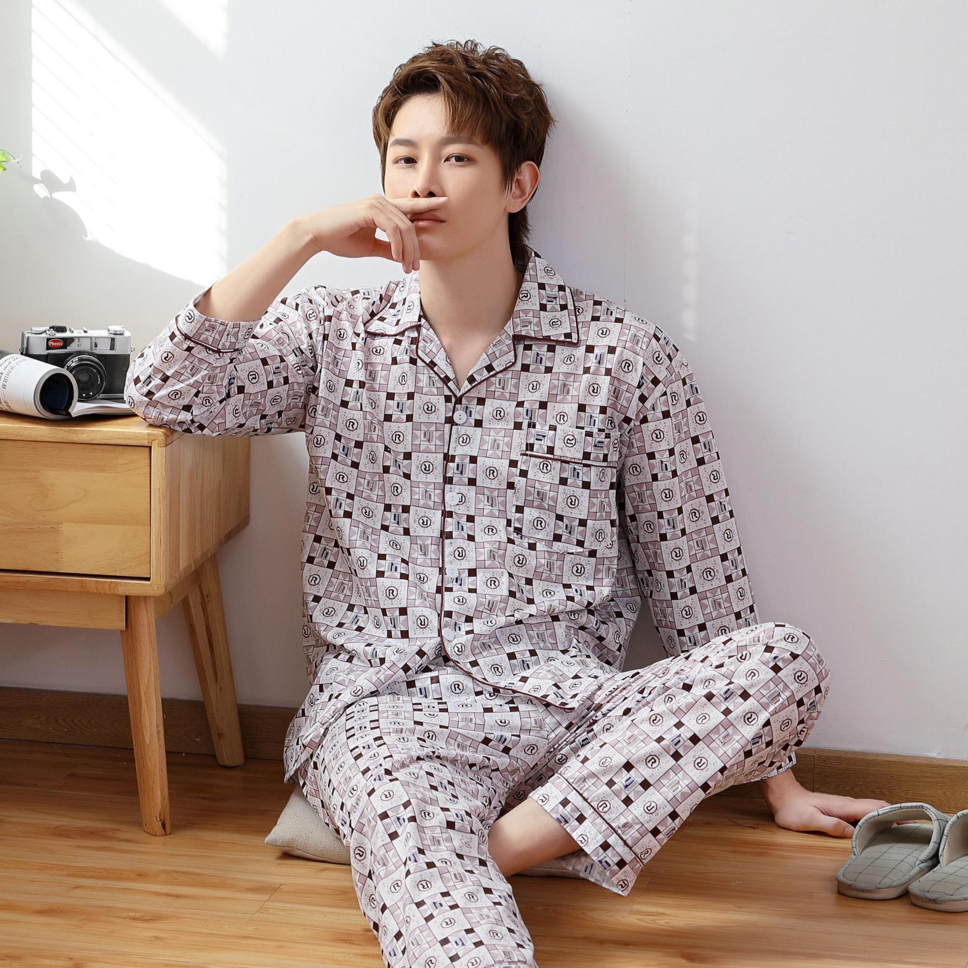 新品睡衣男士春秋冬季新款长袖长裤开衫翻领套装针织棉休闲家居服